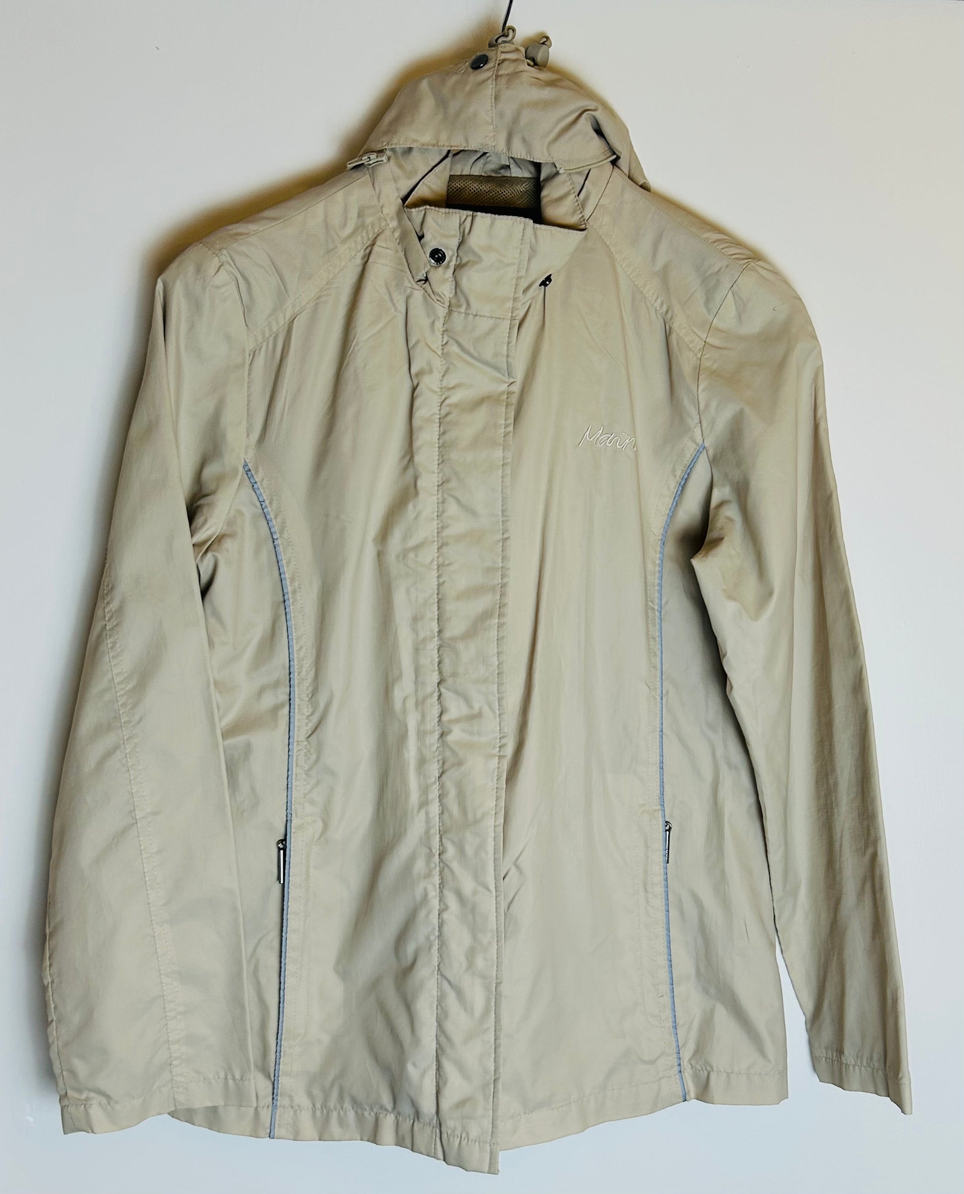 Beige shower proof jacket with detachable hood and storage pouch