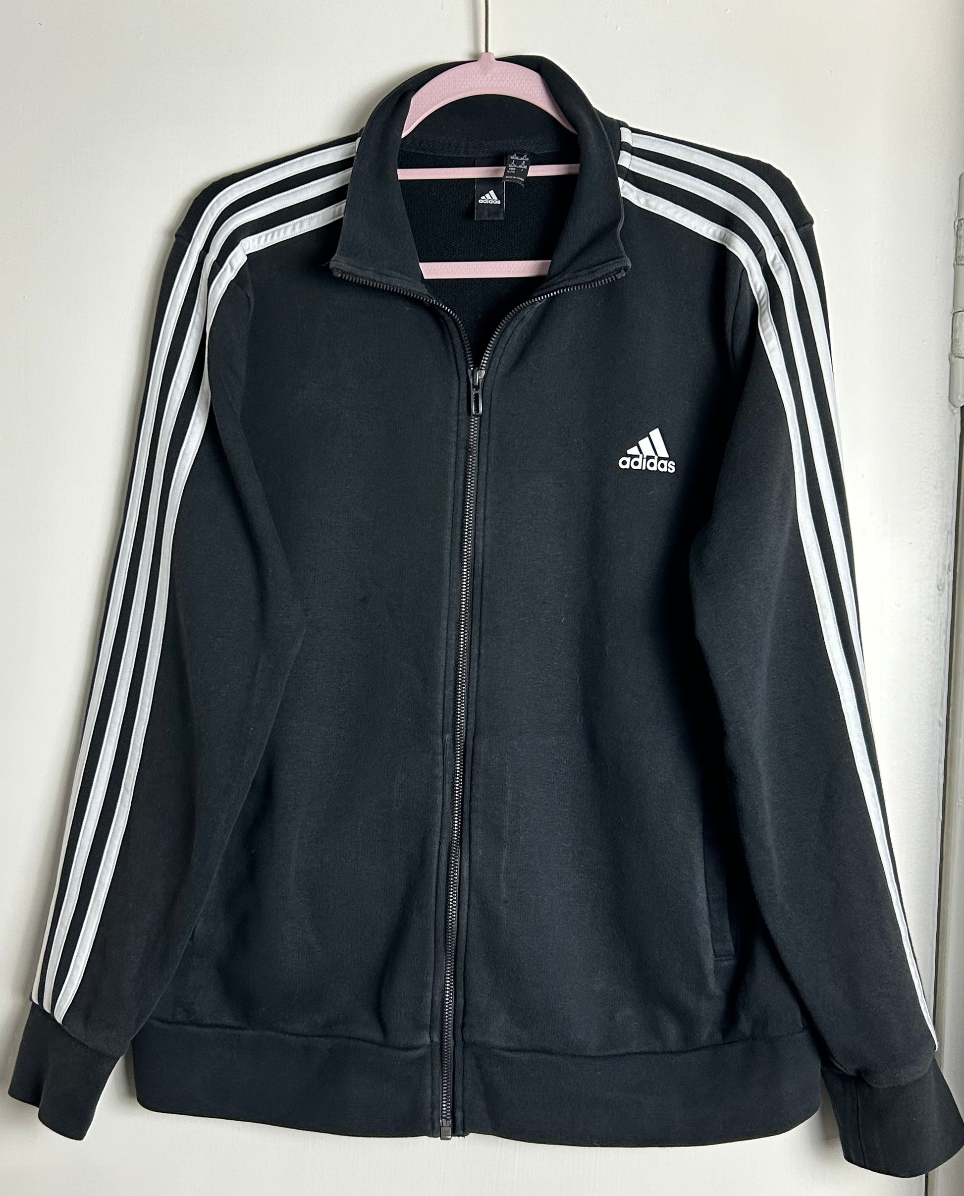 Black Adidas zip front sweatshirt. Long sleeves with adidas stripe. High neck, full zip front, two side pockets.