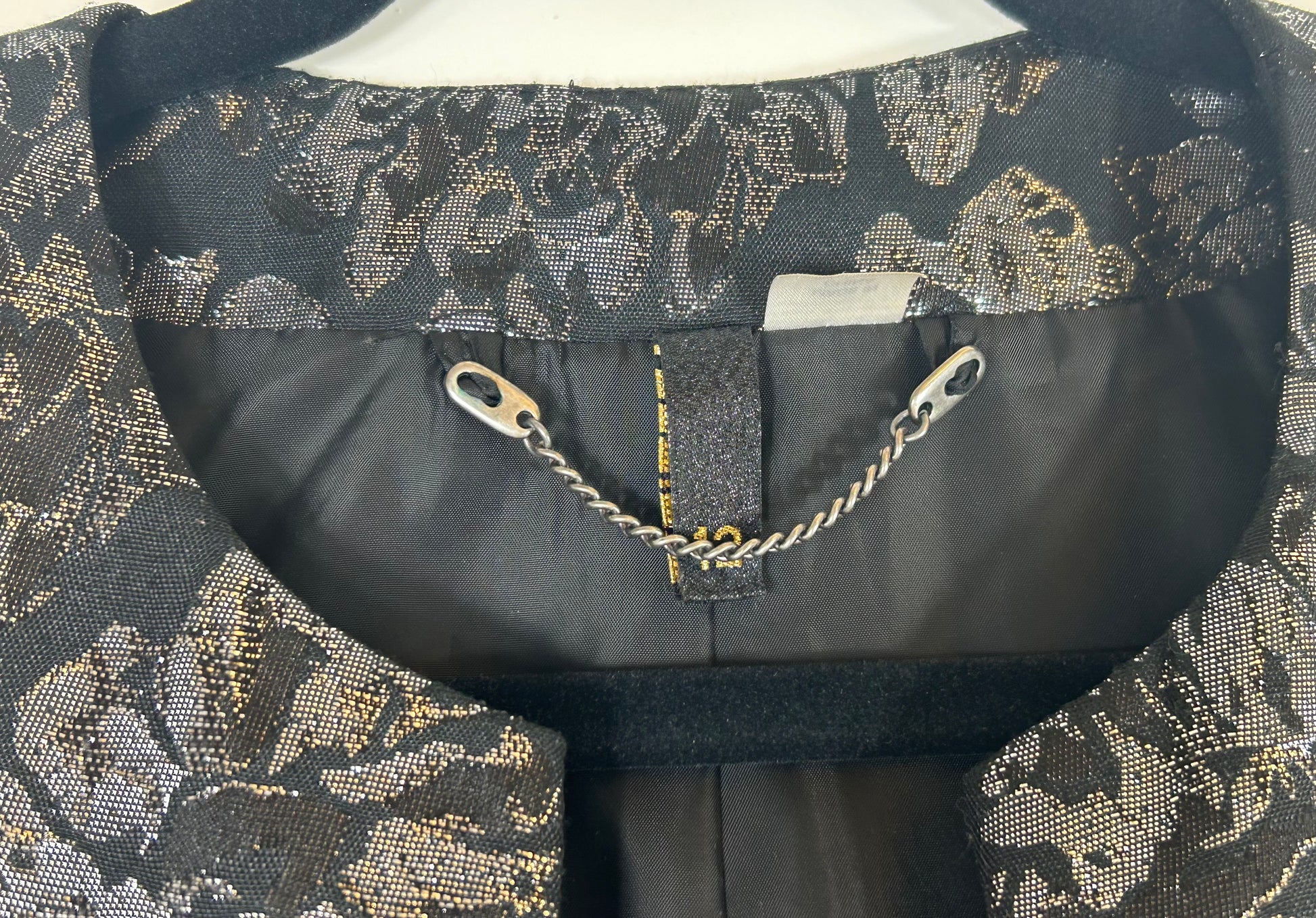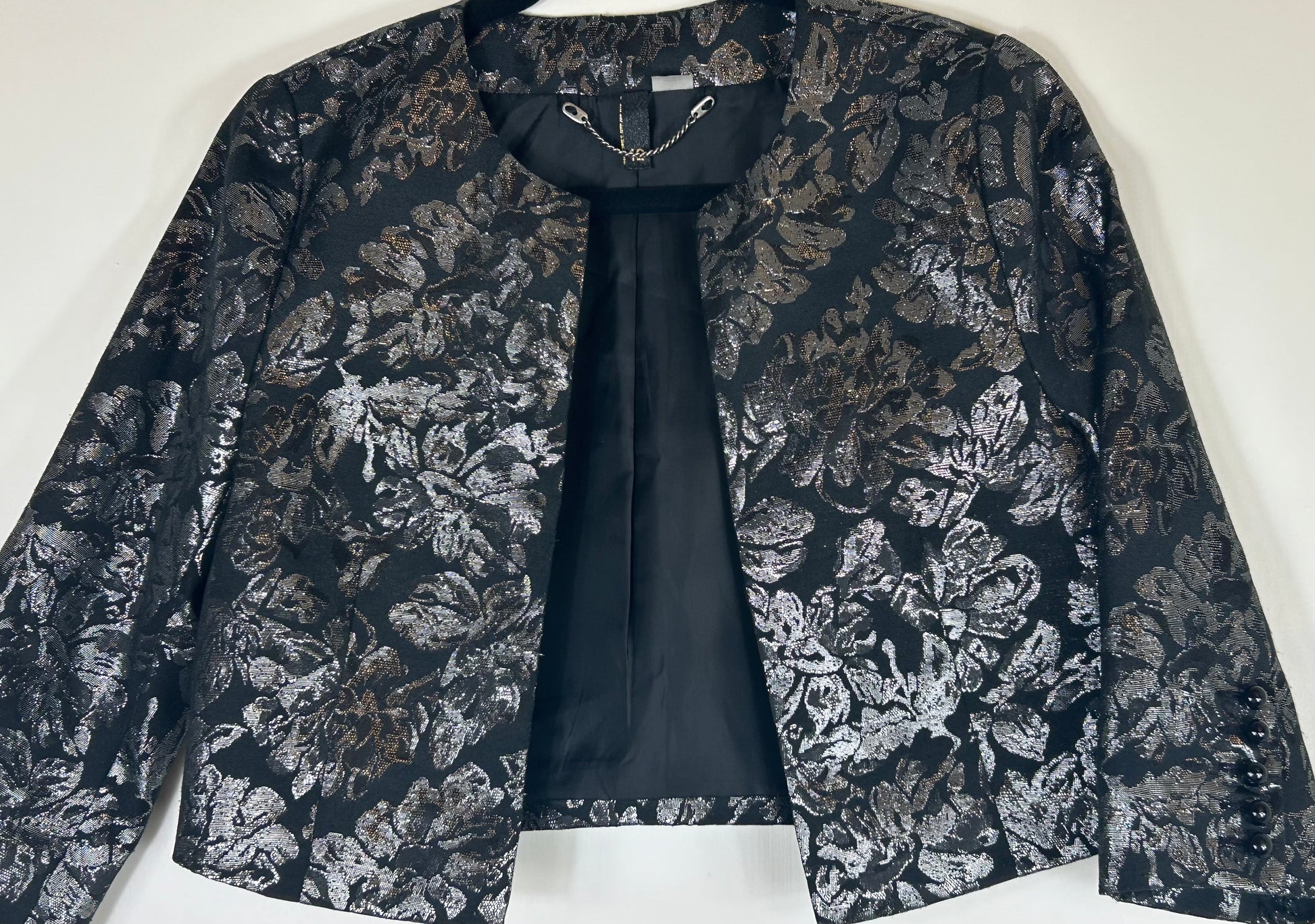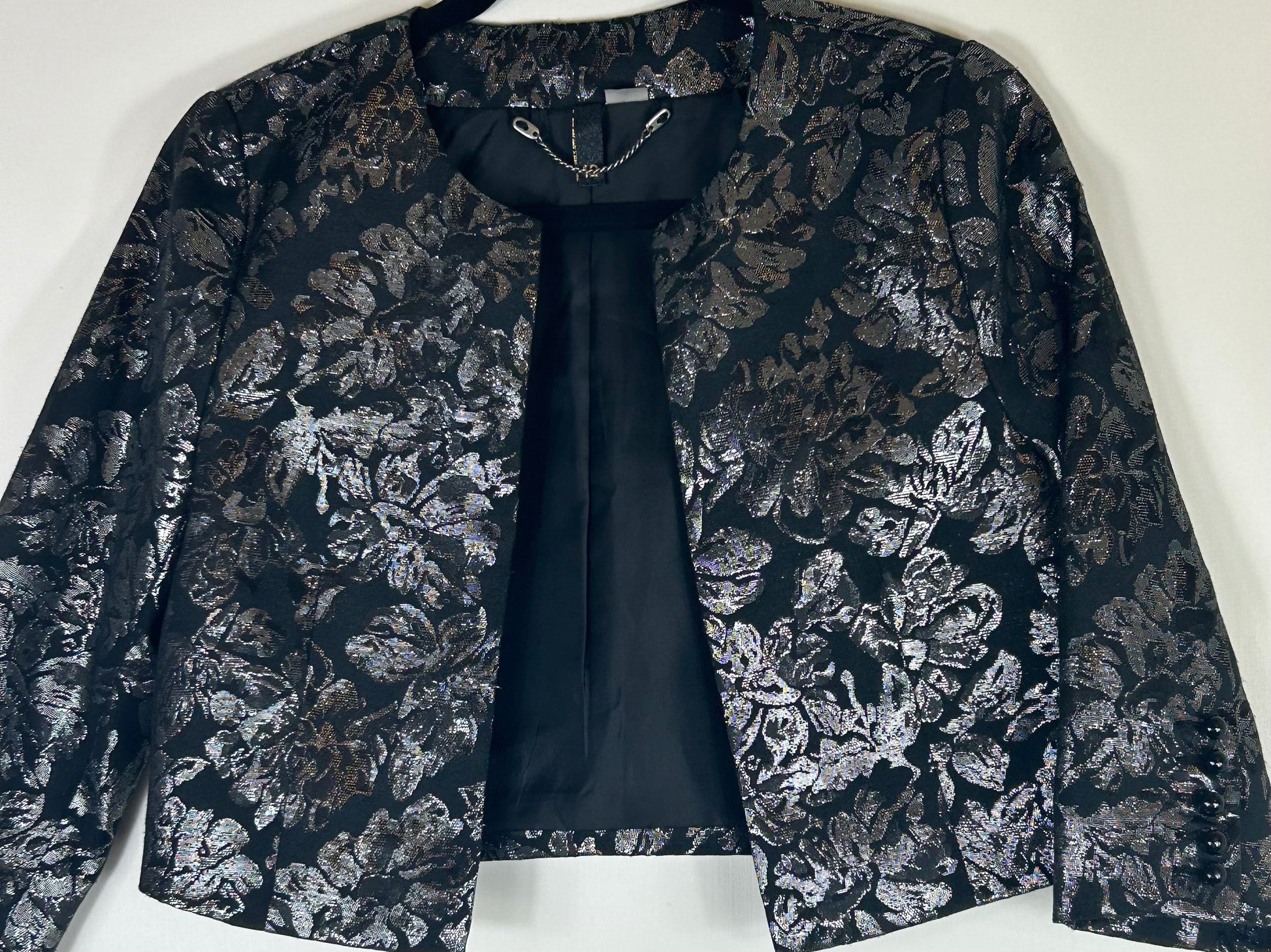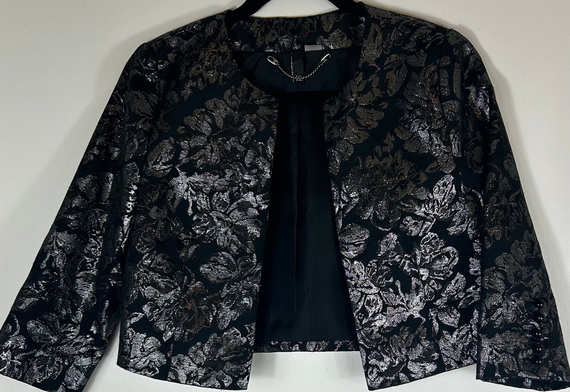 Black Evening Jacket with silver floral pattern. 3/4 sleeves, fully lined