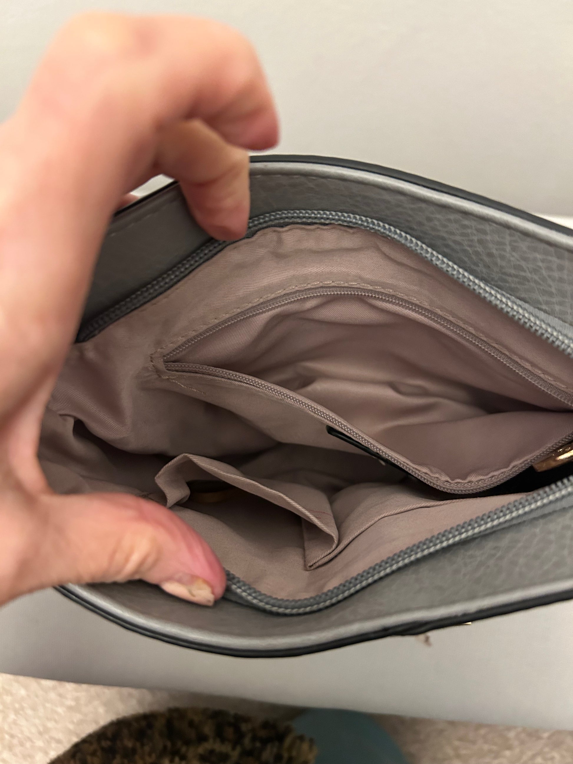 Black & Grey Superbia of Italy Small Bucket Bag. Zip fastening. Three inside pockets. Zipped pocket on back. Pocket on front with gold motif. Crossbody adjustable strap