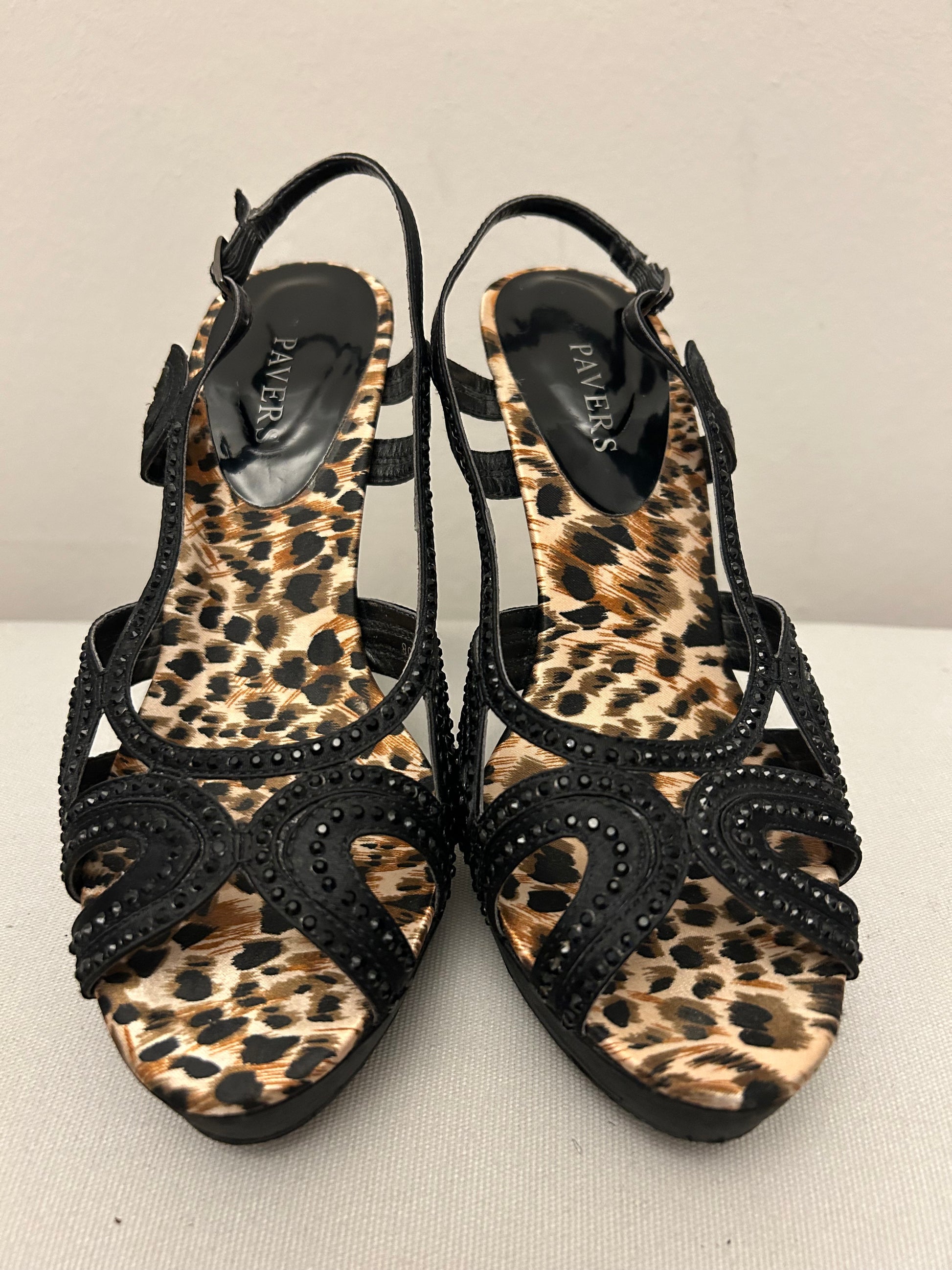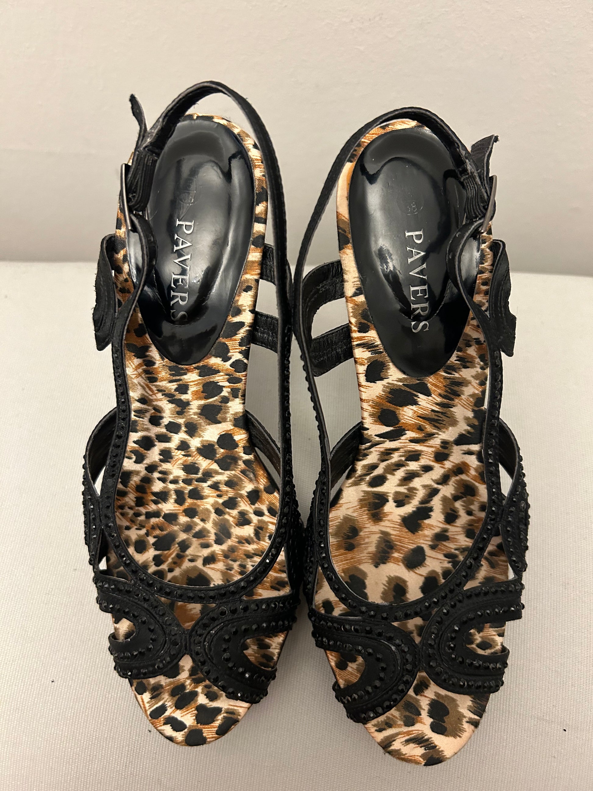 Black Pavers Strappy Sandals. Strappy stiletto sandals. Black with diamanté detail, open design and peep toe. Animal print internal sole