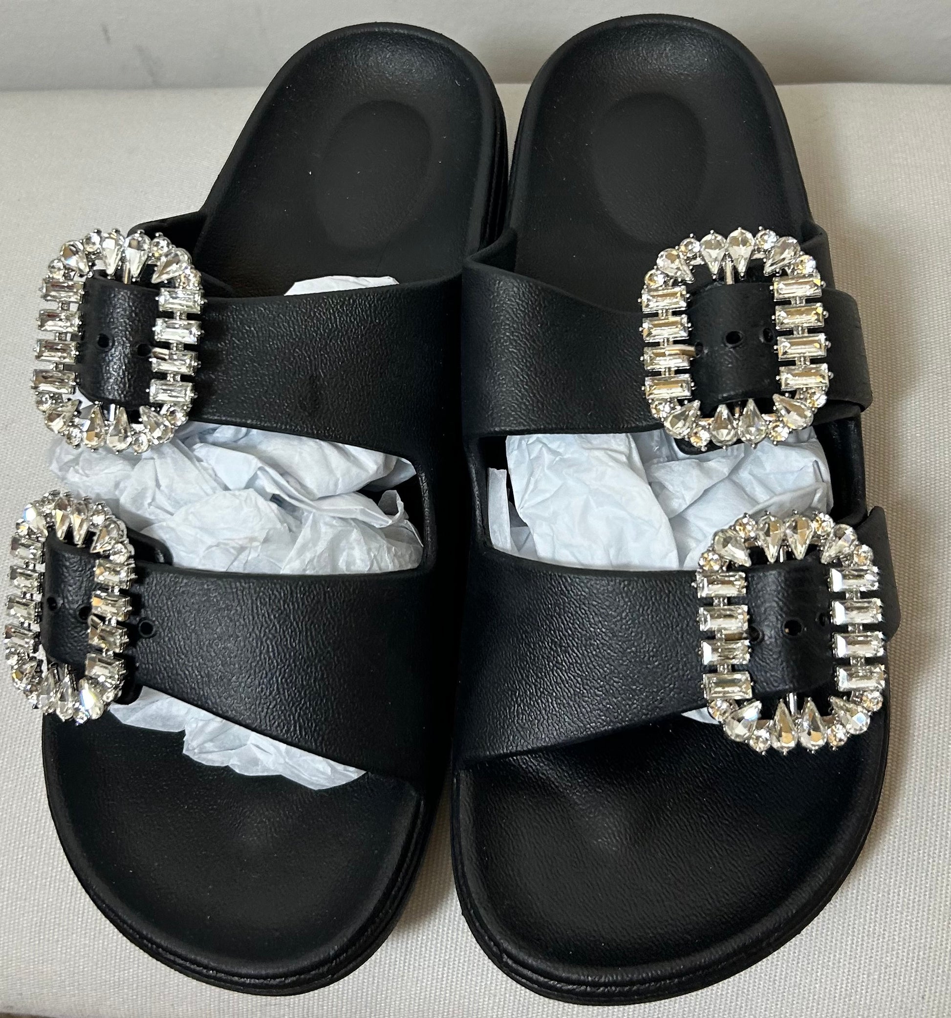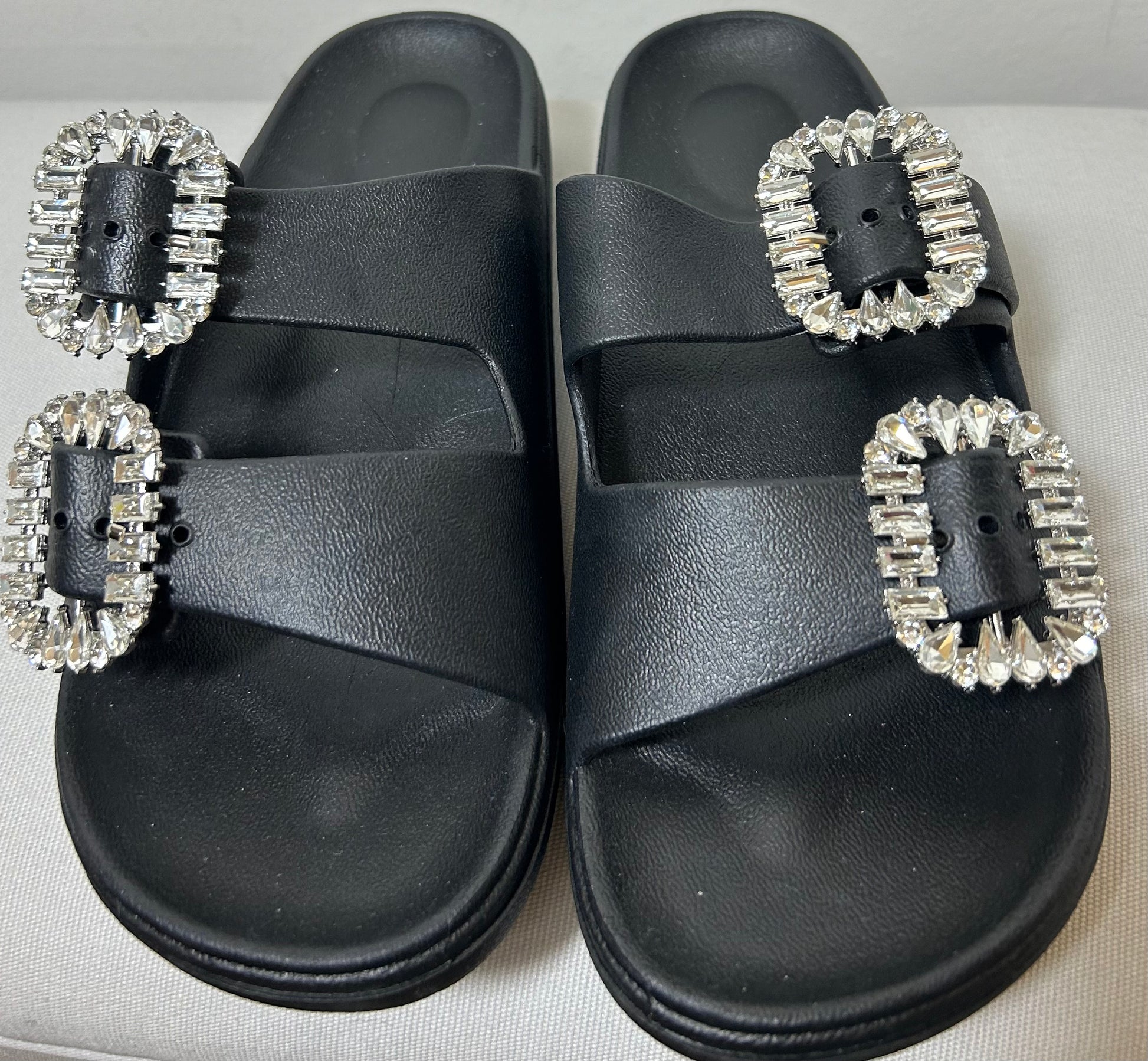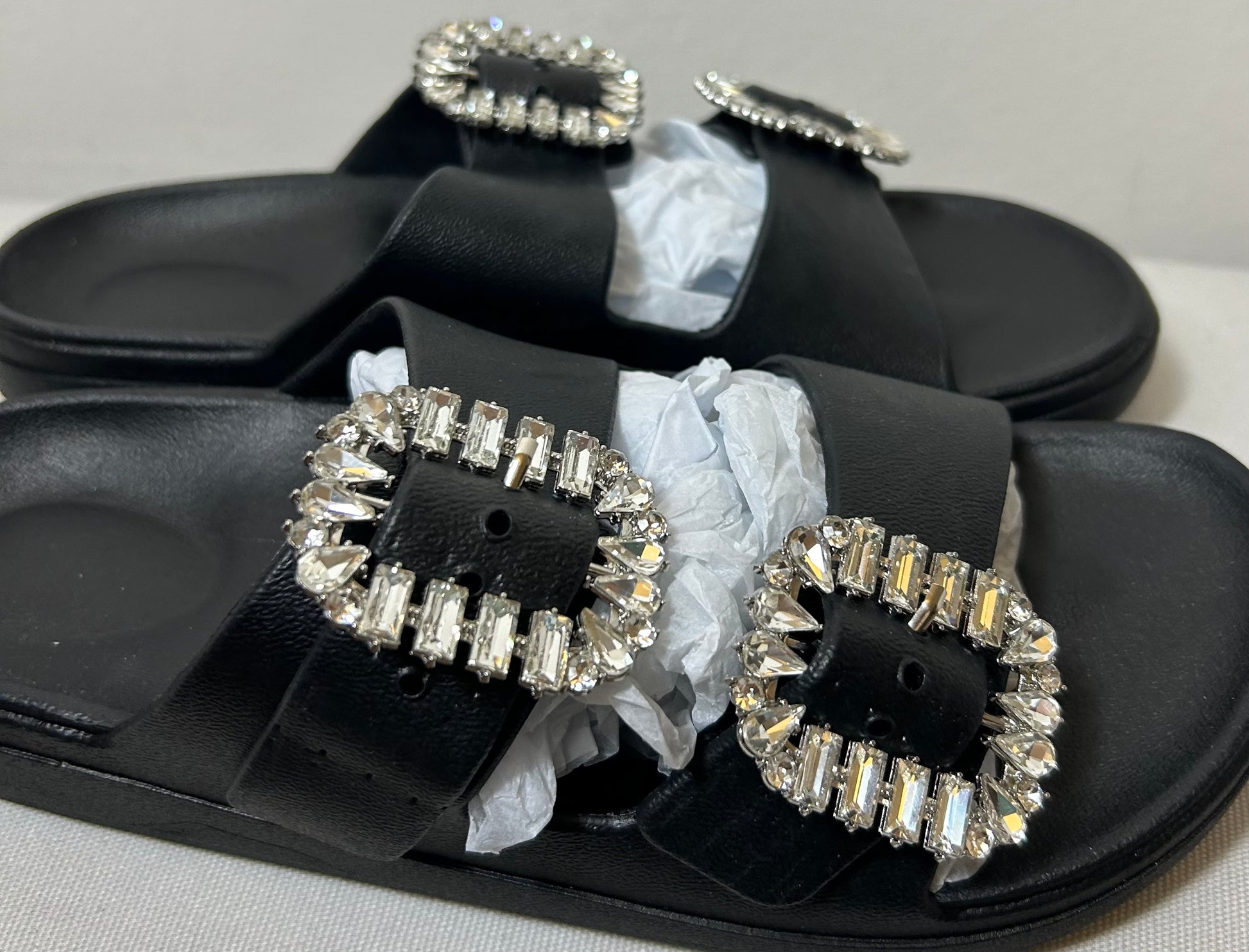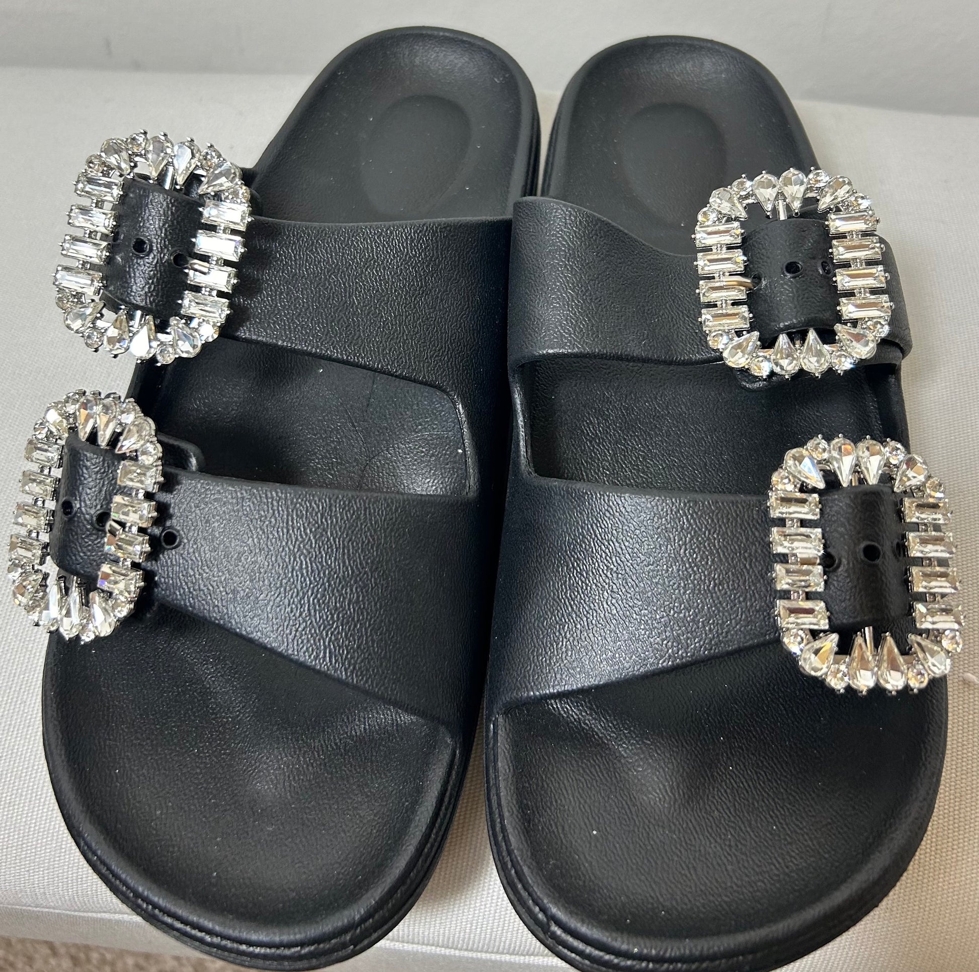 Black Sandals With Two wide strap on front with large silver diamanté buckles
