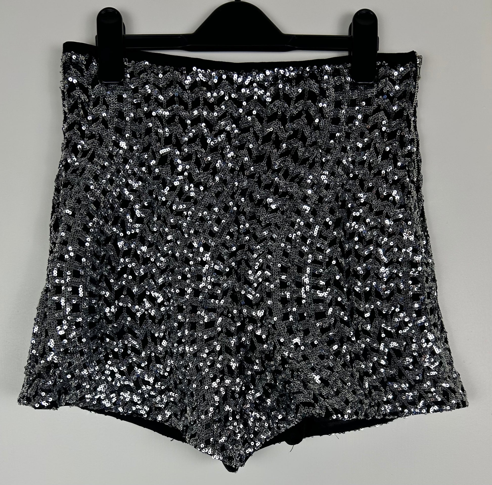 Black sequins shorts, fully lined, side zip fastening.. 98% Polyester, 2% Elastane