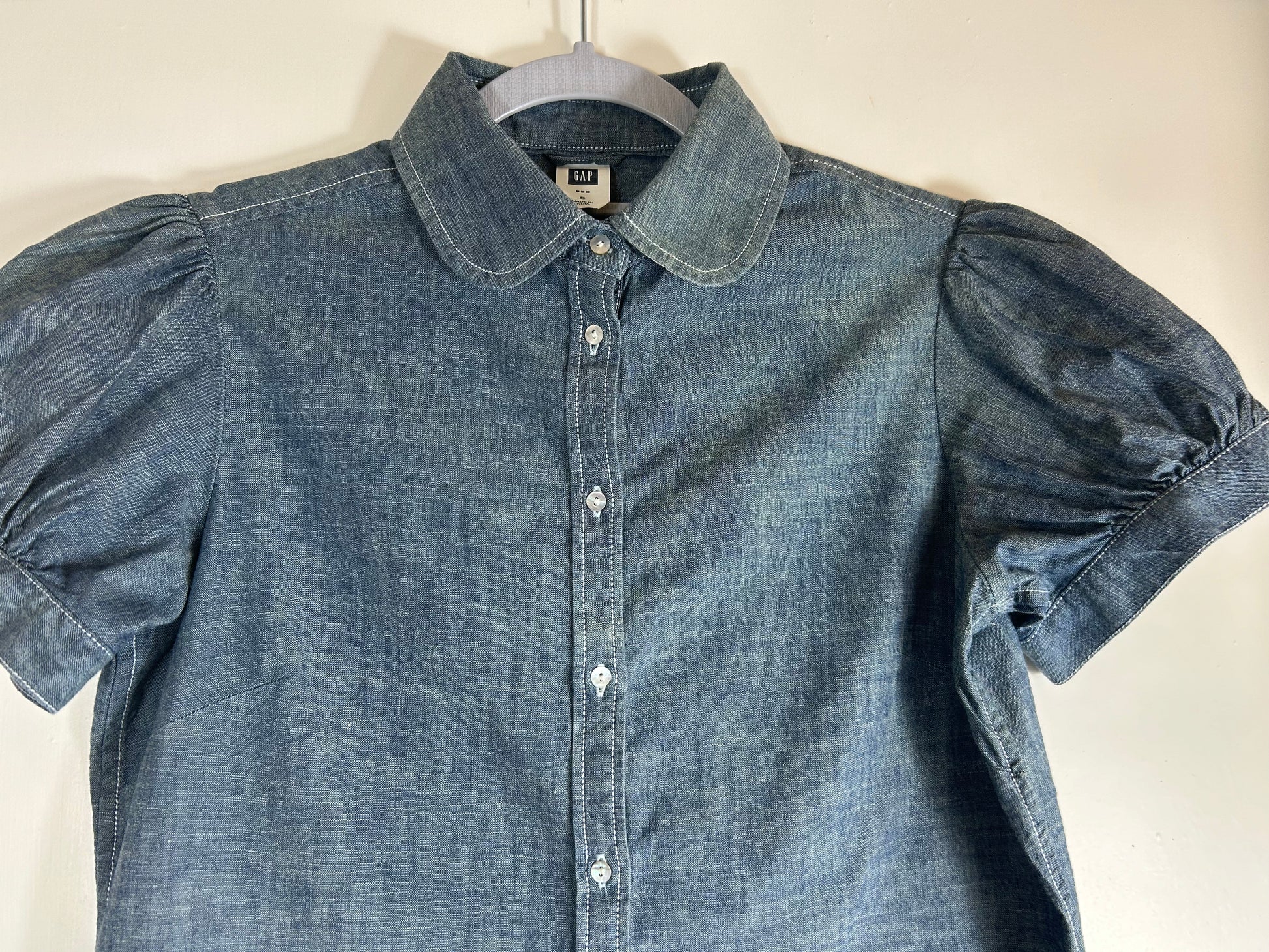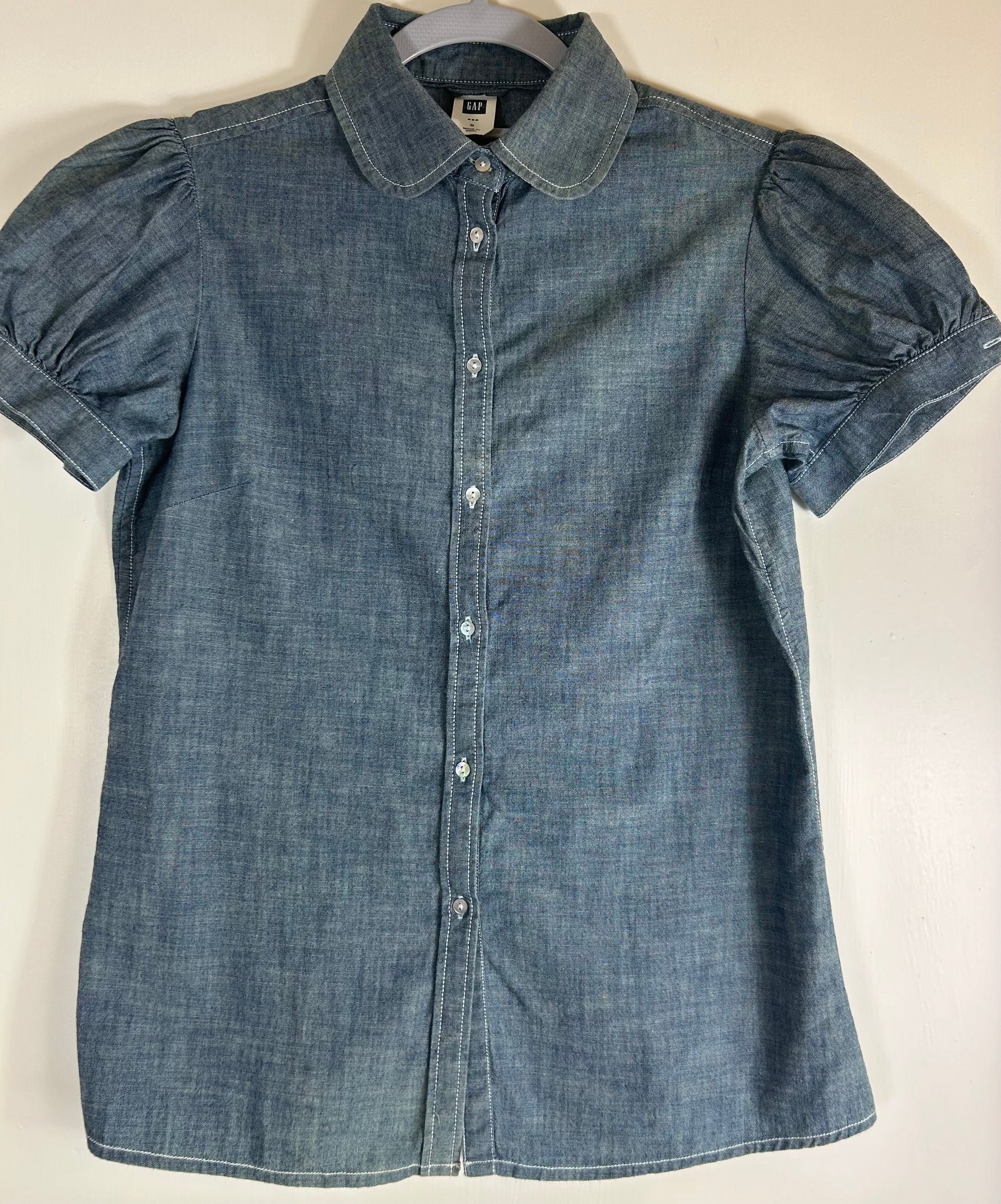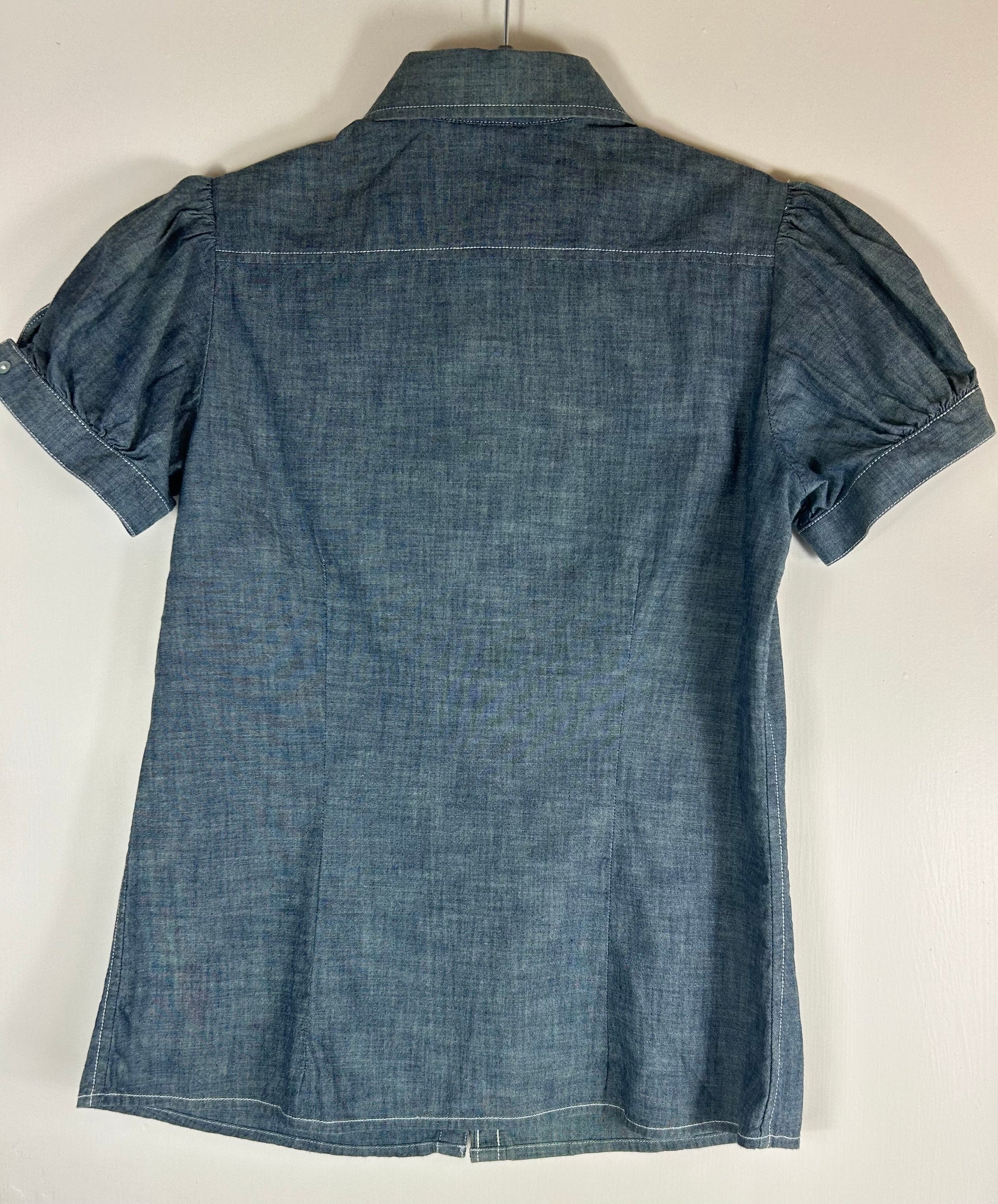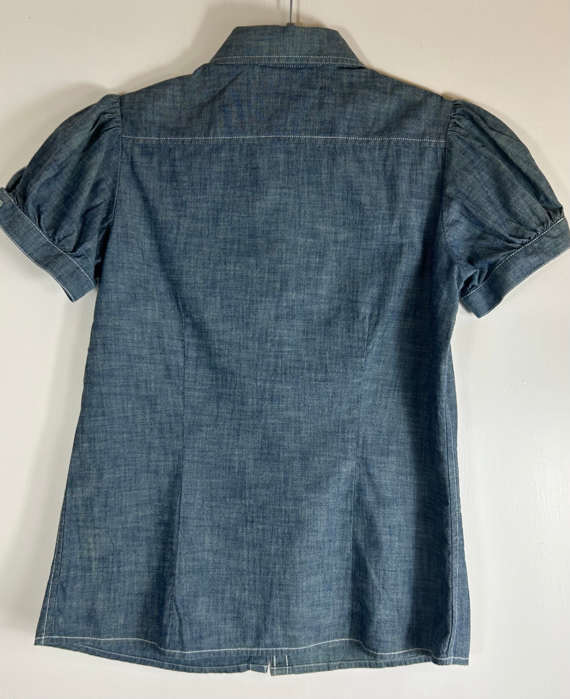 Blue Light Denim Fitted Blouse with short puff sleeves. 7 button front with Peter Pan Collar