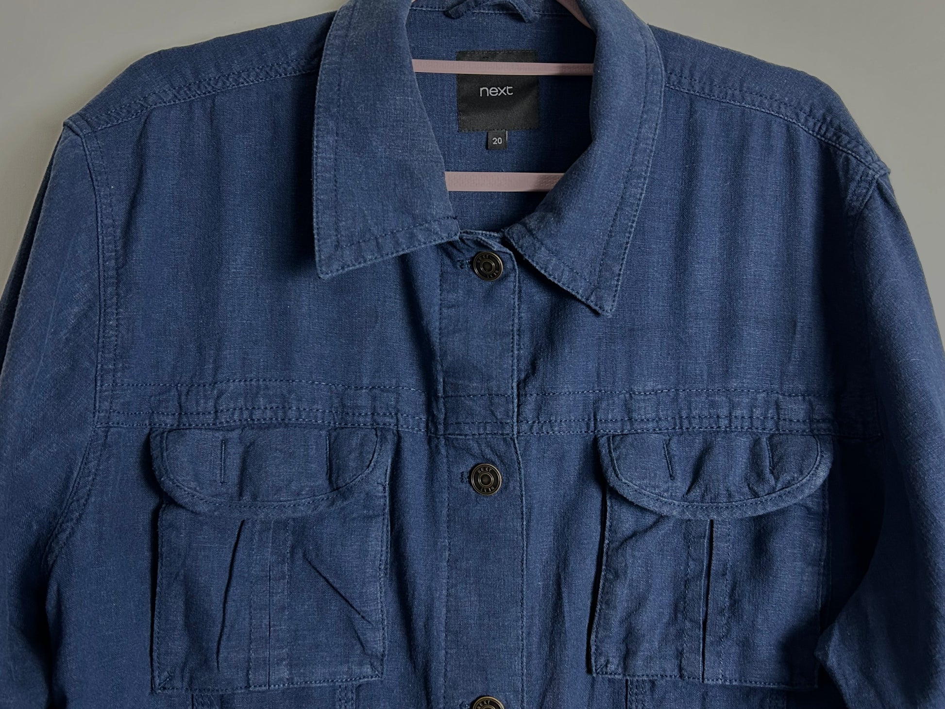 Dark blue shirt style jacket. Long sleeves, button cuffs, button front with collar. 4 pockets on front. Material 55% linen, 45% viscose