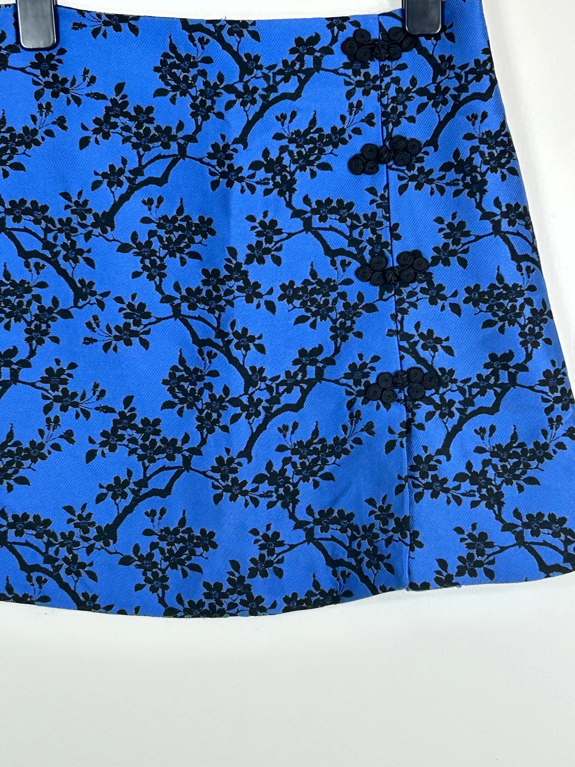 Blue Zara Short Skirt. Chinese style. Back zip fastening, front button detail. Beautiful decorated fabric