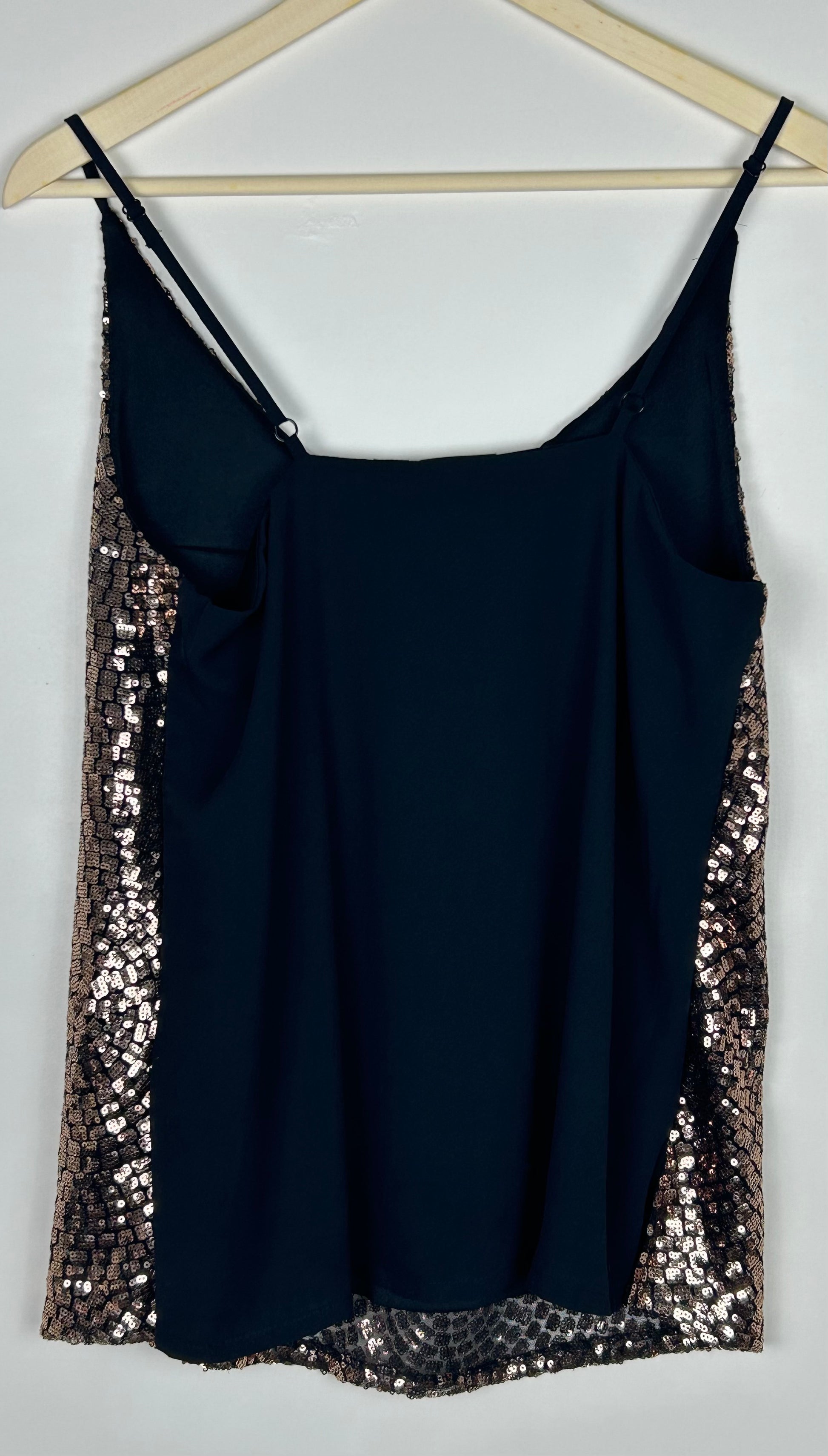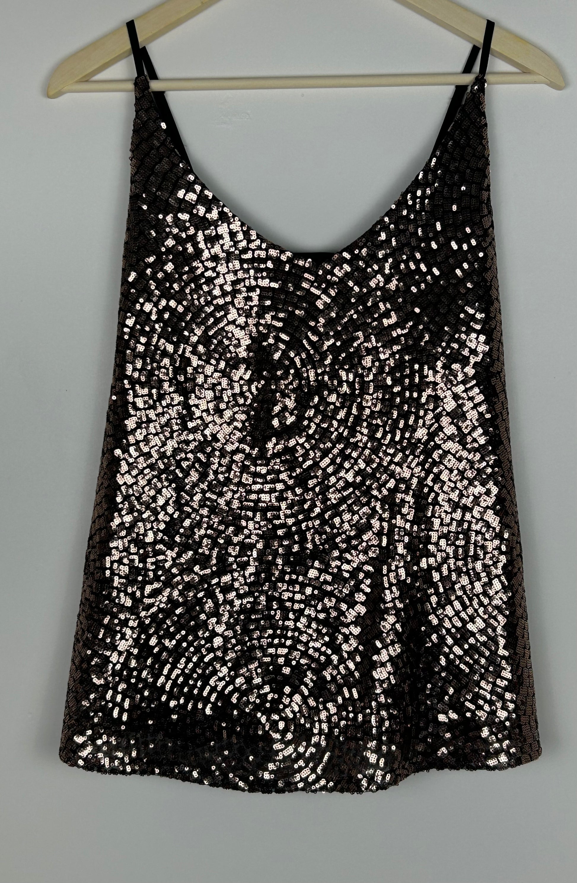 Bronze sparkly/ sequin top with adjustable strappy straps. Black knitted back