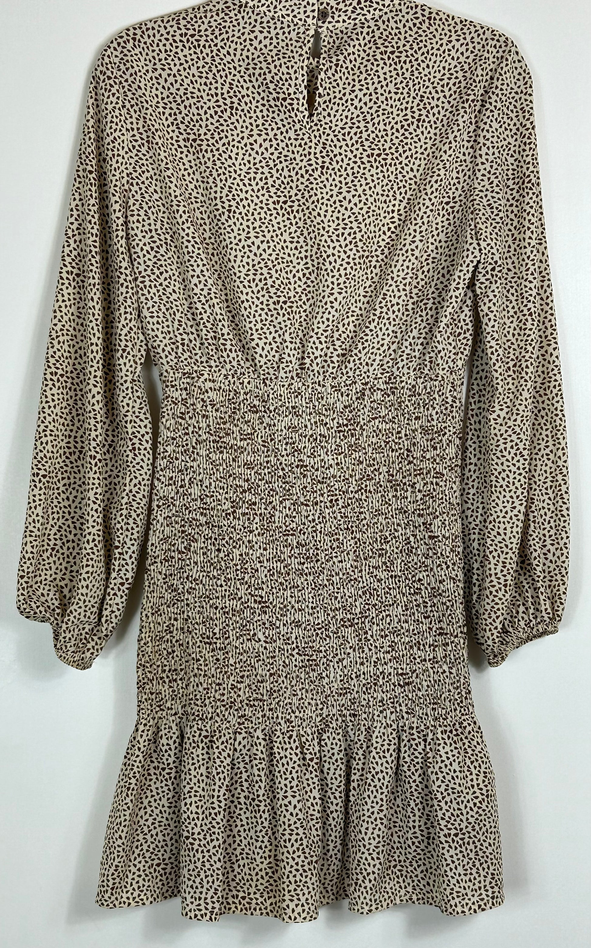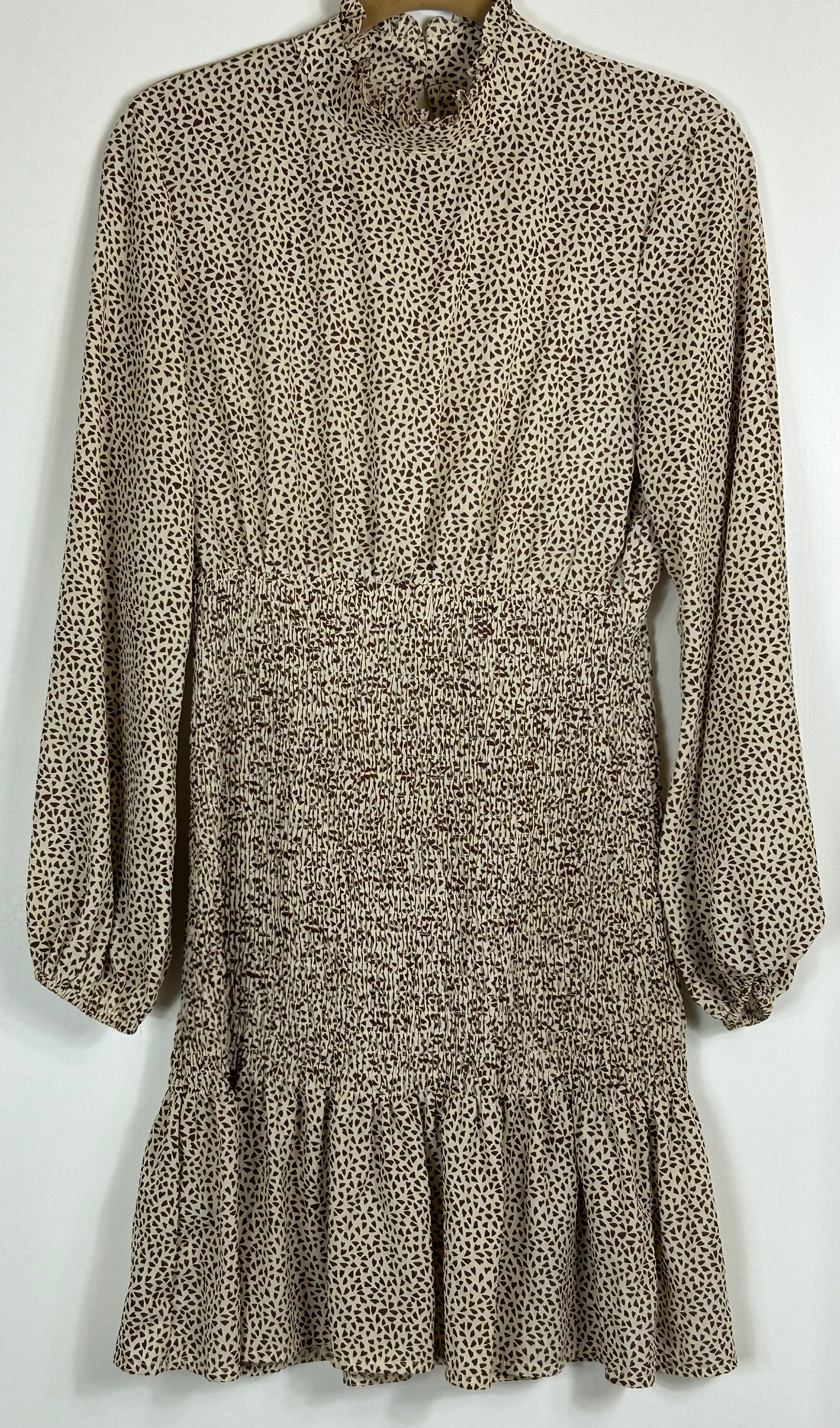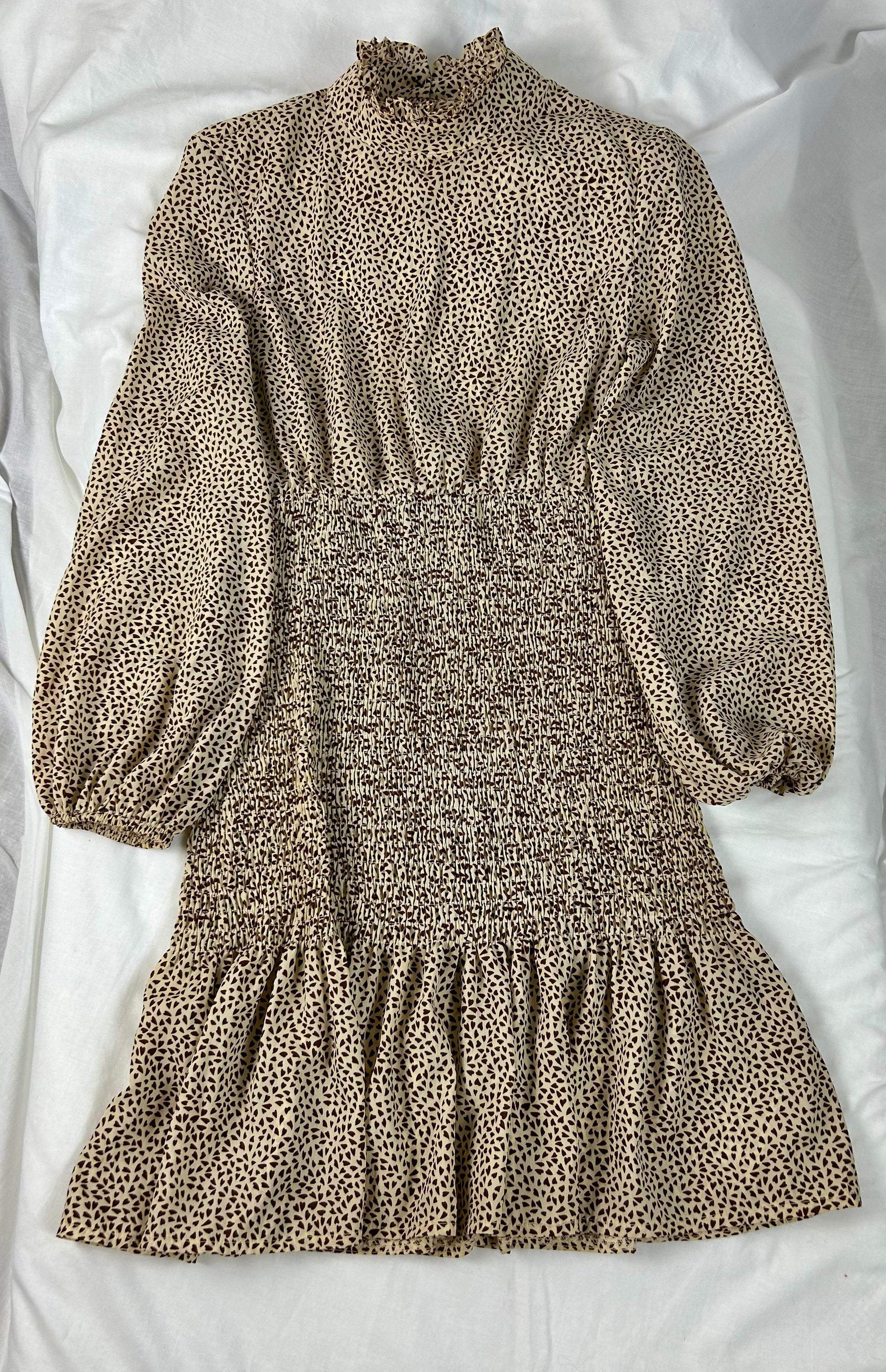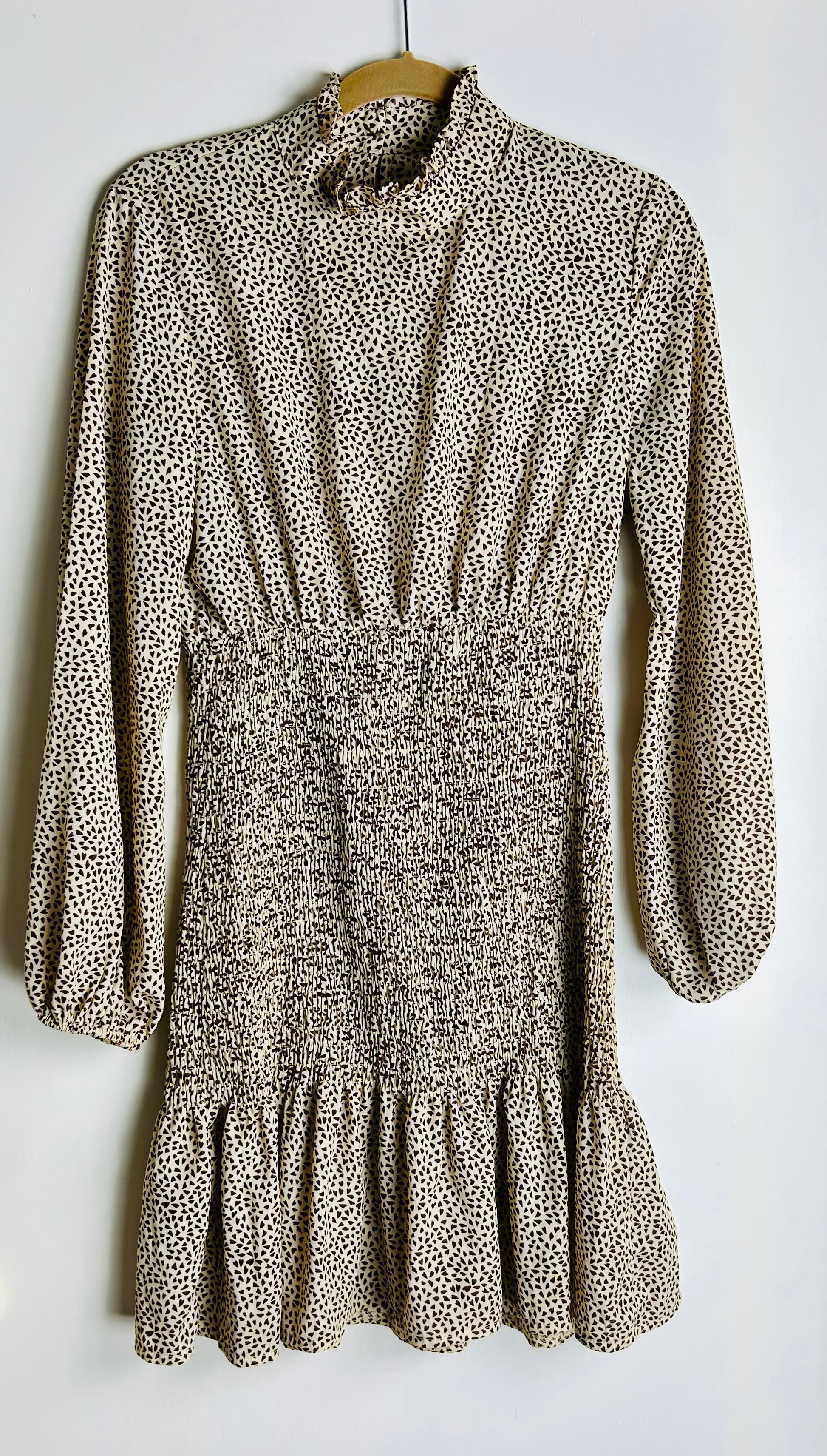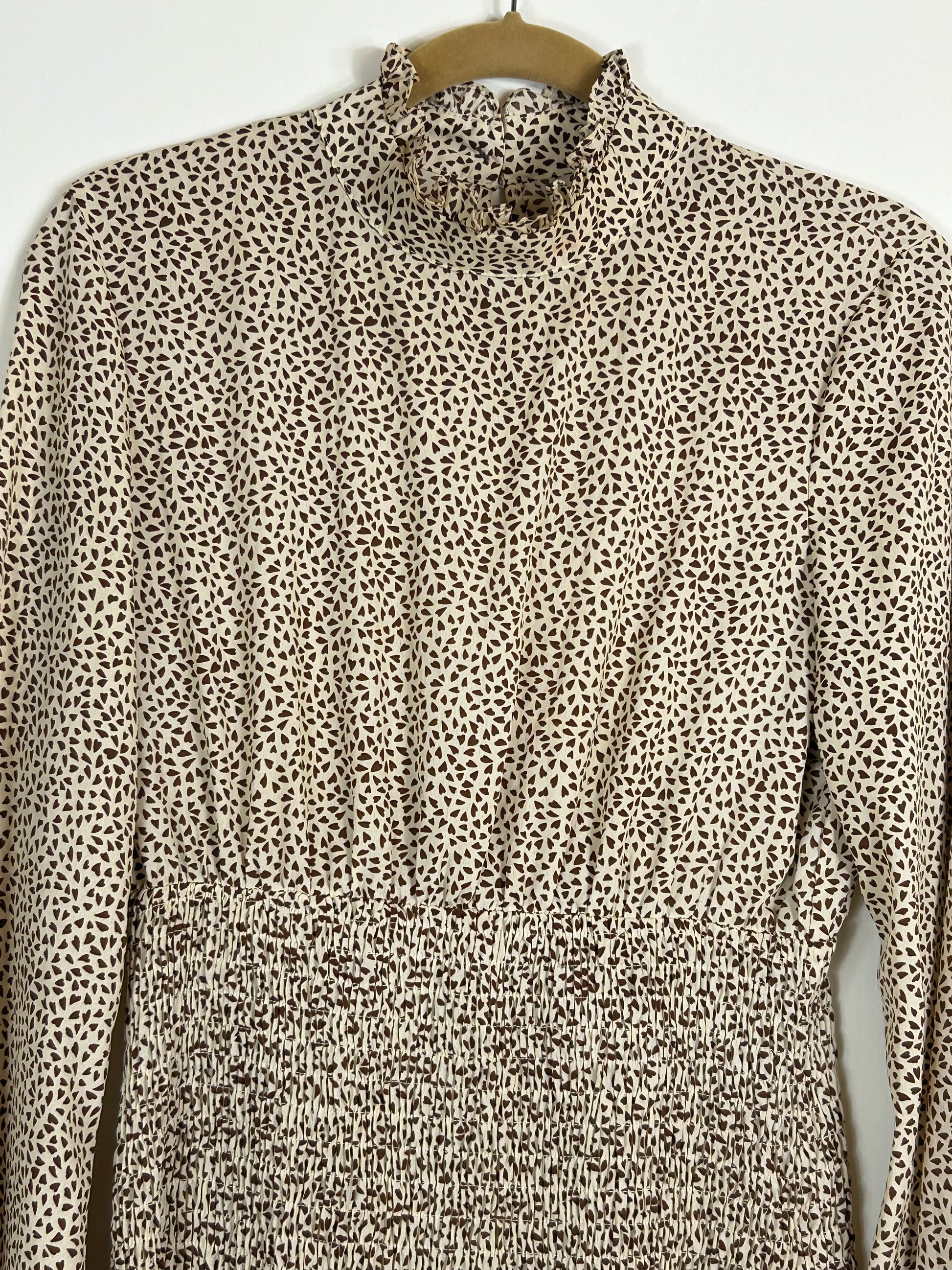 High neck long sleeve dress, elasticated middle with hemline frill. Colour beige & brown with small pattern