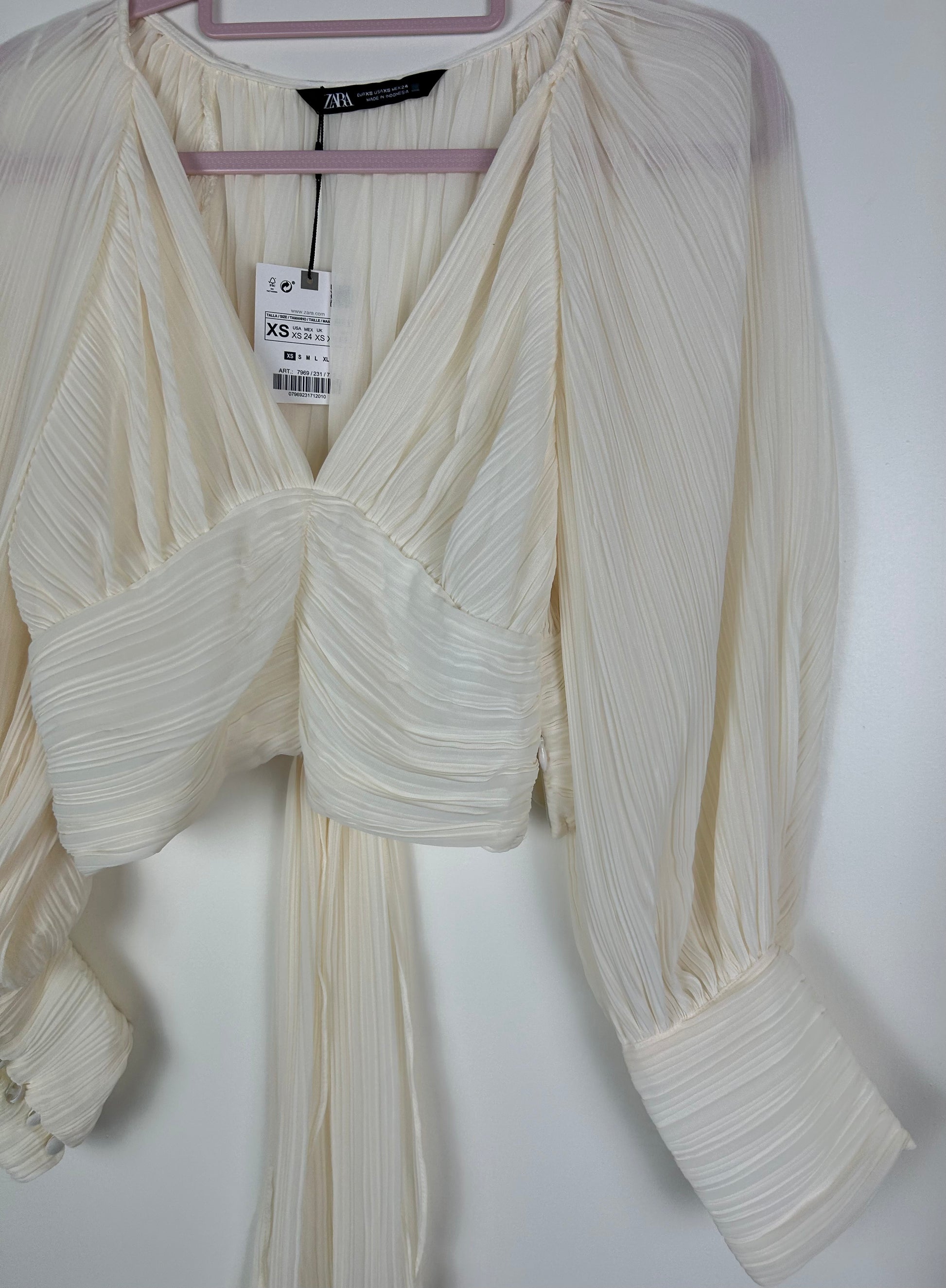 Short cream chiffon style long sleeved blouse.. V neck front, puckered bust, back tie detail. Puff sleeves with 5 buttons per cuff.Side zip fastening. Material 100% Polyester