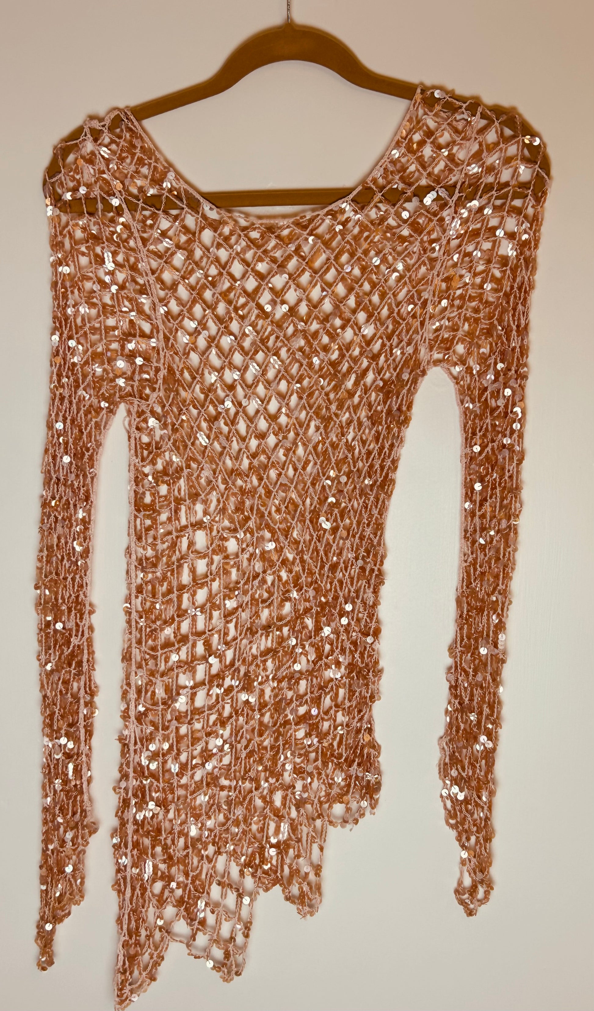 Ladies A symmetrical beach string style top, dusty pink knit with beads..