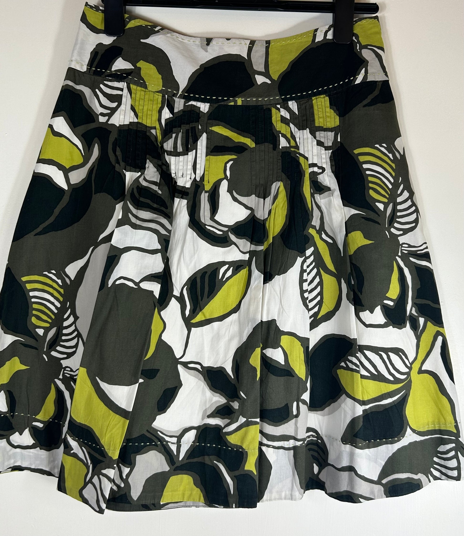 Ladies cotton skirt, green, black & white floral pattern. Small white stitching around waist & hem line. Box pleated front. Back zip fastening knee length. Fully Lined