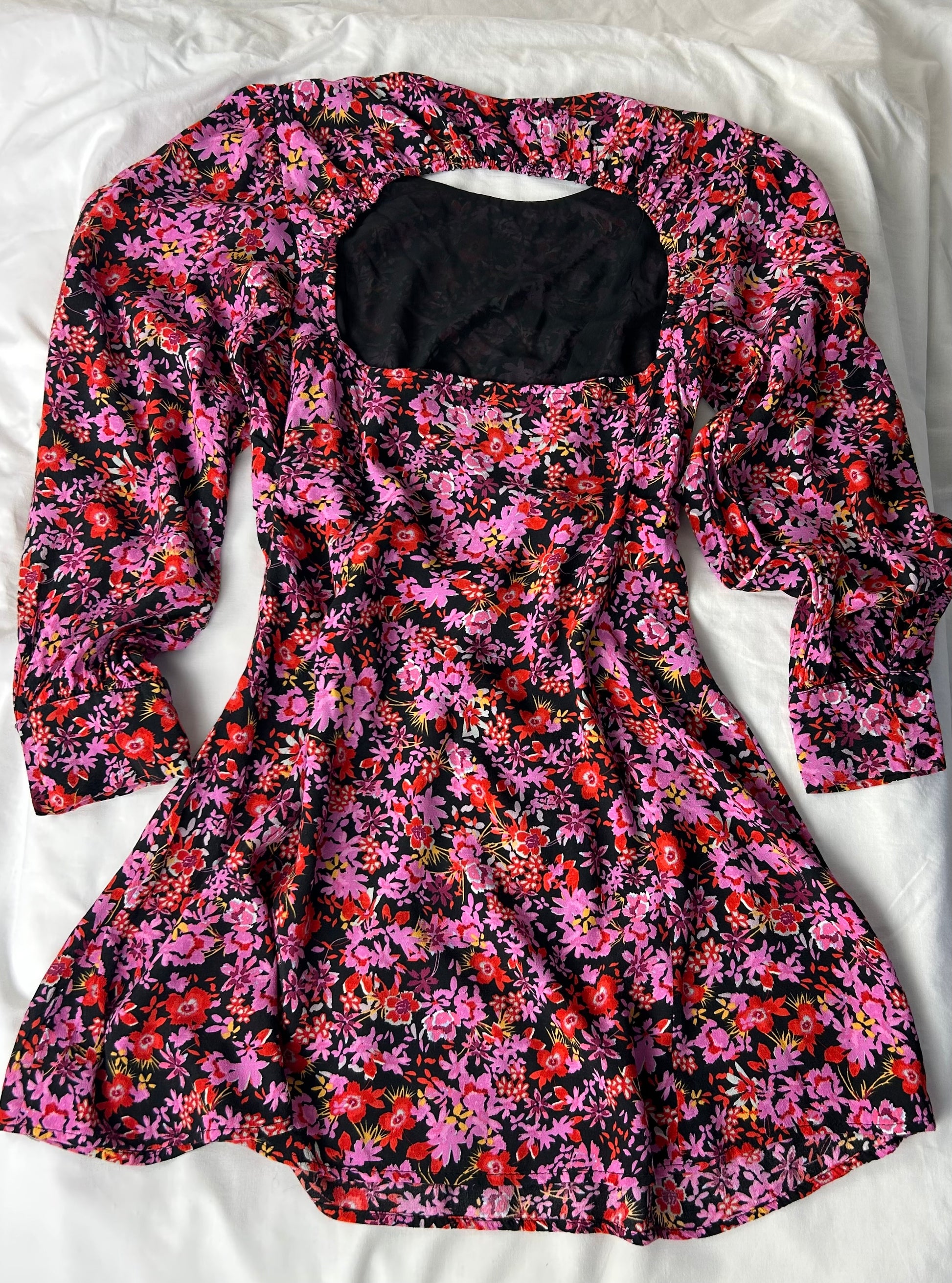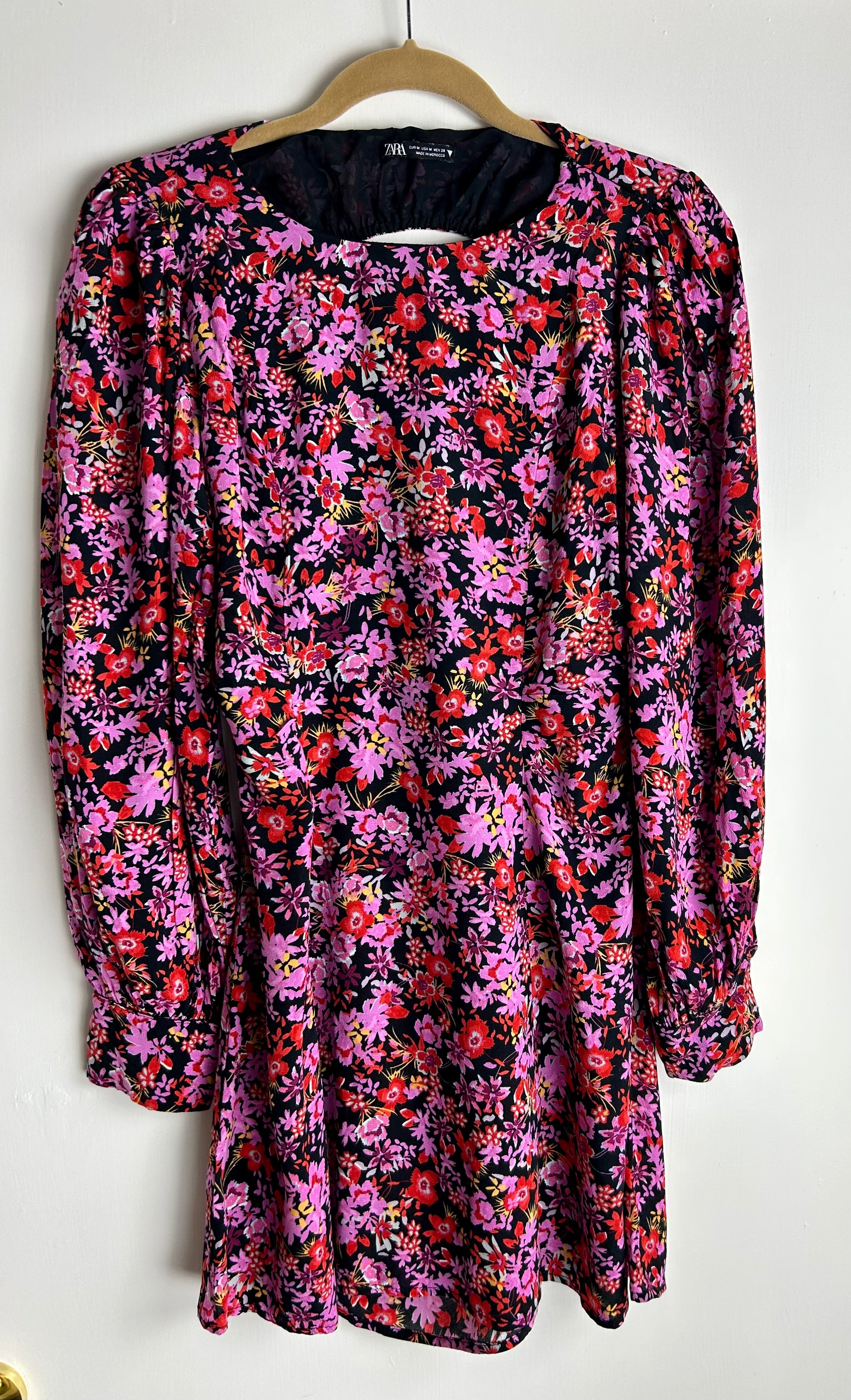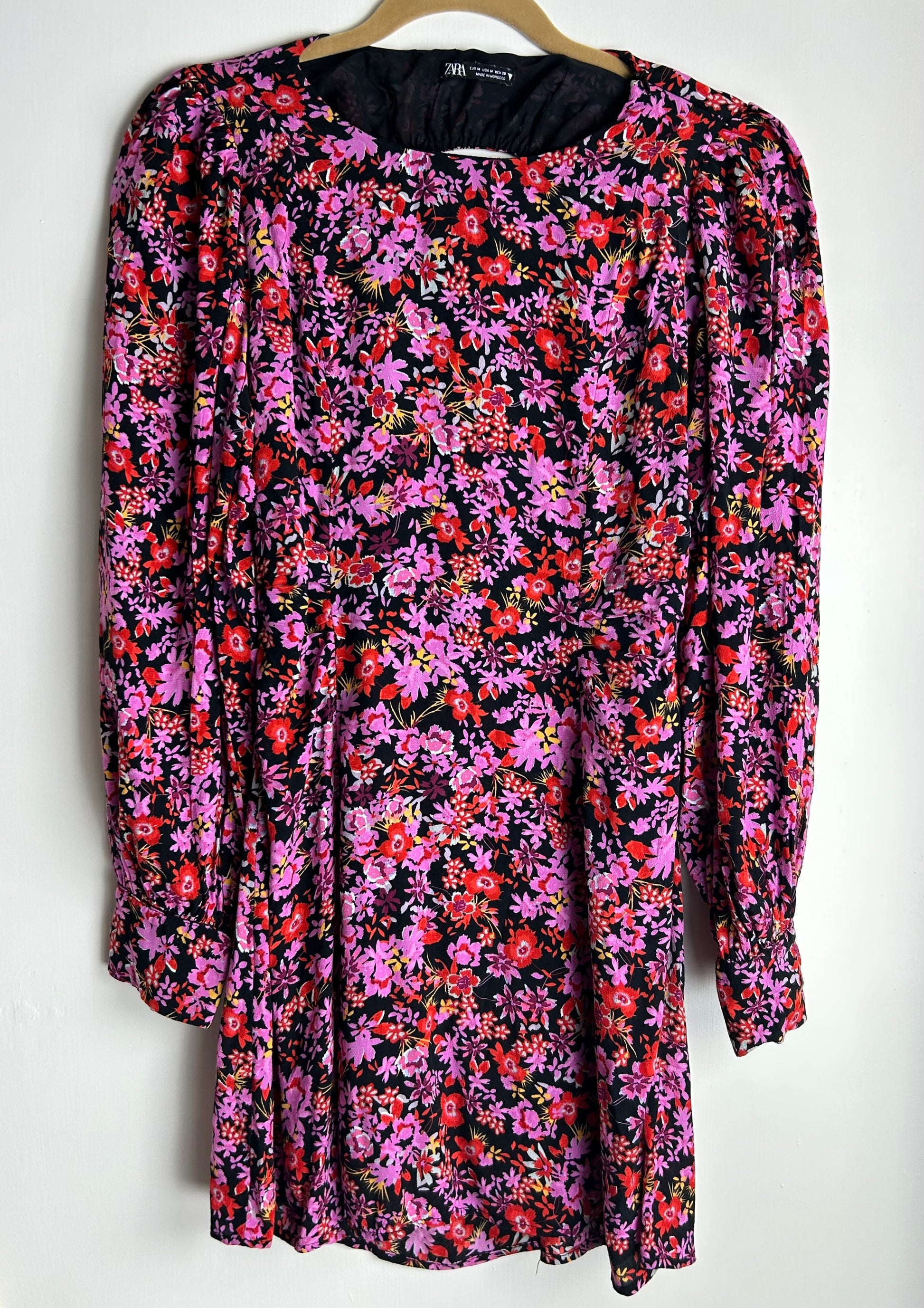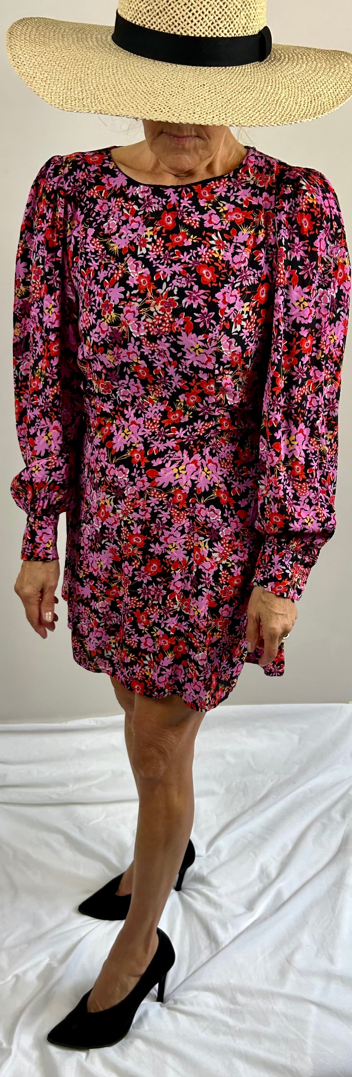 Short dress, pink & black floral pattern. Long sleeve, side zip.