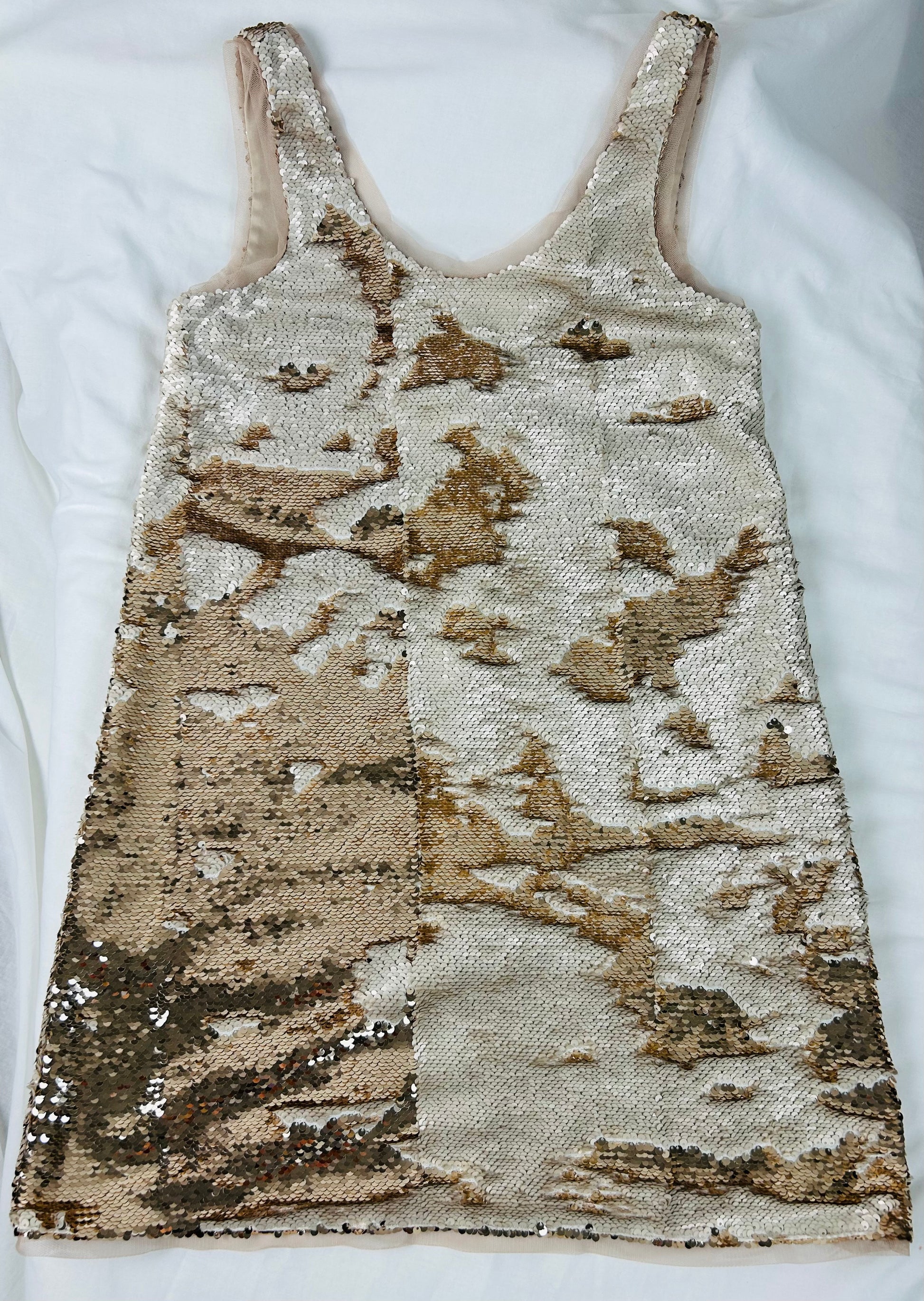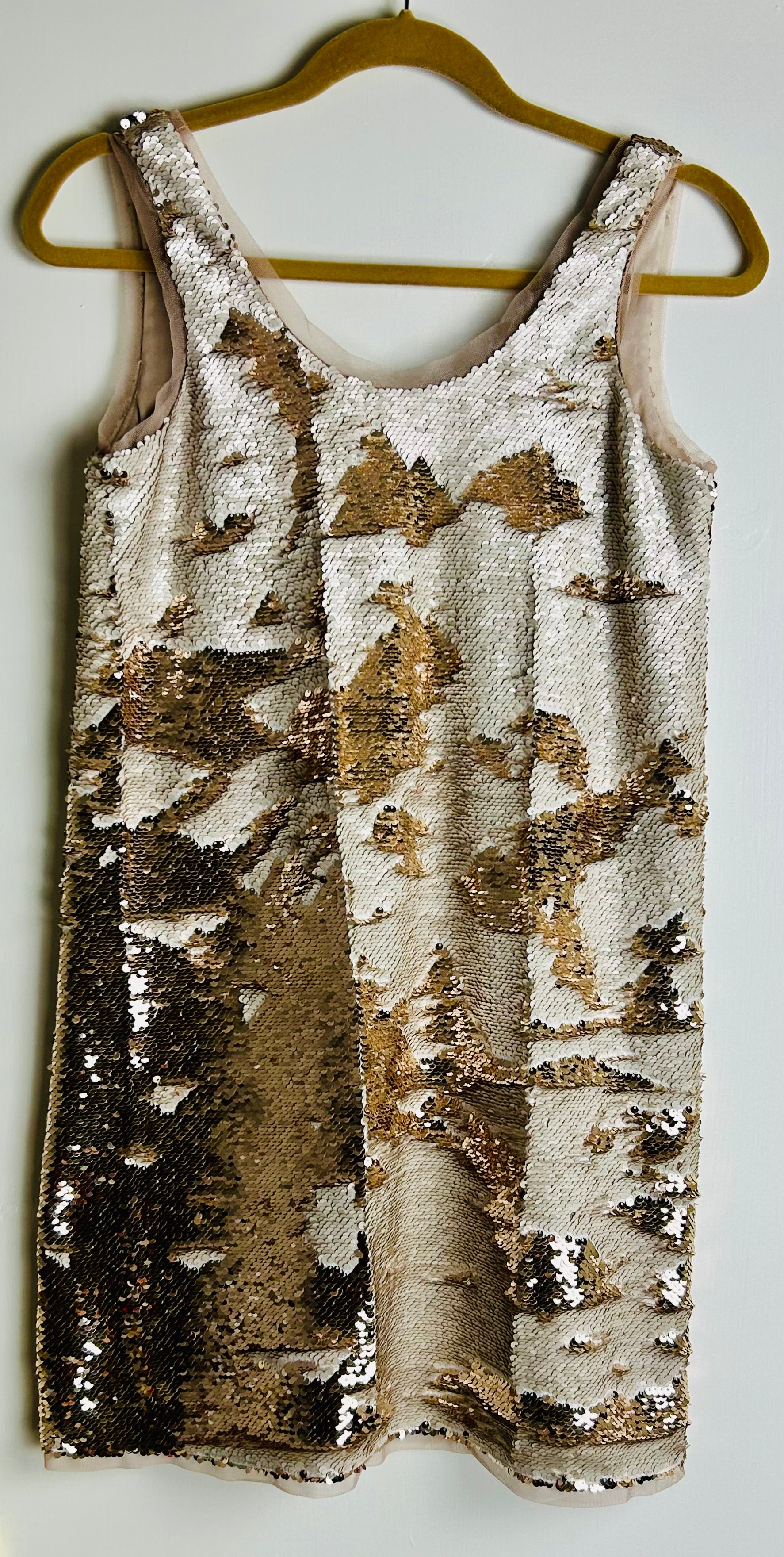 Short sequenced dress, gold and base sequence & chiffon trim around hem & neckline. Fully lined