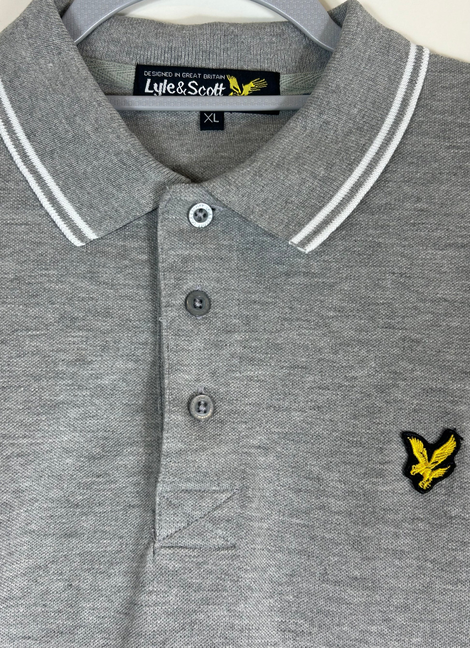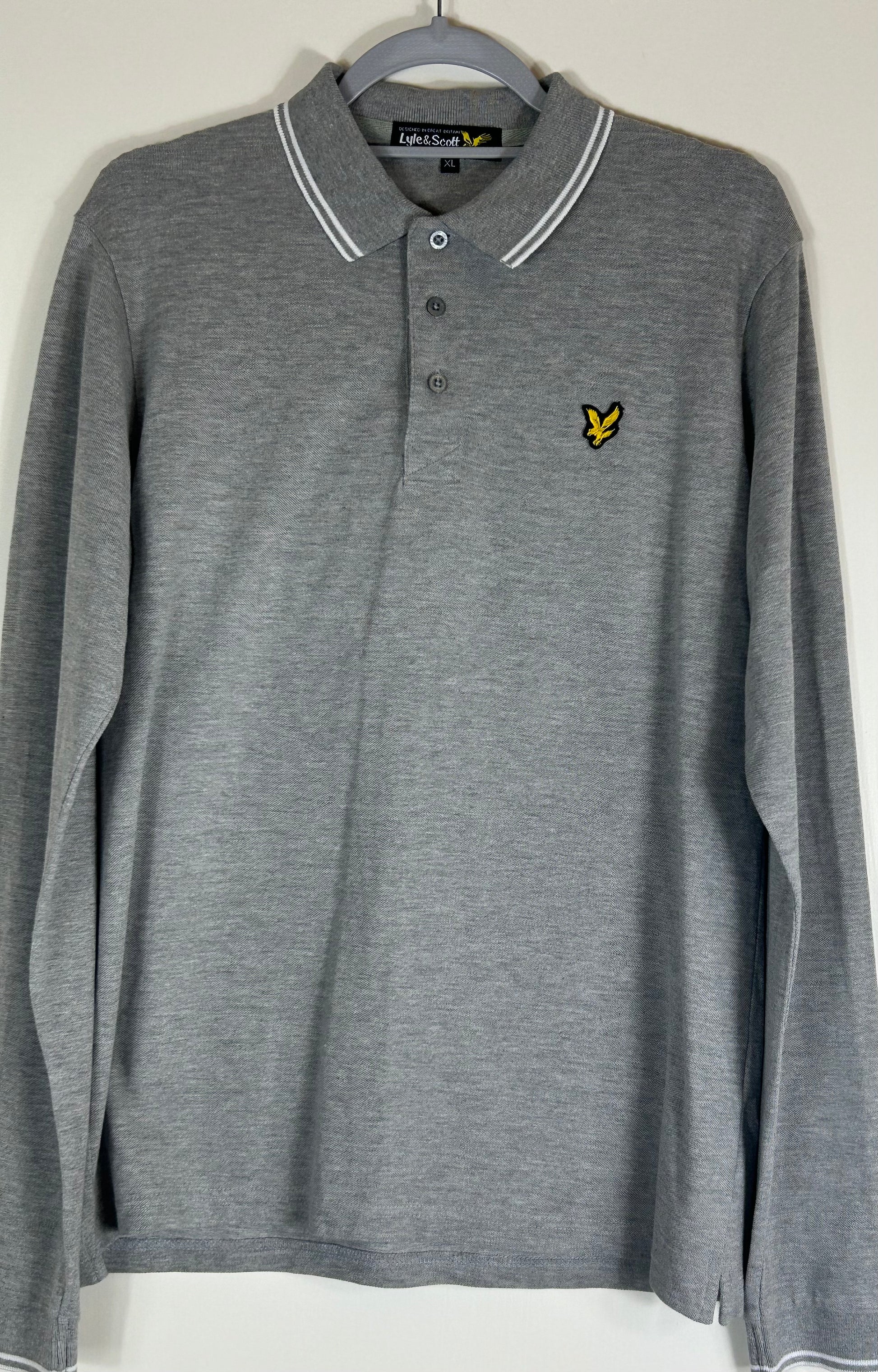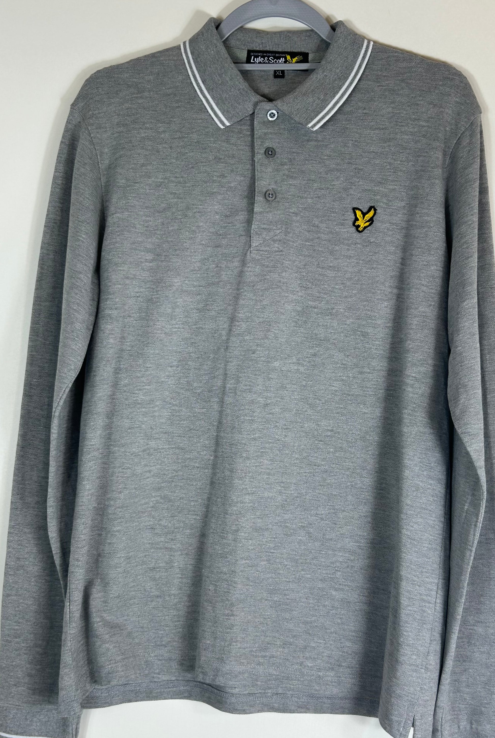 Pale Grey Lyle and Scott Long Sleeve Polo shirt. Motif on left breast. 3 button front fastening. Two white stripes around collar & cuffs