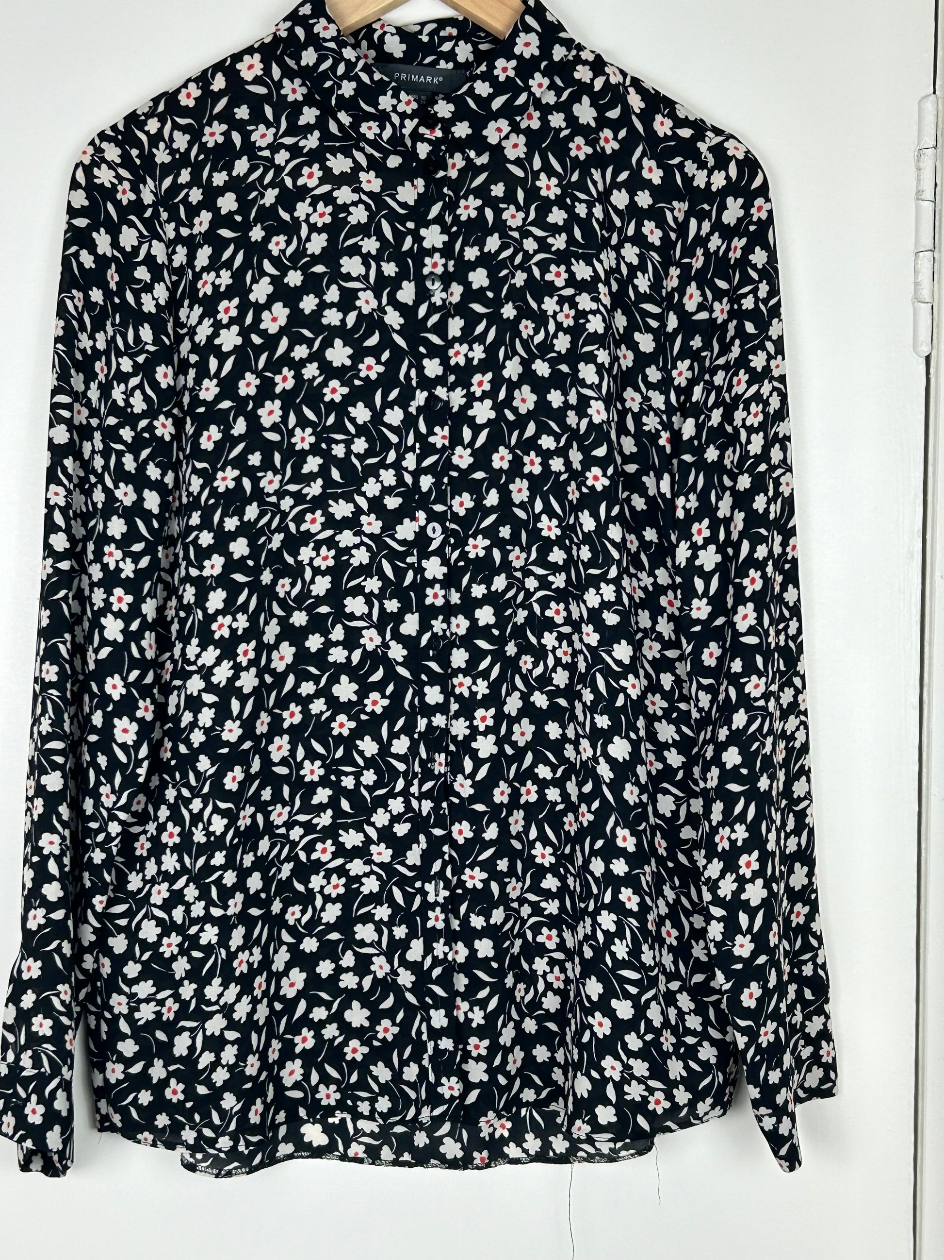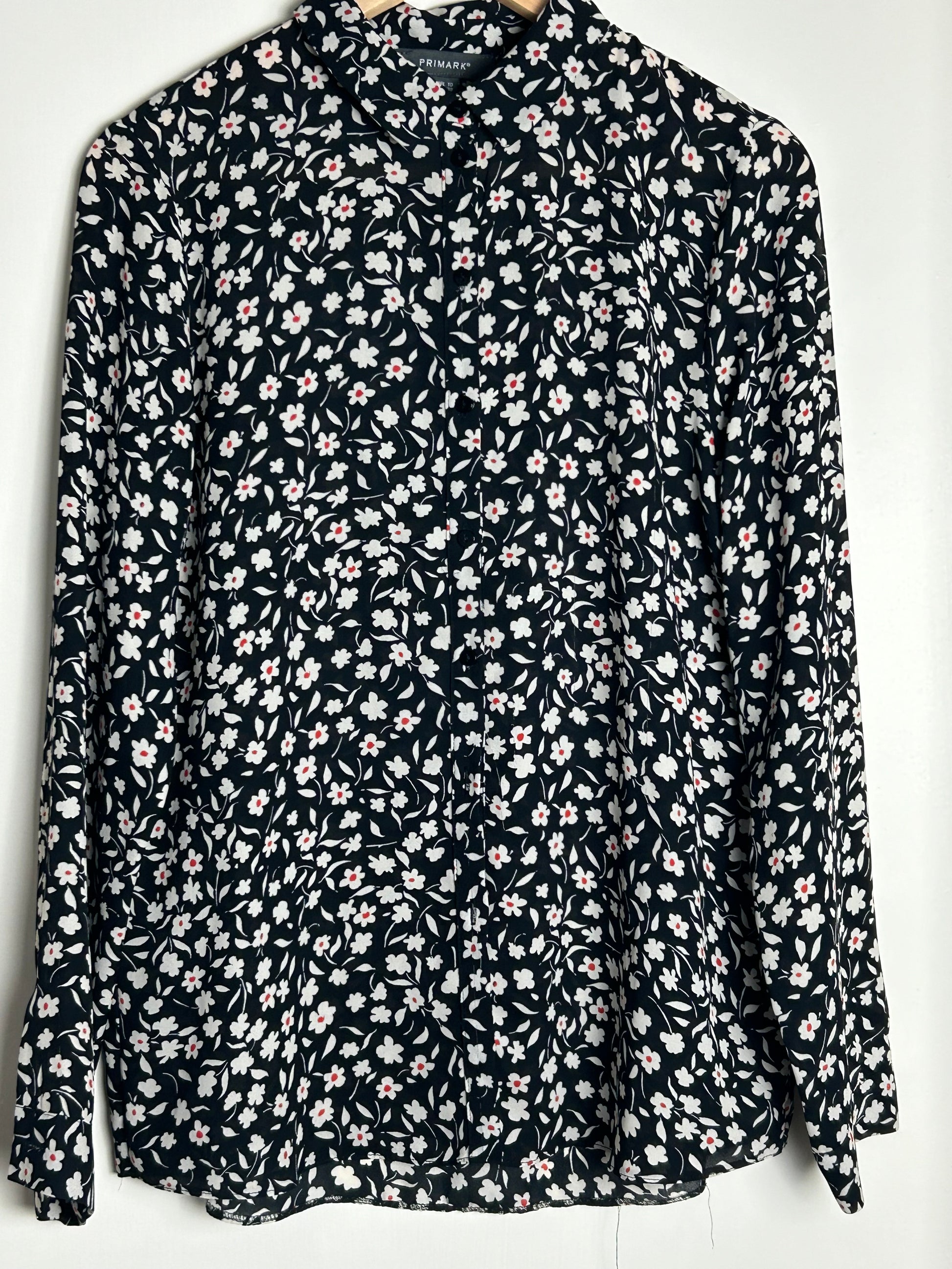 Ladies fine blouse with black main colour with small cream flowers. Button front with long sleeves