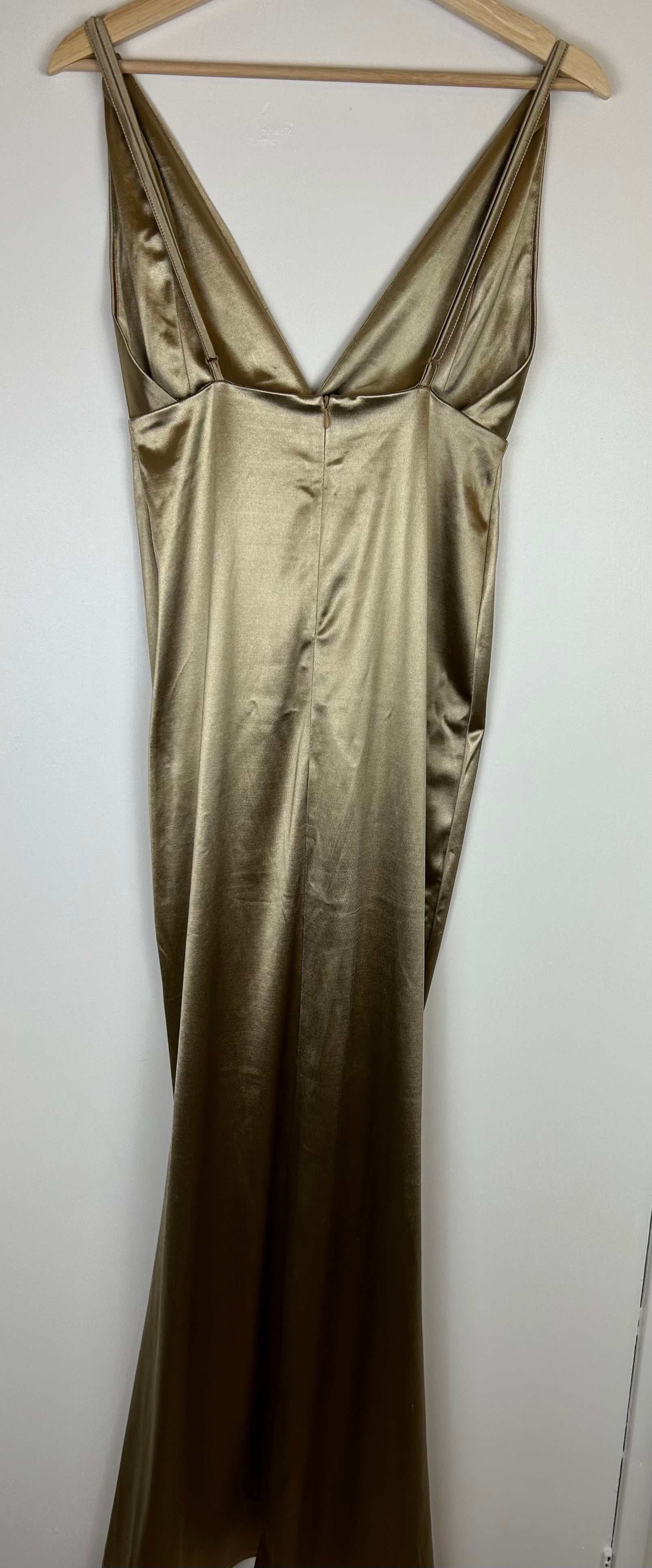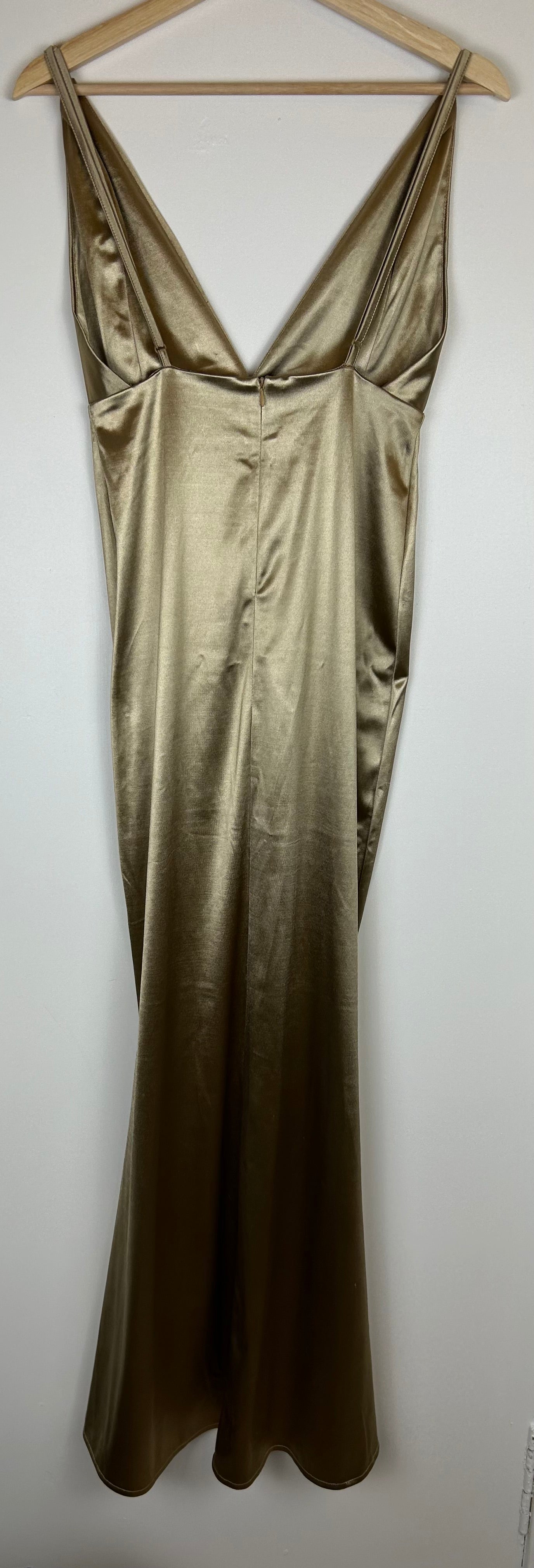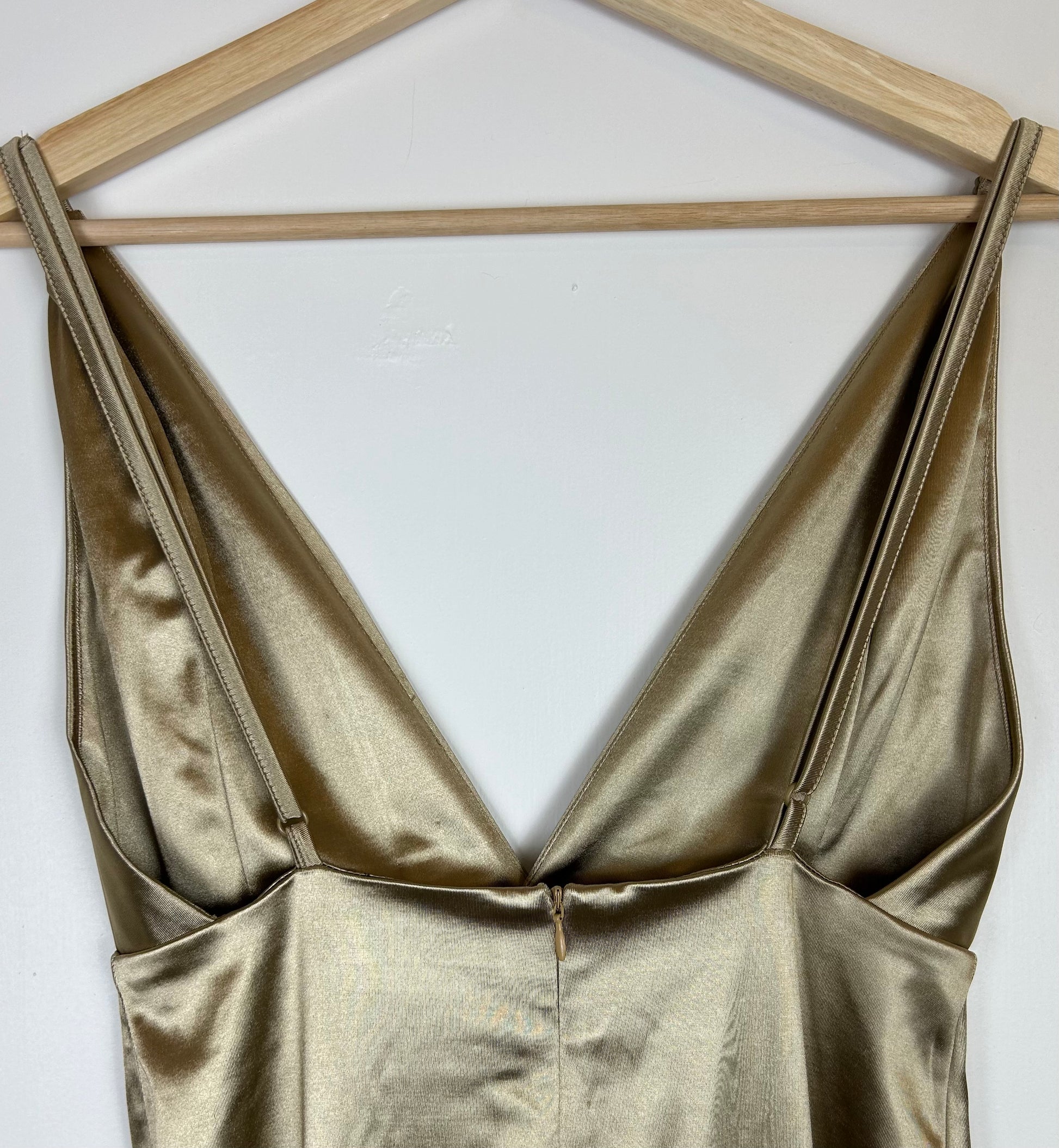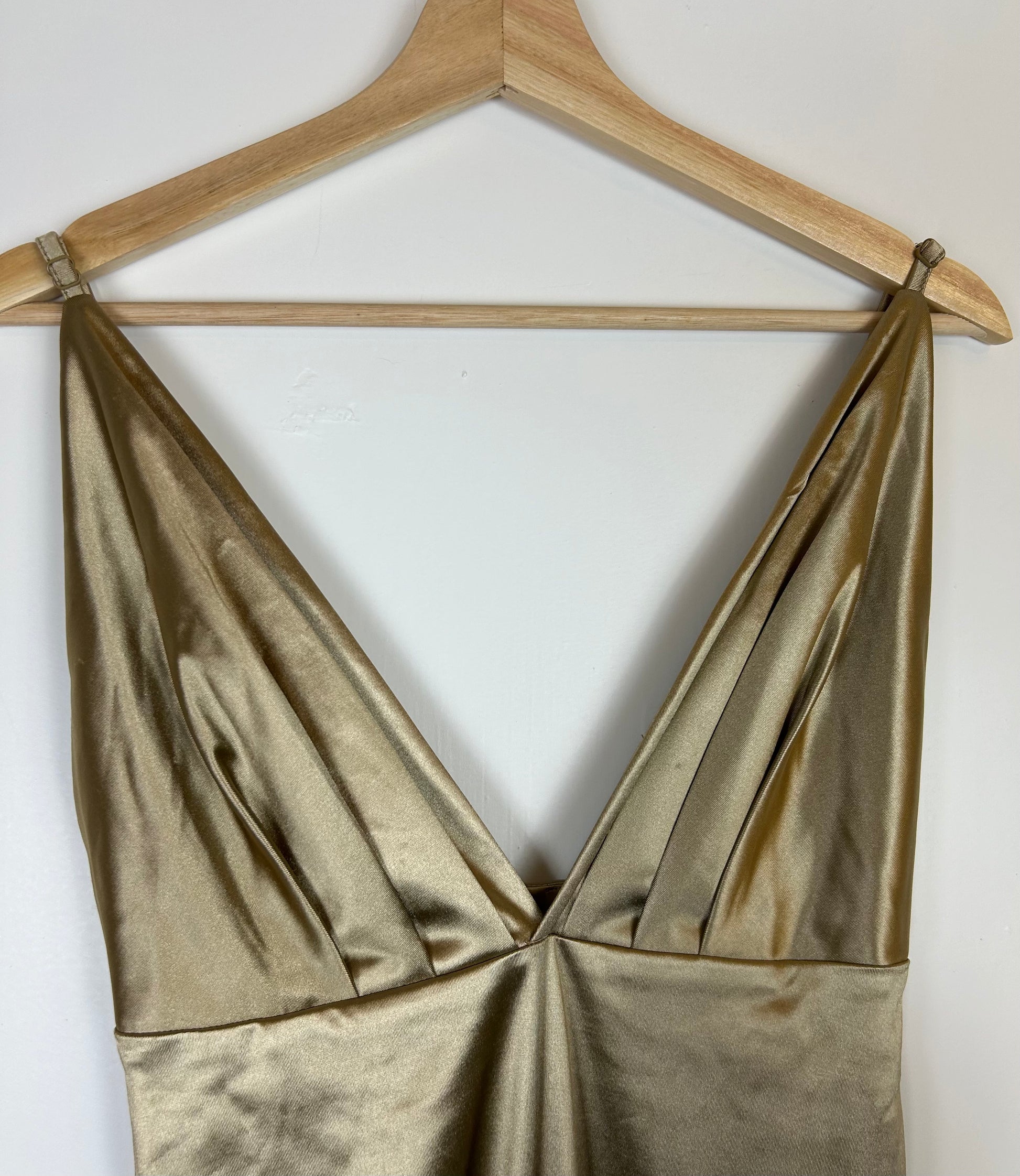 Gold silk evening style dress. Floor length, zip at back, pleated bust, shoe string straps