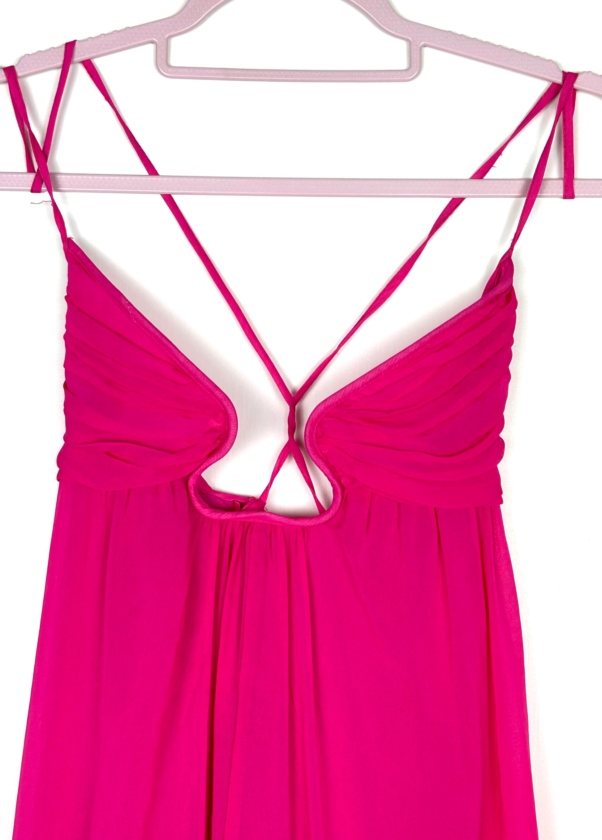 Ladies long evening dress,. Hot Pink, strappy top with cross over straps. Boned bustier front & low back