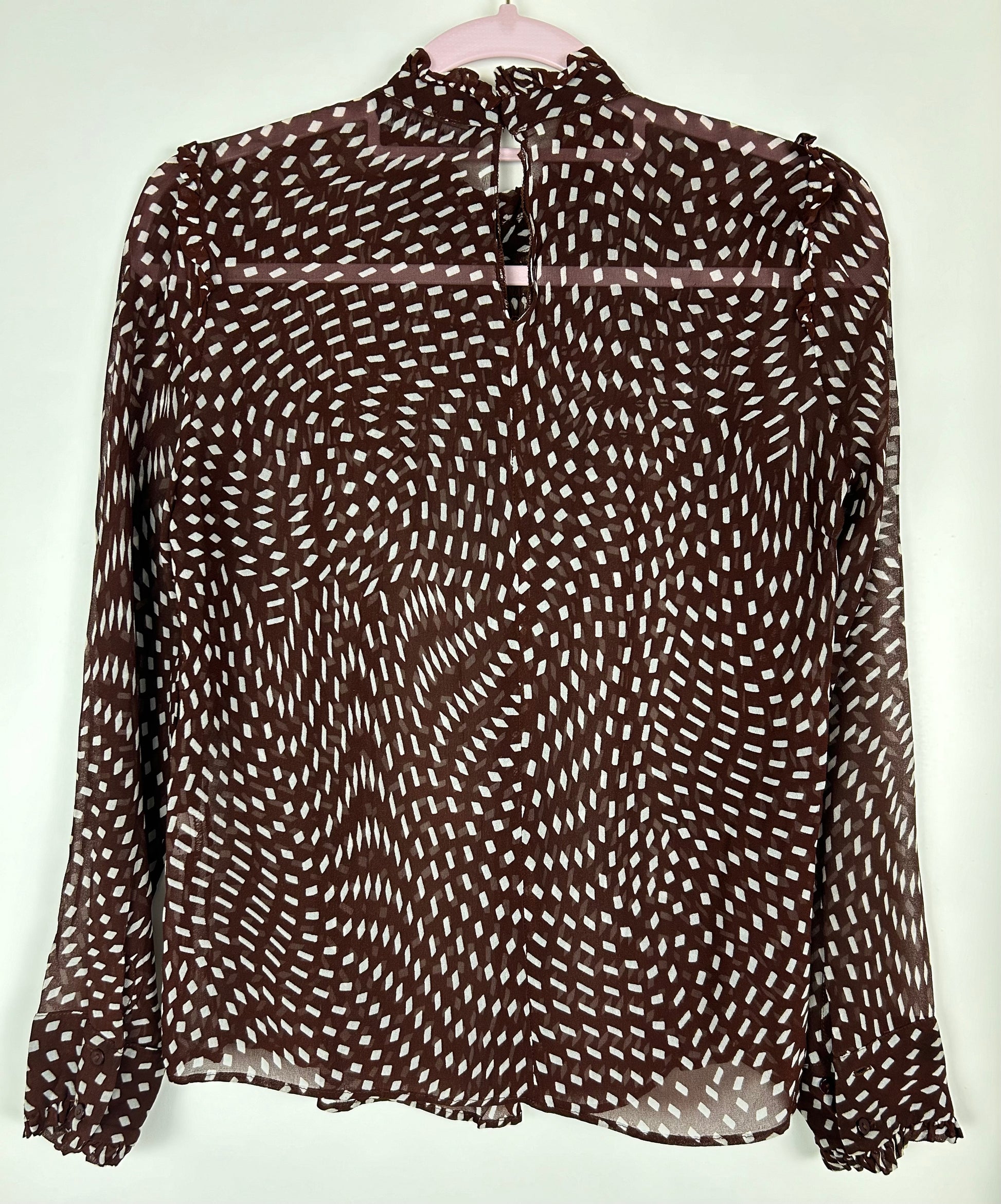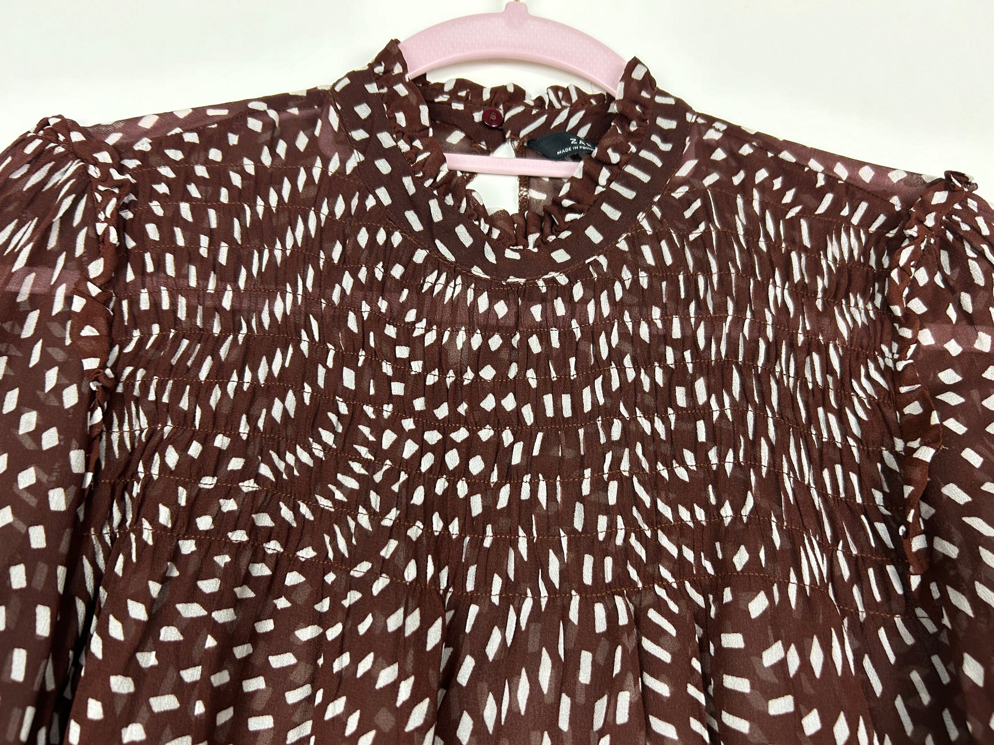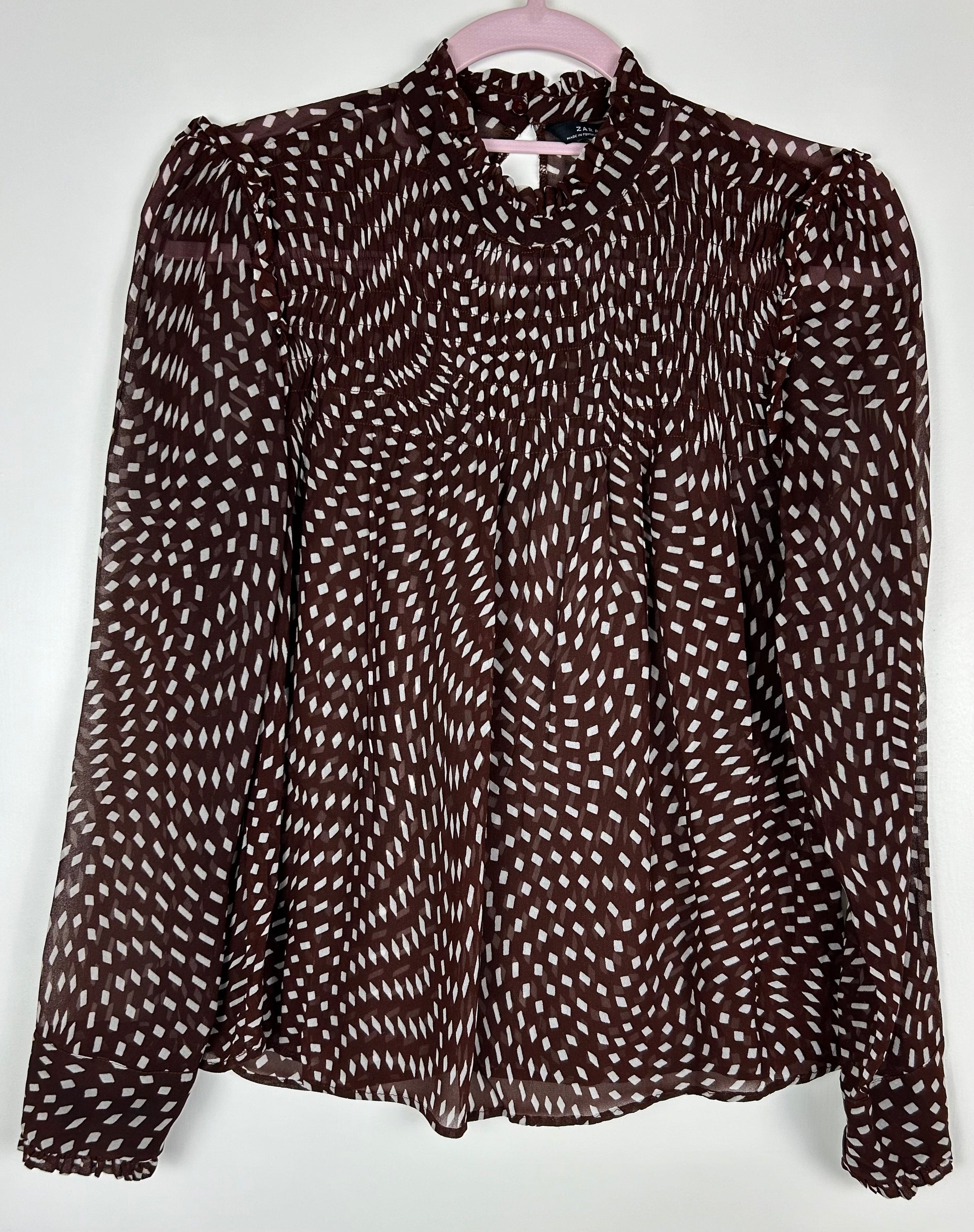 Long sleeved Zara blouse with button cuffs, burgundy with white diamond pattern, high neck with button fastening at back of neck