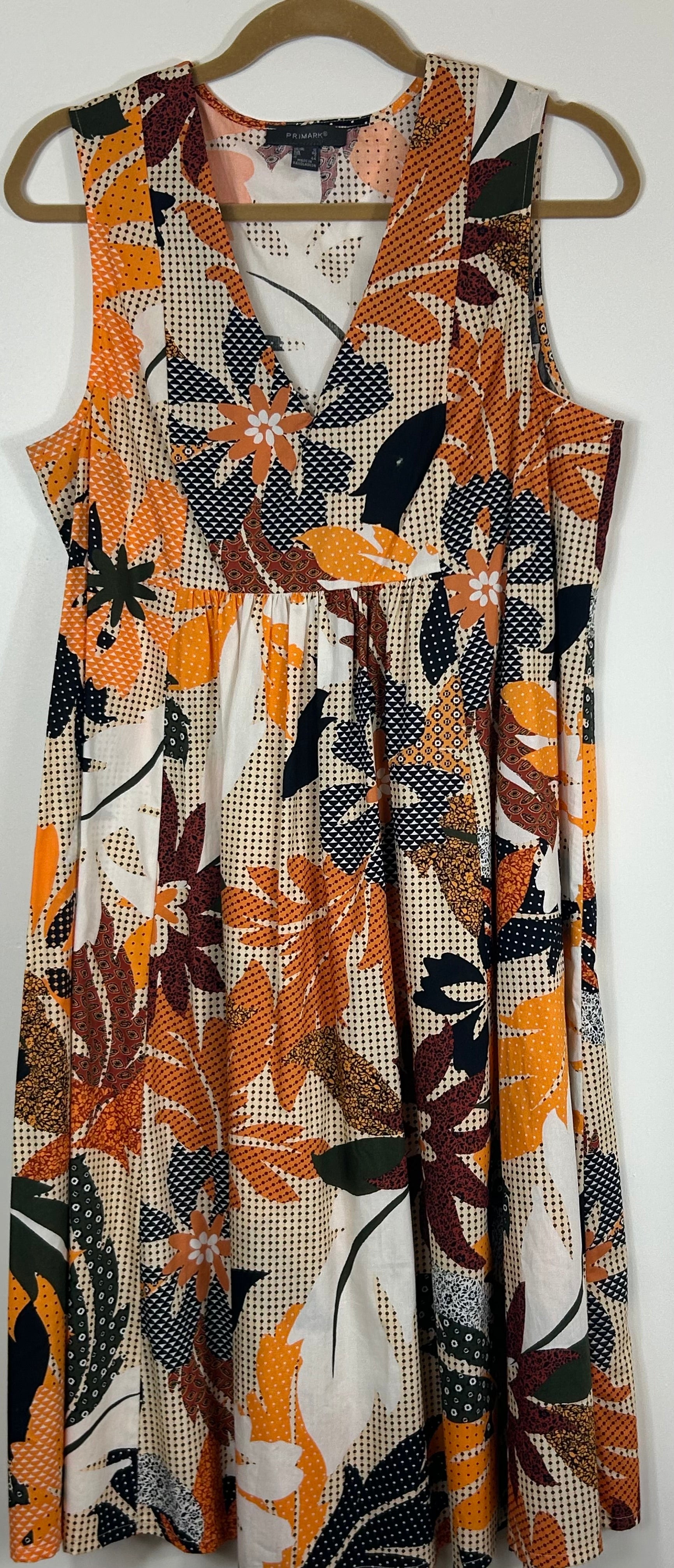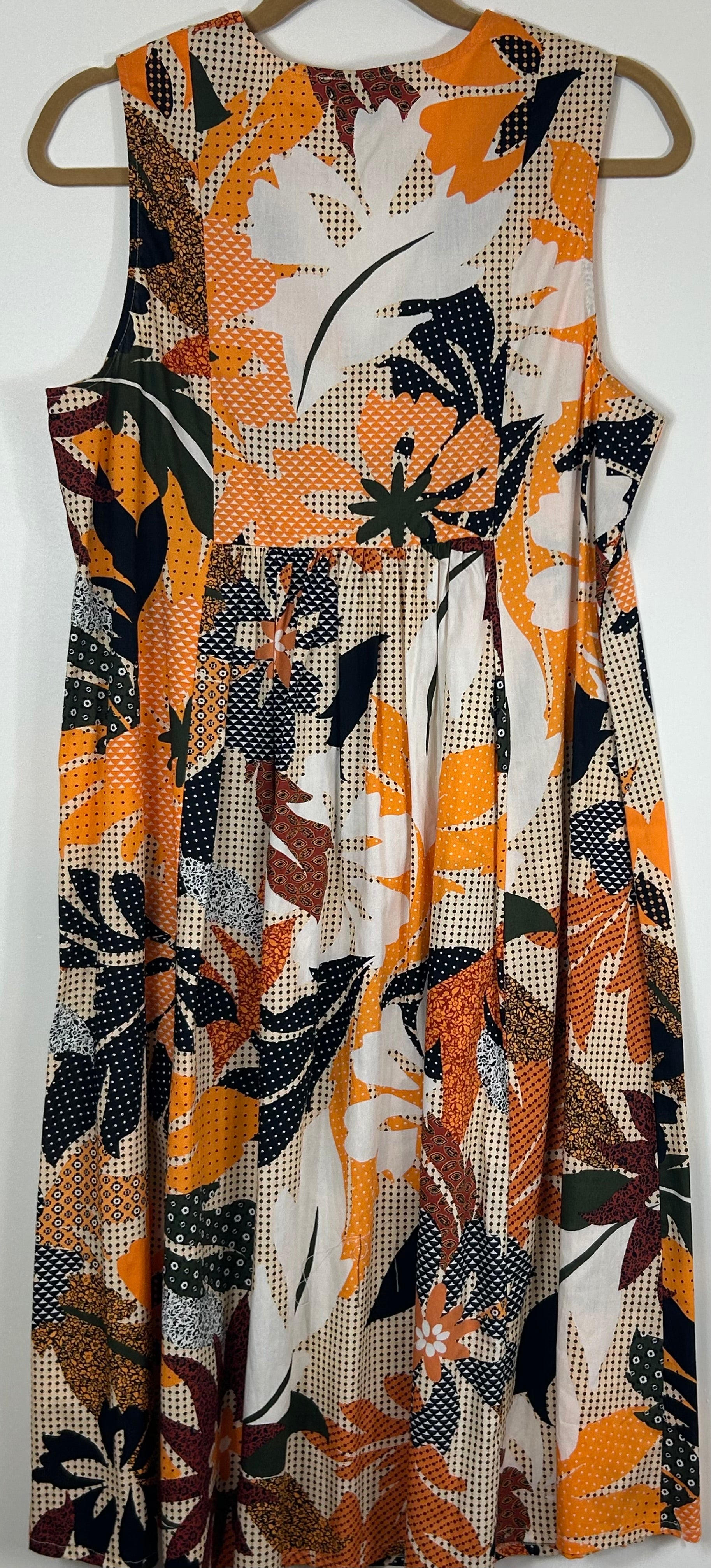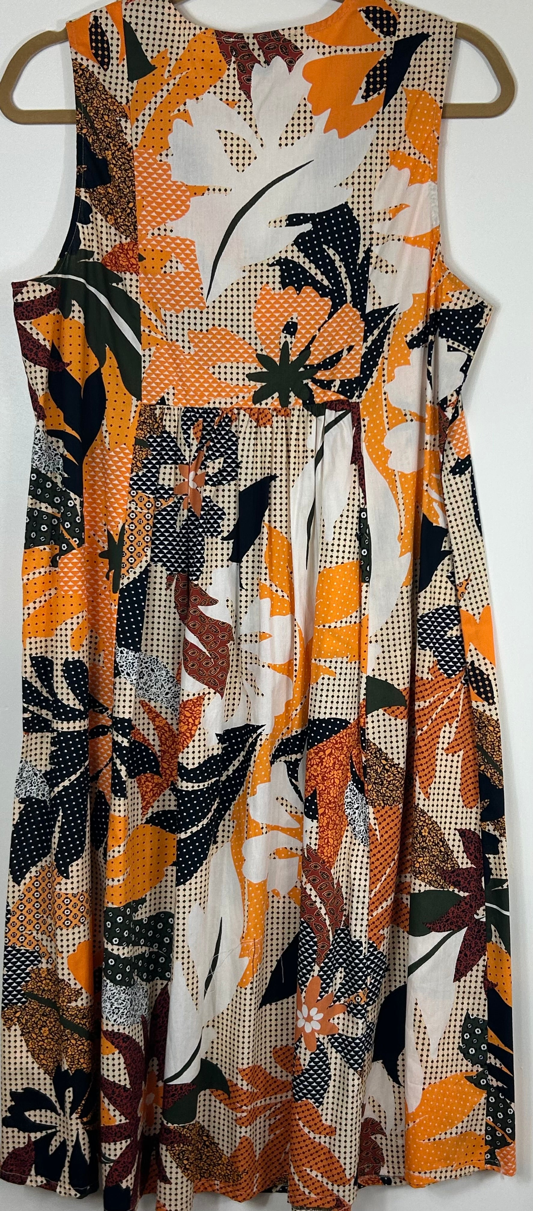 Multi Autumnal Coloured Sleeveless Cotton Dress. V neck, calf length, pull on with lower bust gathering (front & back)