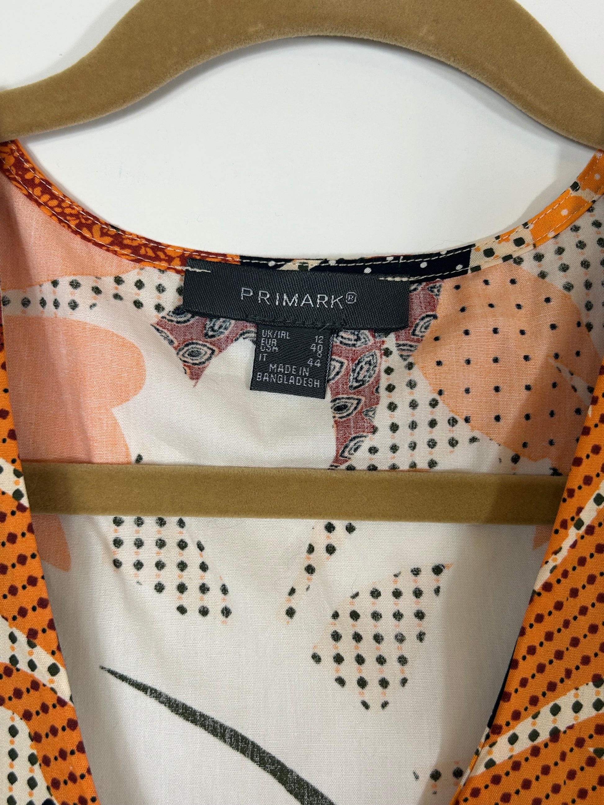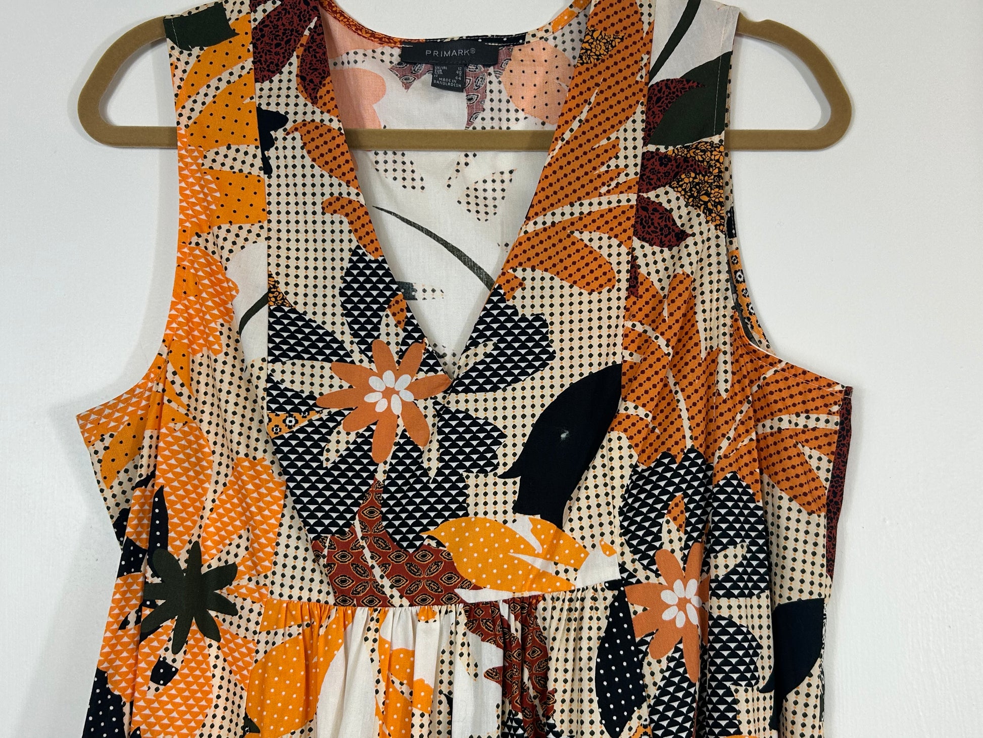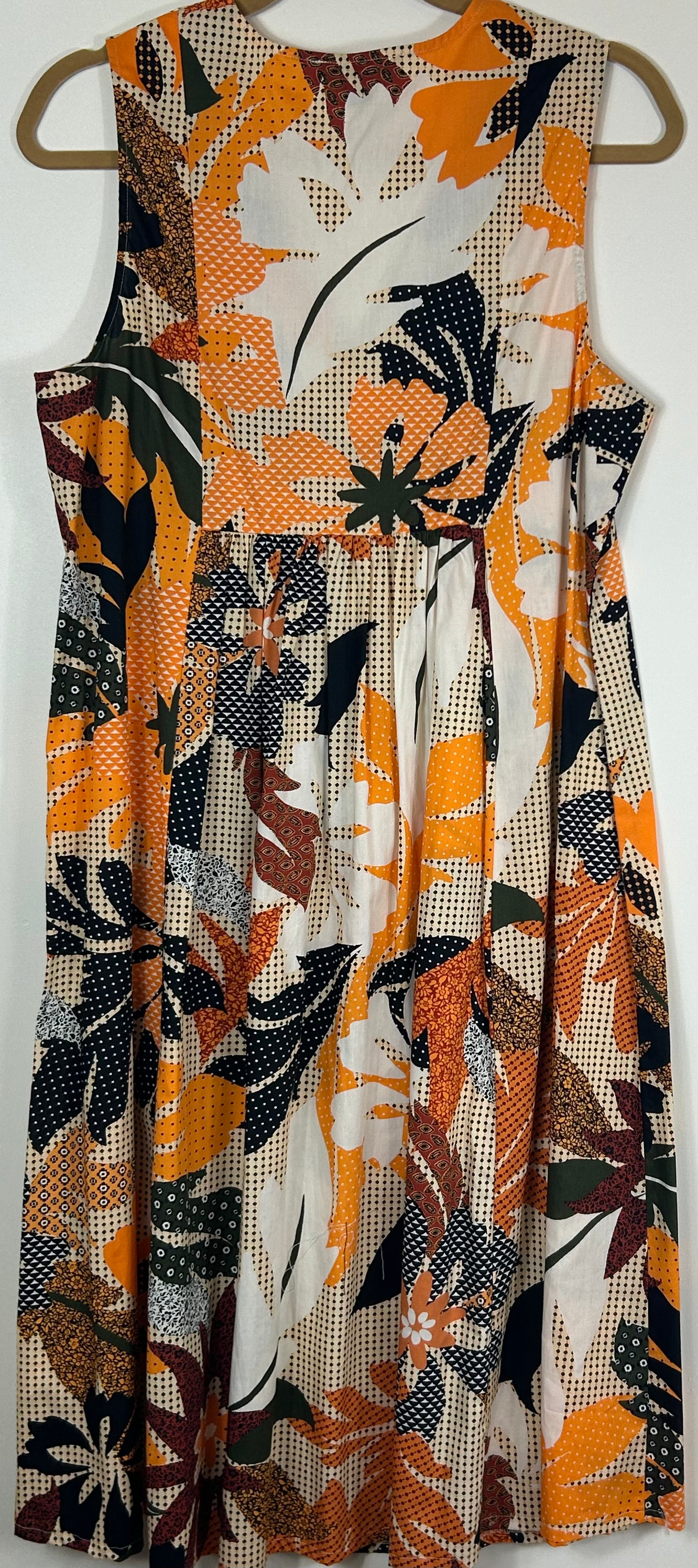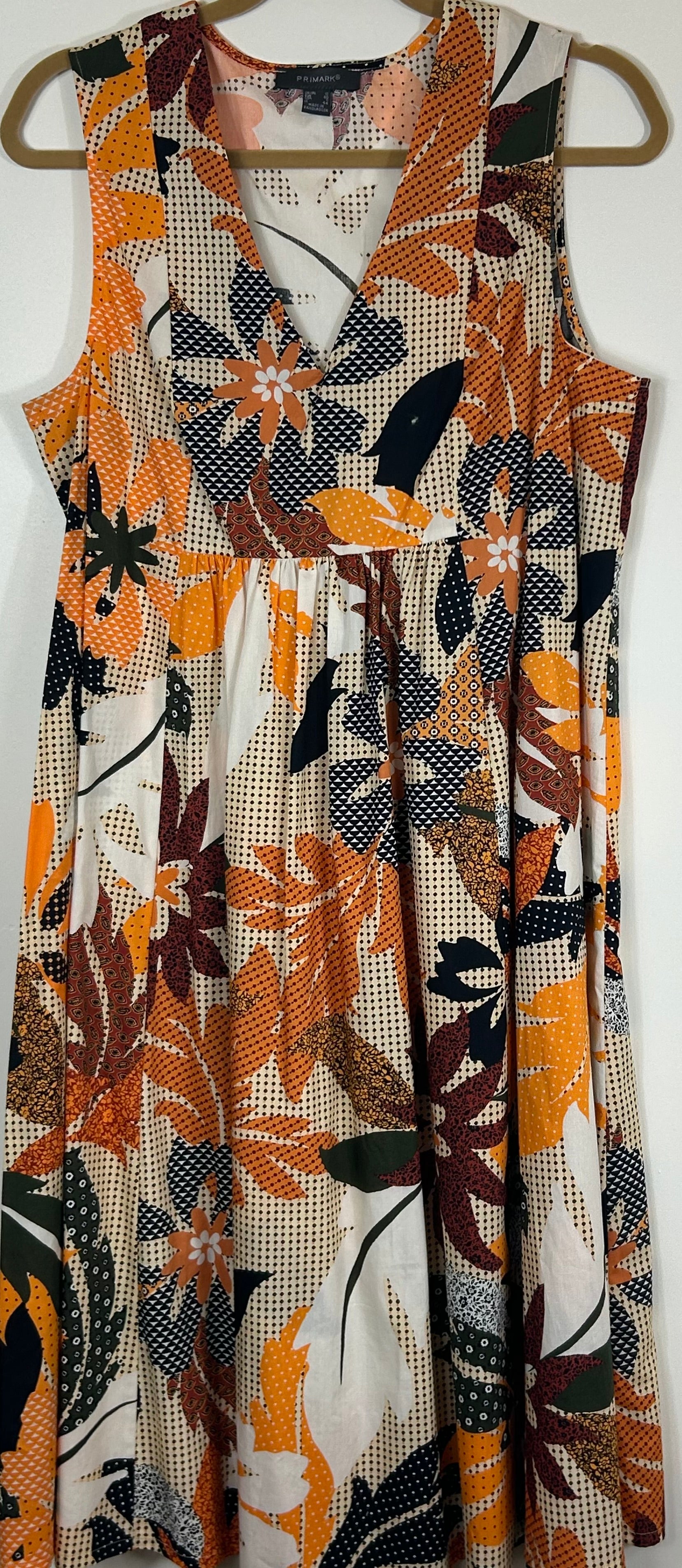 Multi Autumnal Coloured Sleeveless Cotton Dress. V neck, calf length, pull on with lower bust gathering (front & back)