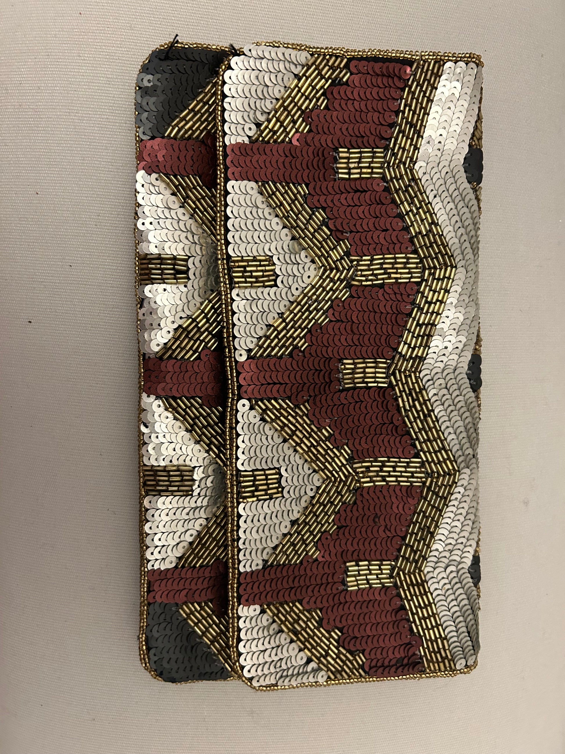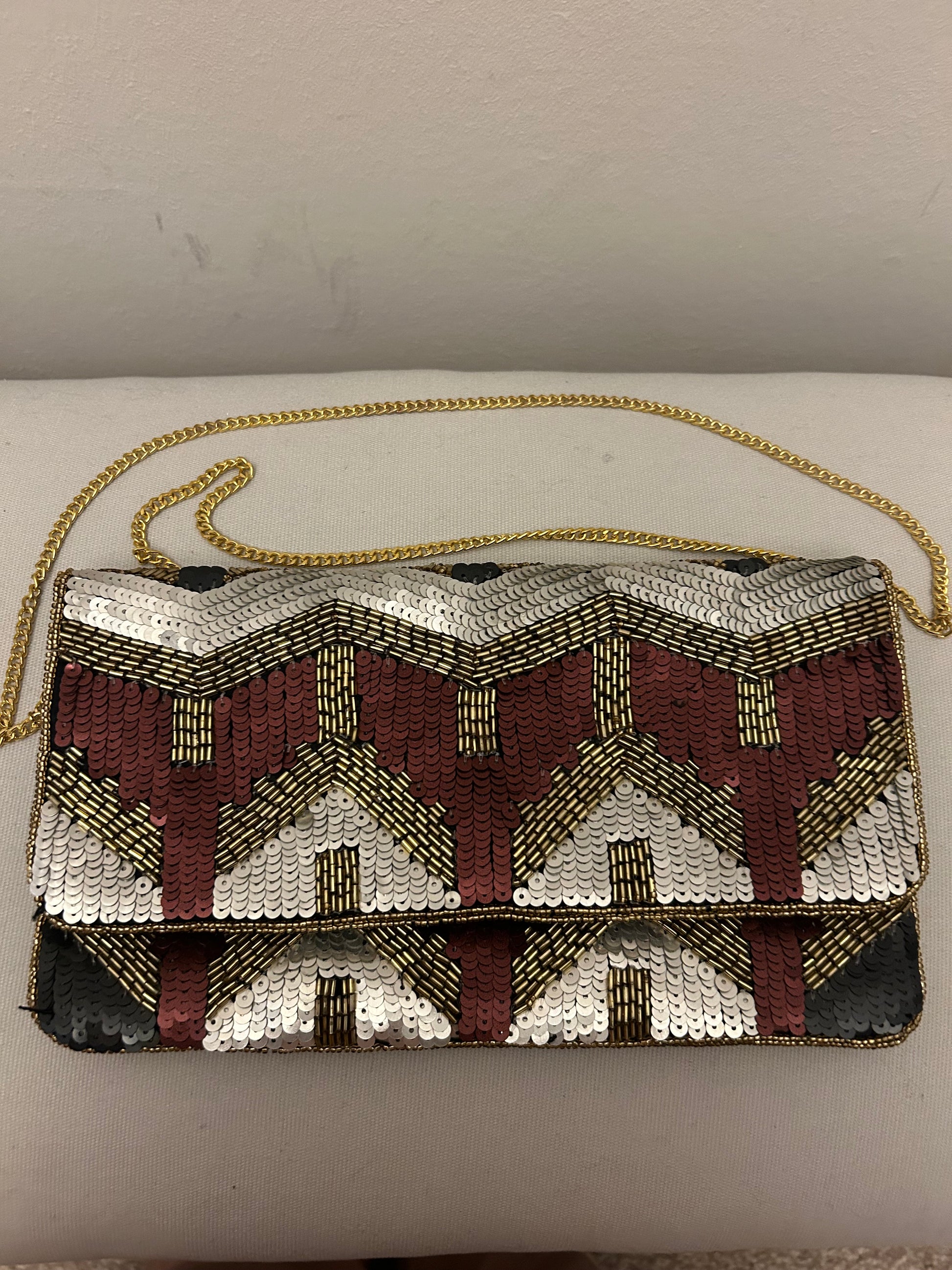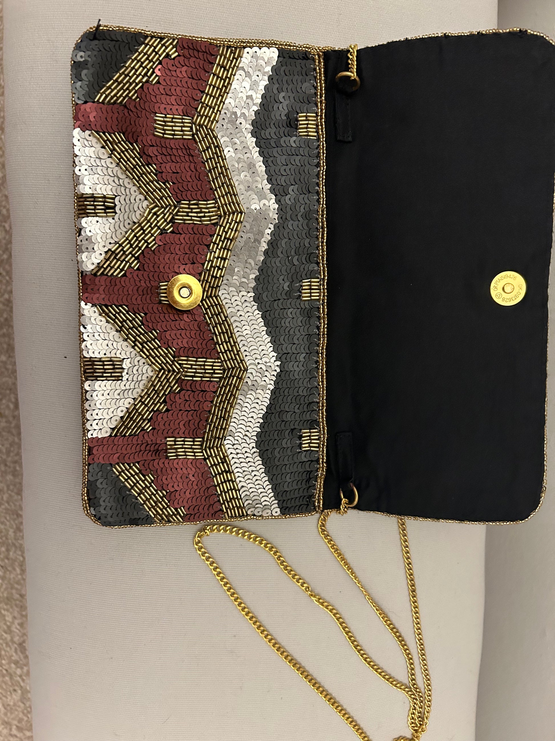 Multi Coloured Sequined Beck Sandergard Evening Bag with thin gold crossbody strap. Fold over stud fastening