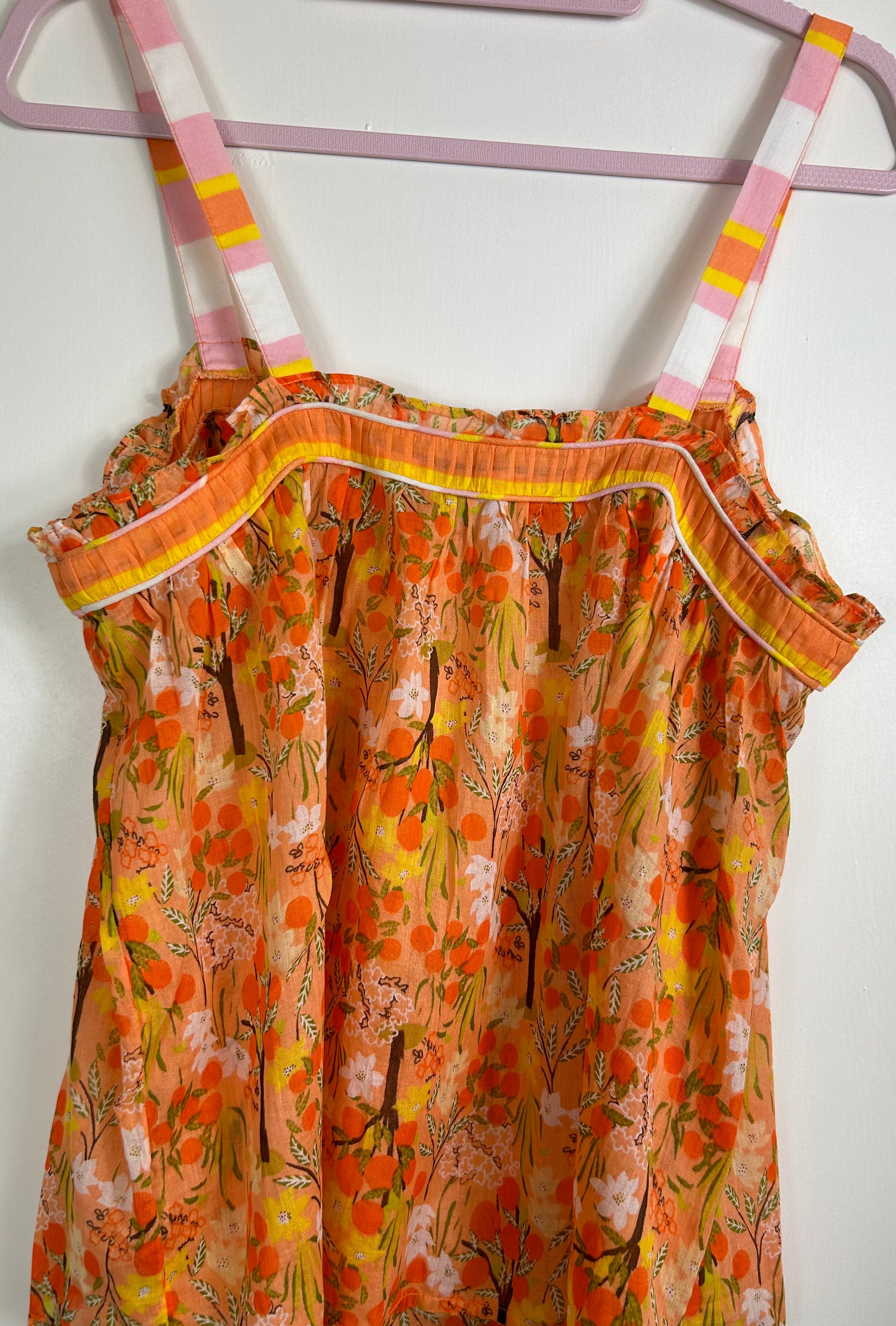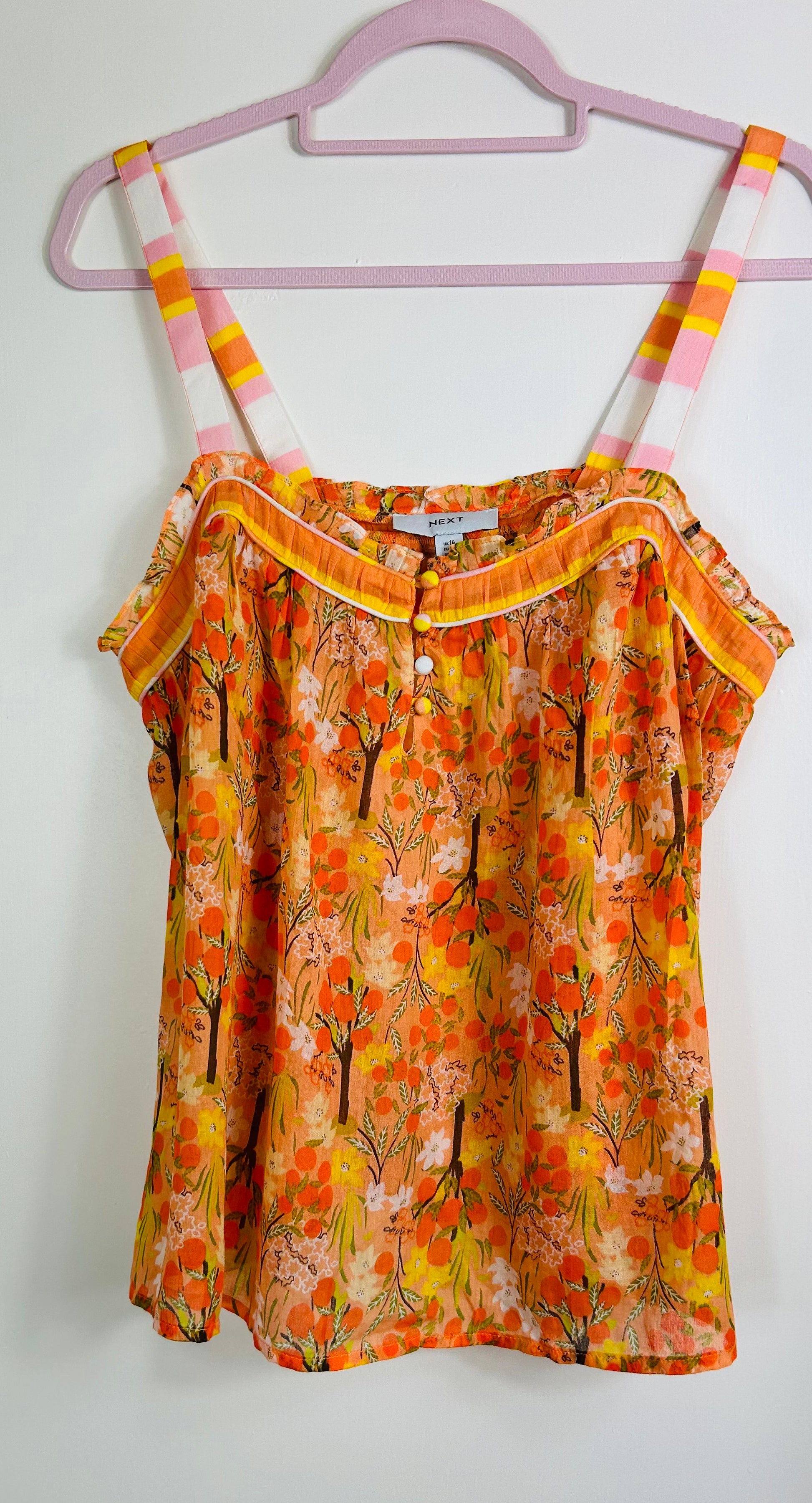 Multi Coloured Orange & Yellow NEXt Top. Two small cotton straps, frilled neckline with 4 small buttons on front