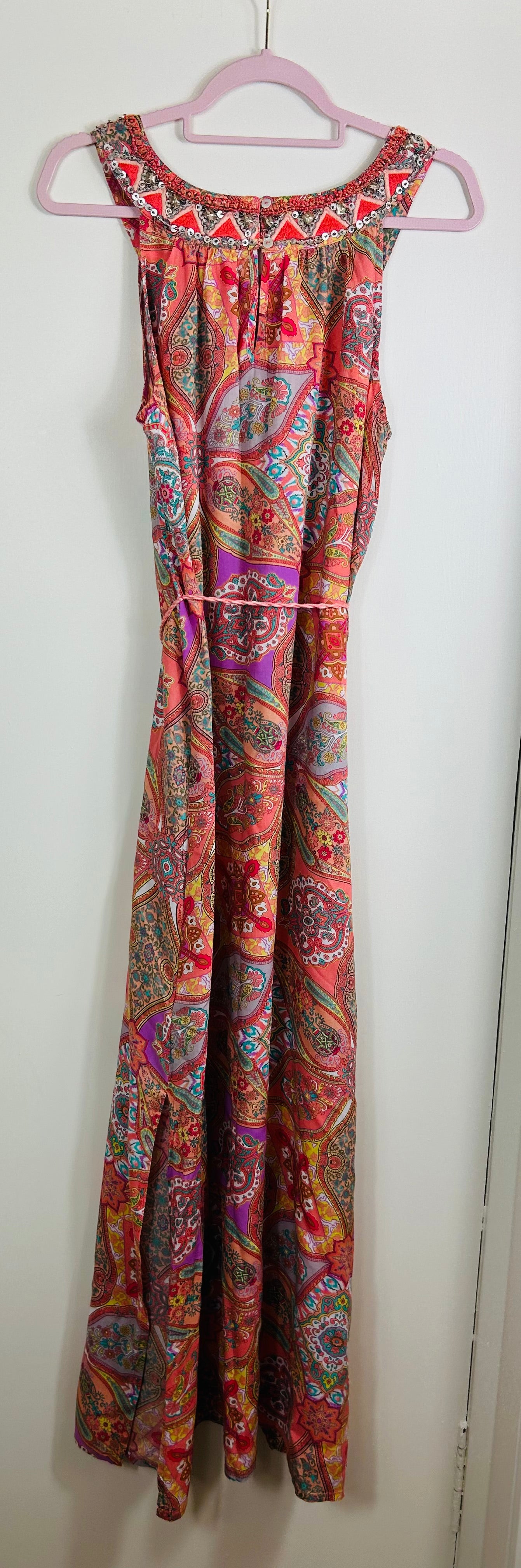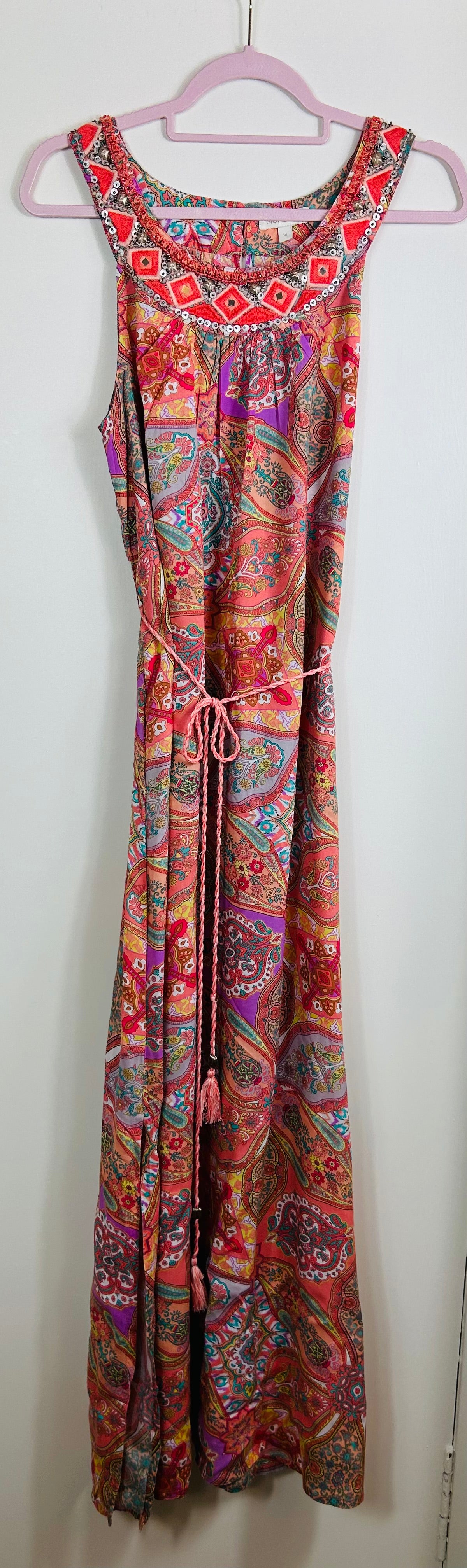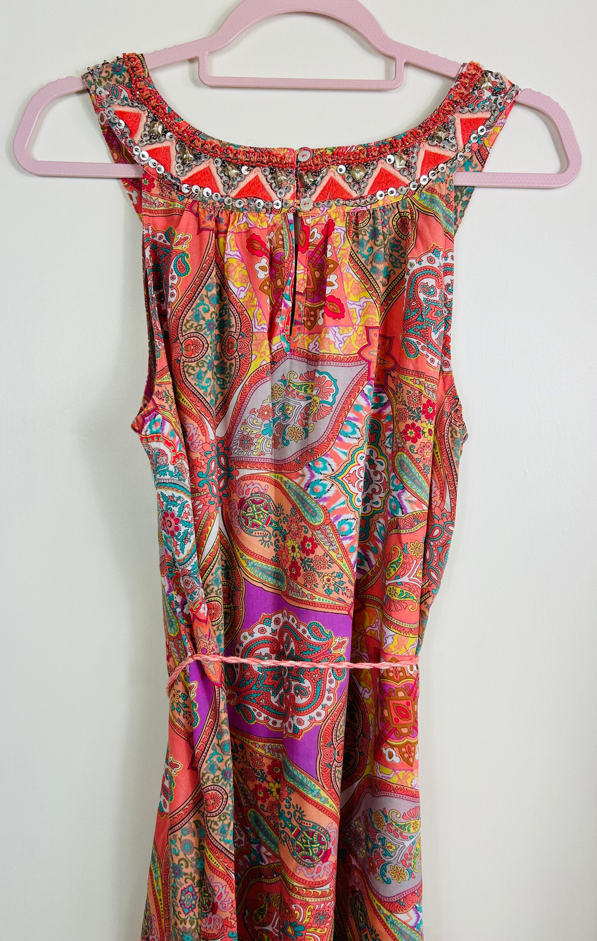 Multi Coloured Summer Dress. Round neck with sequins. Tie waist detail. Ankle length, split up either side