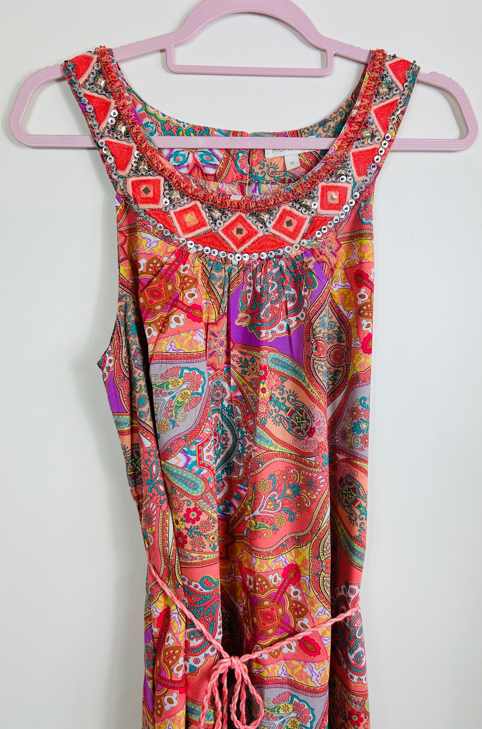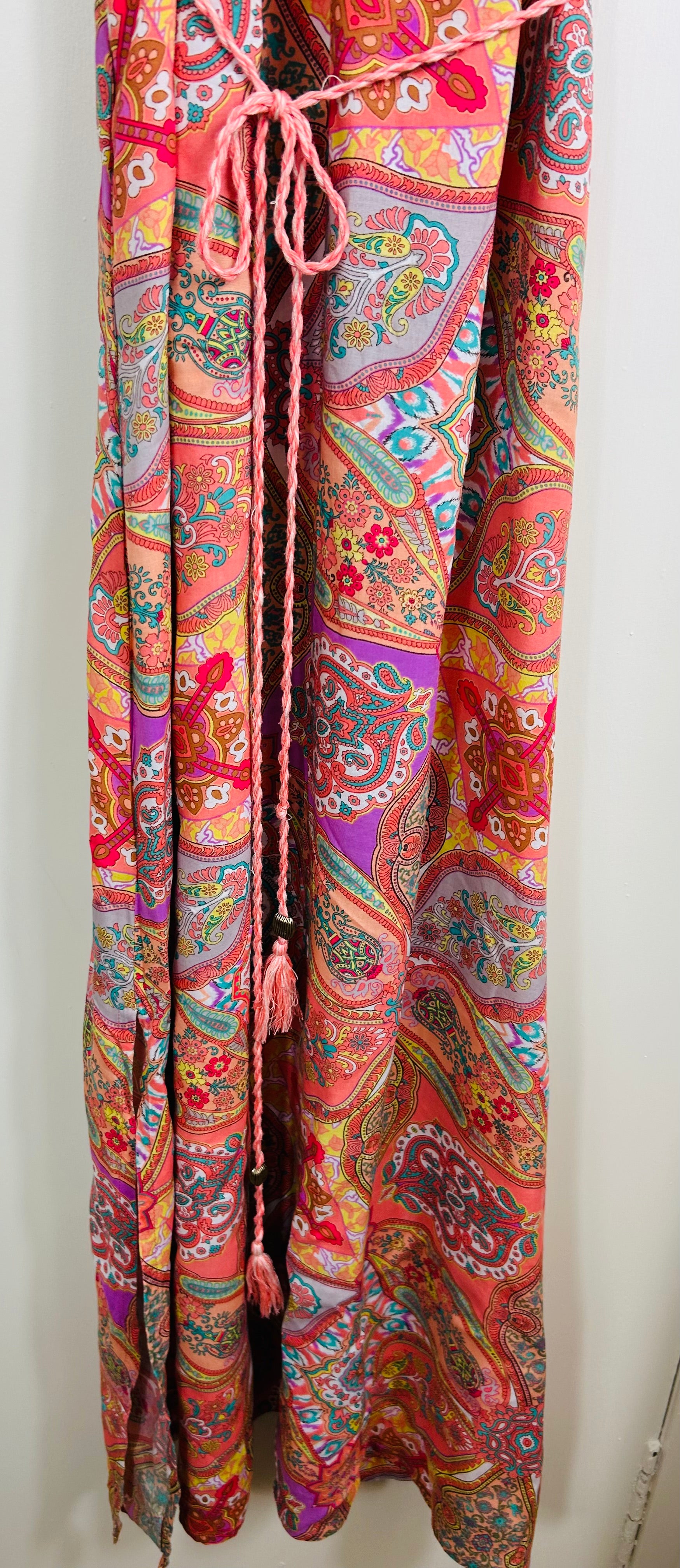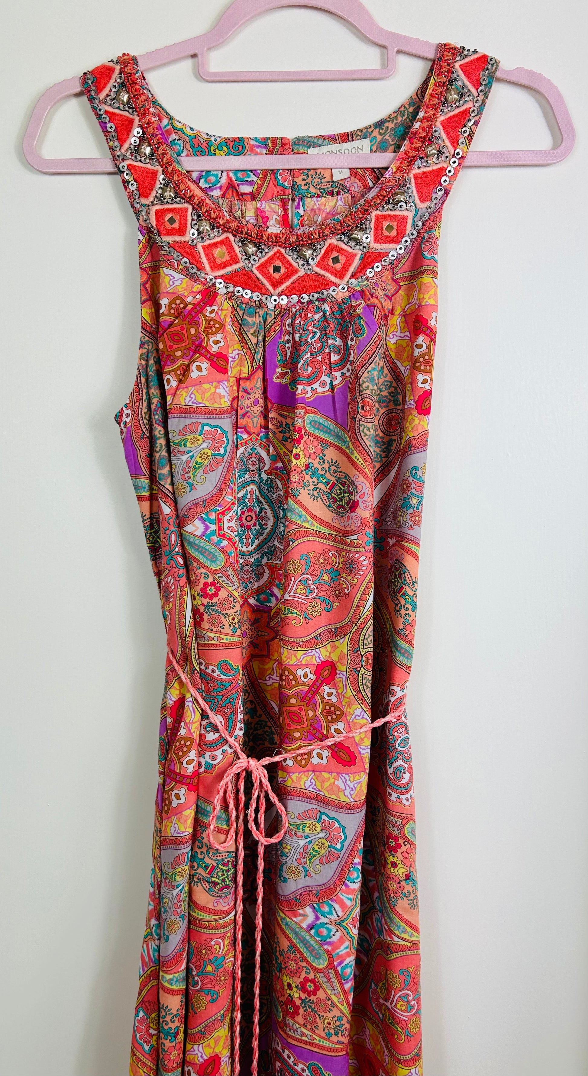 Multi Coloured Summer Dress. Round neck with sequins. Tie waist detail. Ankle length, split up either side