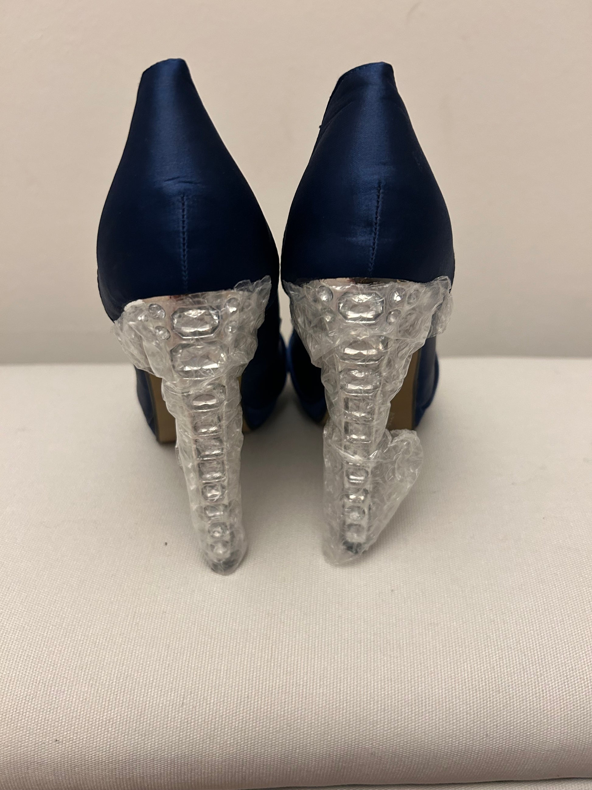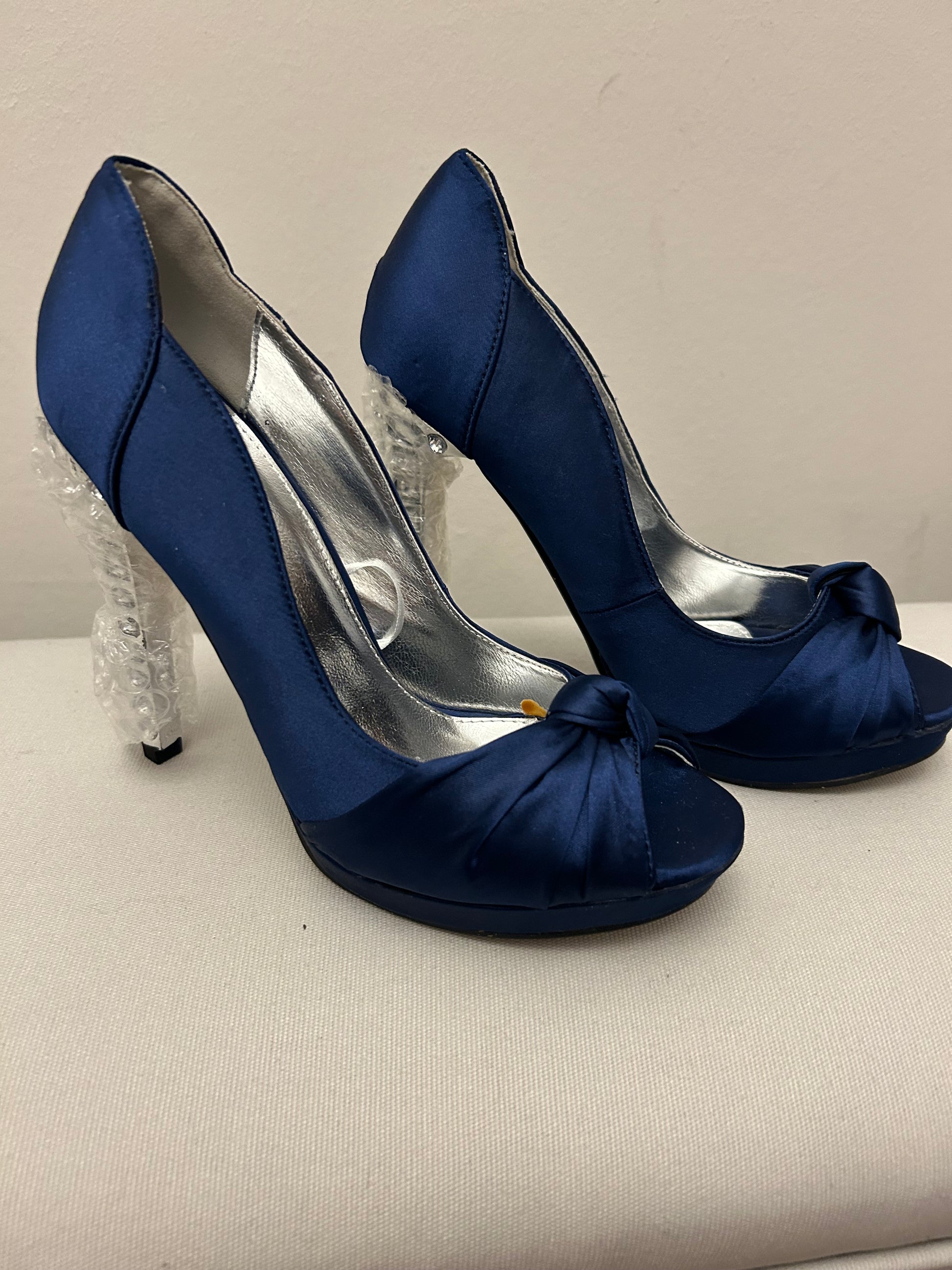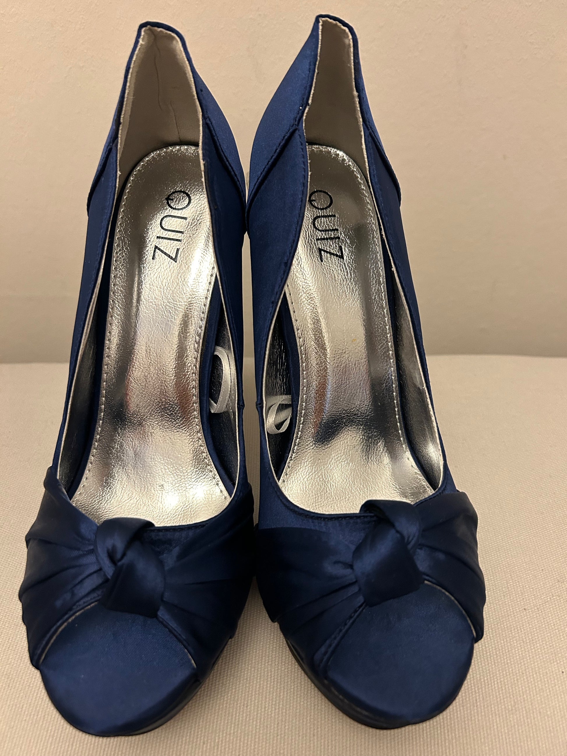 Navy Quiz Satin Heeled Shoes. Peep toe with knotted detail. Full shoe with silver diamanté heel
