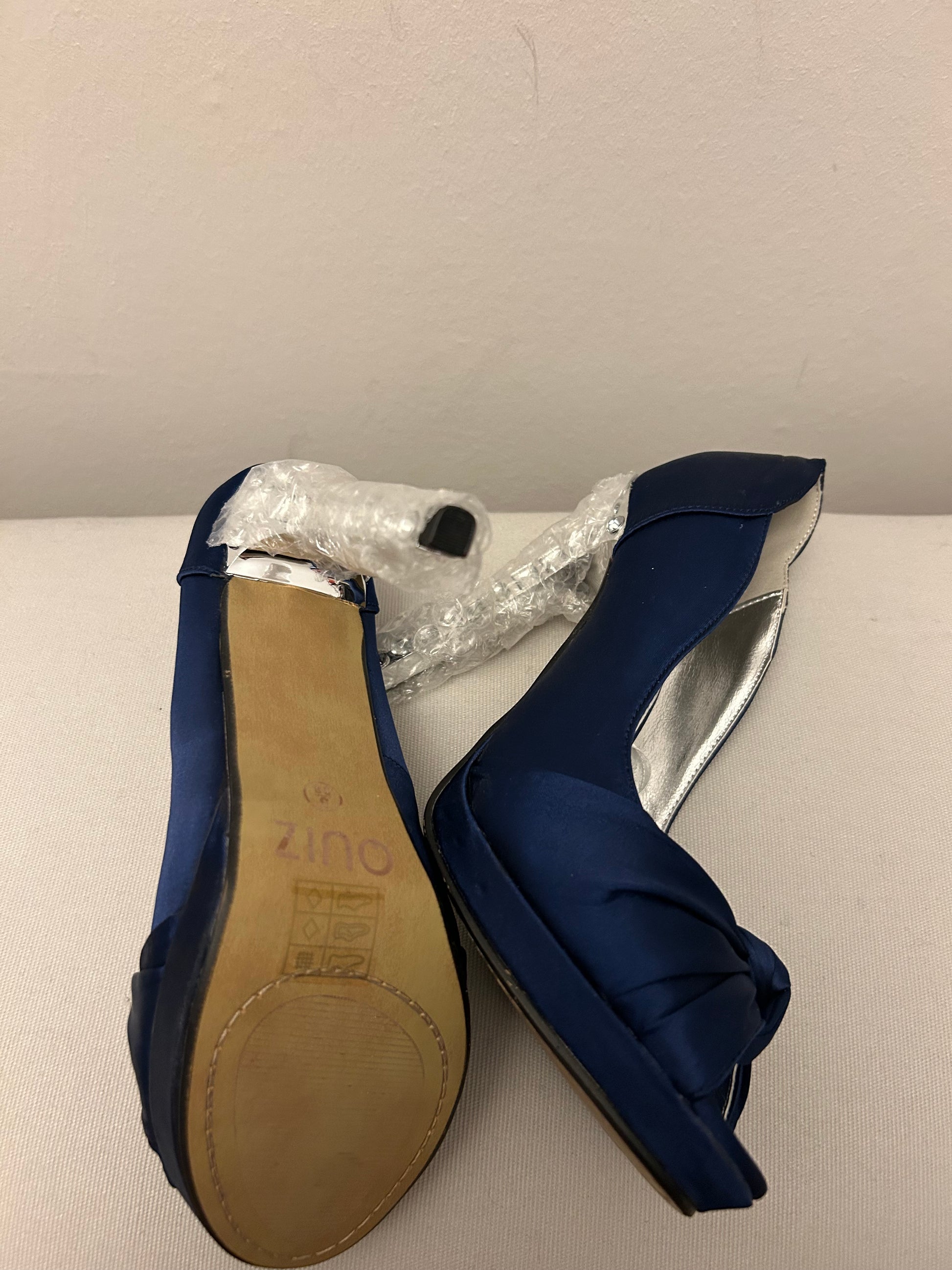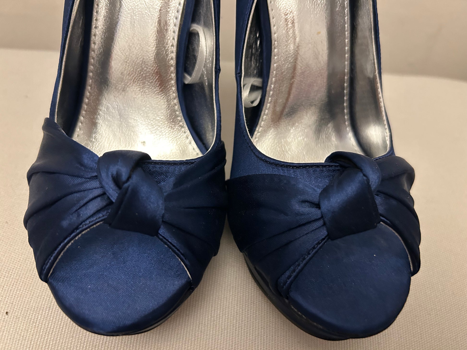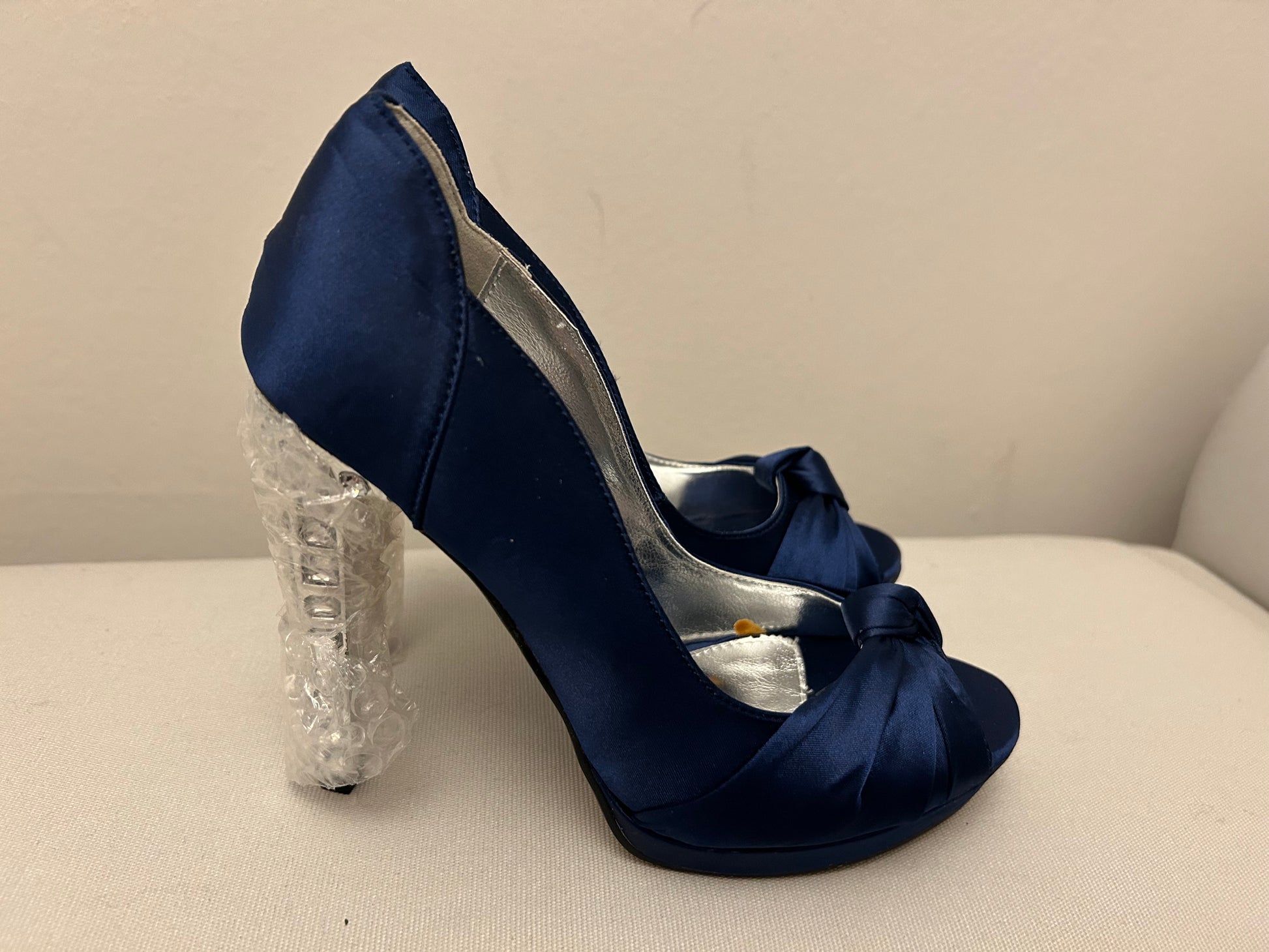 Navy Quiz Satin Heeled Shoes. Peep toe with knotted detail. Full shoe with silver diamanté heel