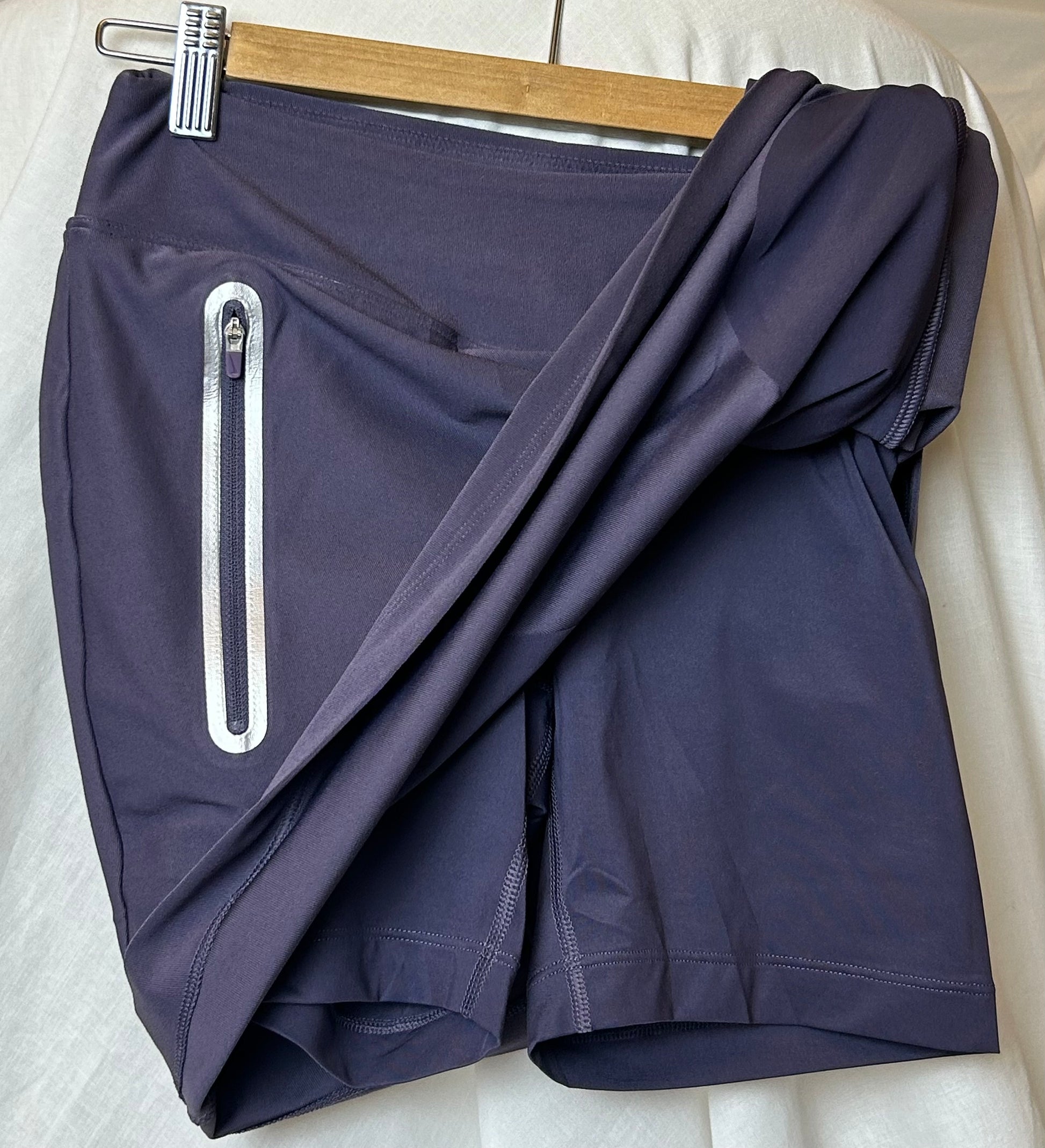 Ladies Golf/Tennis Skirt with internal shorts. Mauve/ purple in colour, two front pockets with silver trim