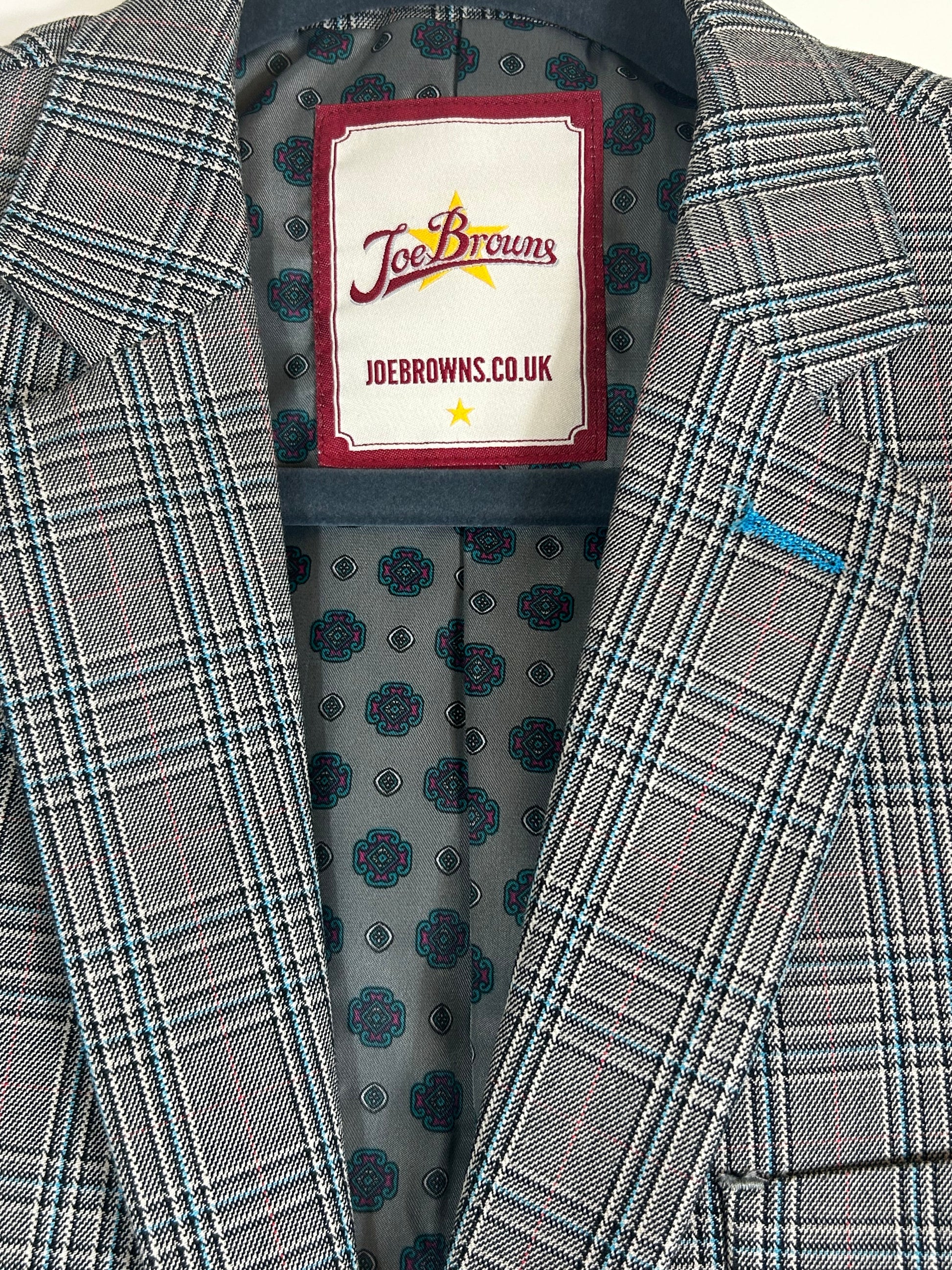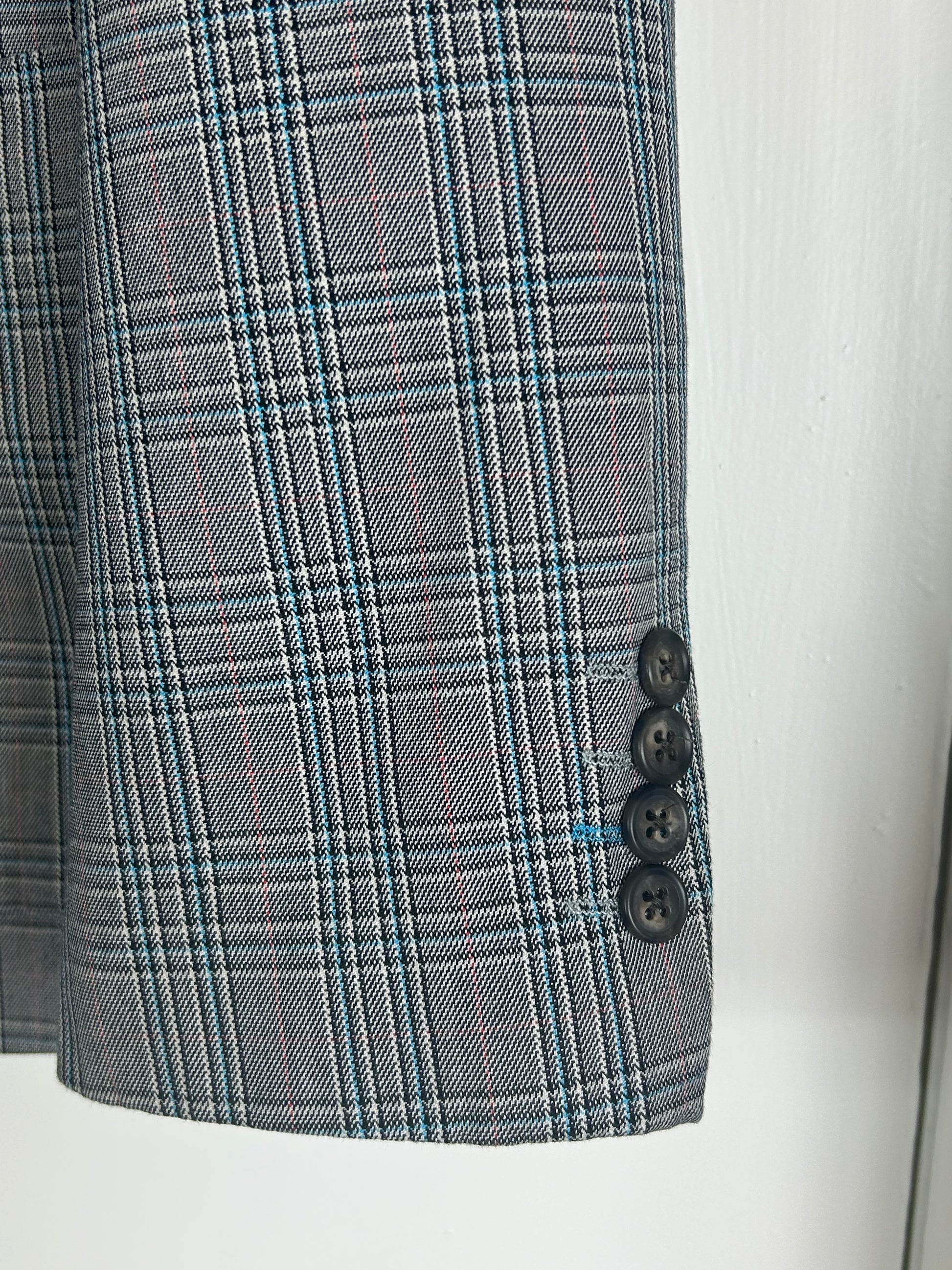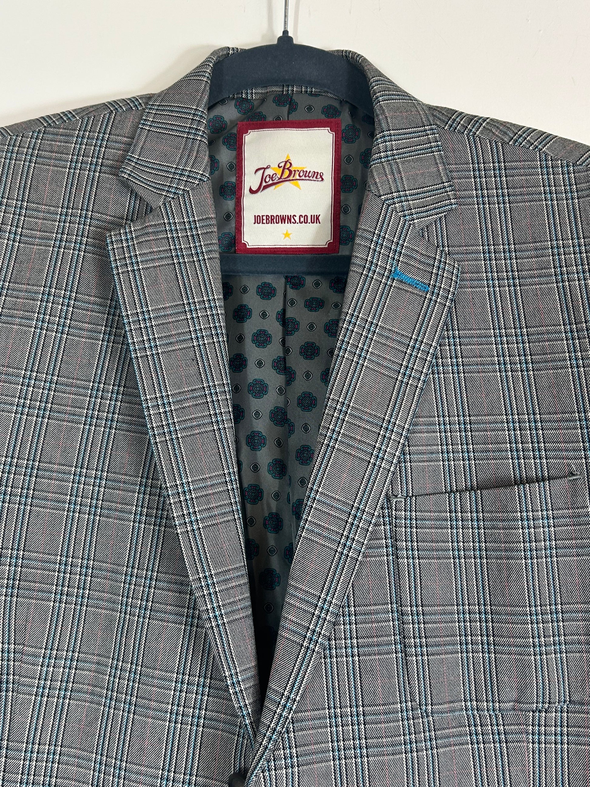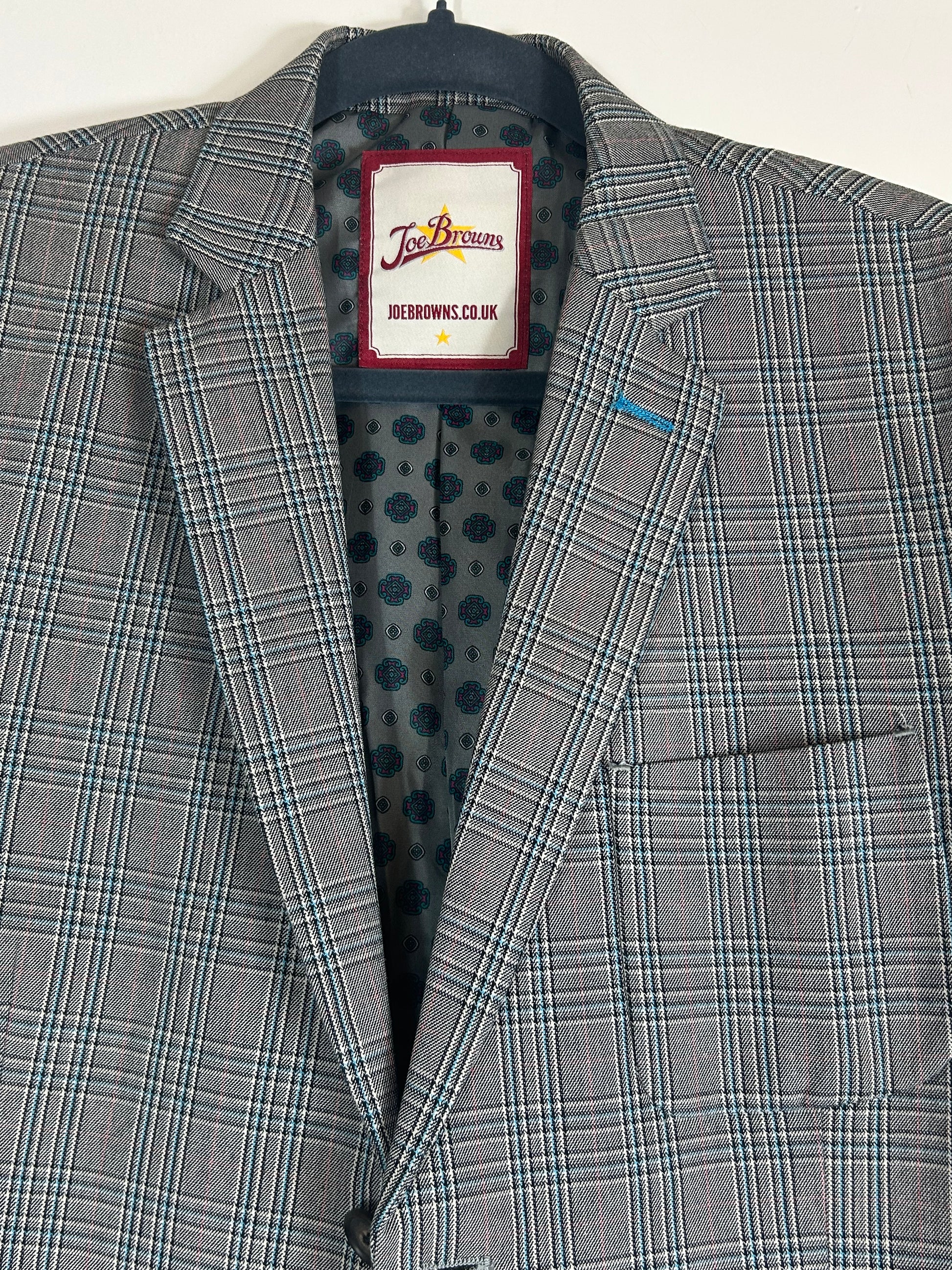 Pale Grey & Blue Checked Jacket. Two button front & three front pockets. Fully Lined