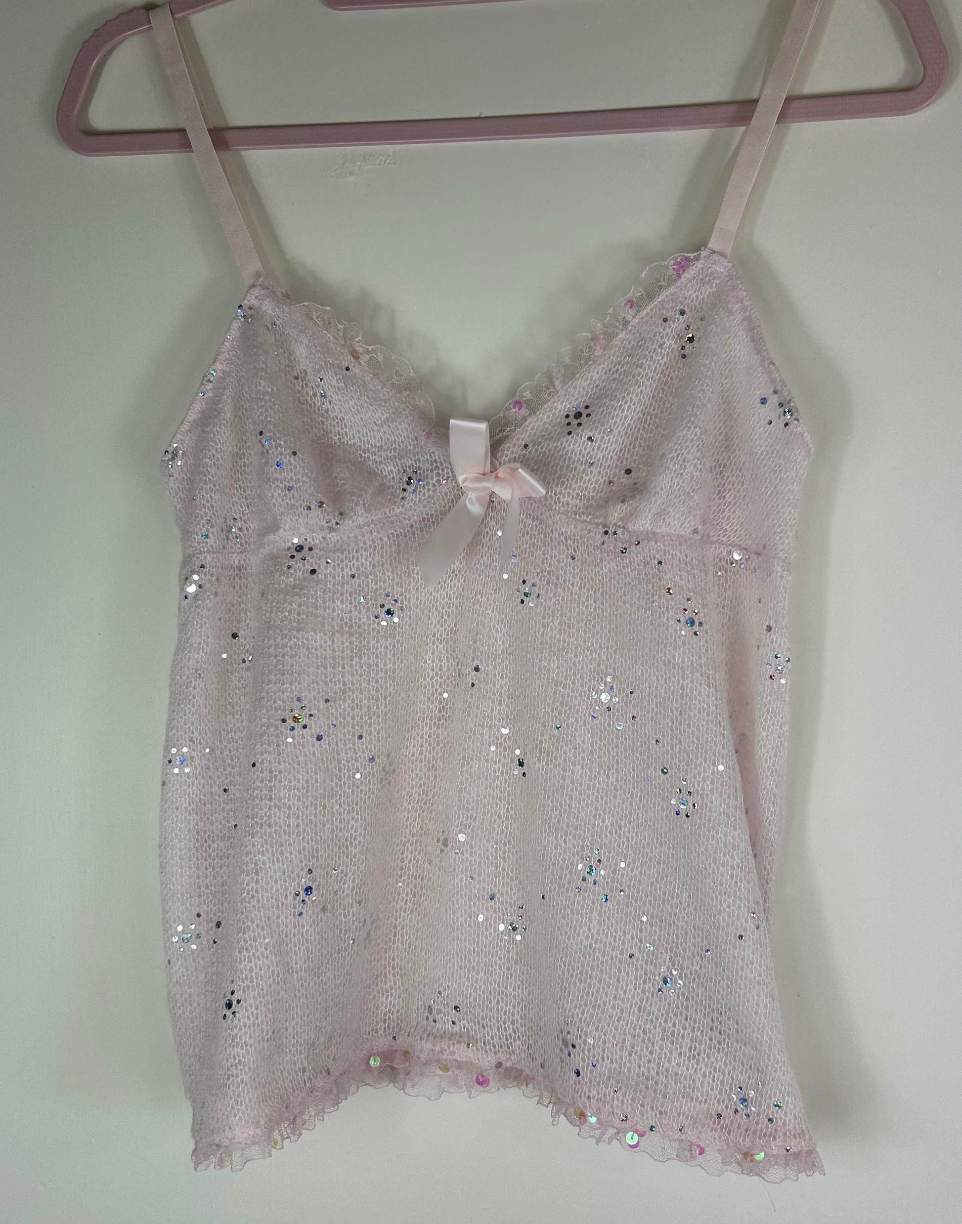 Pale Pink LA Senza Summer Pyjamas. Fine knit shimmery vest Top with shoestring straps and sequins bow at front.
