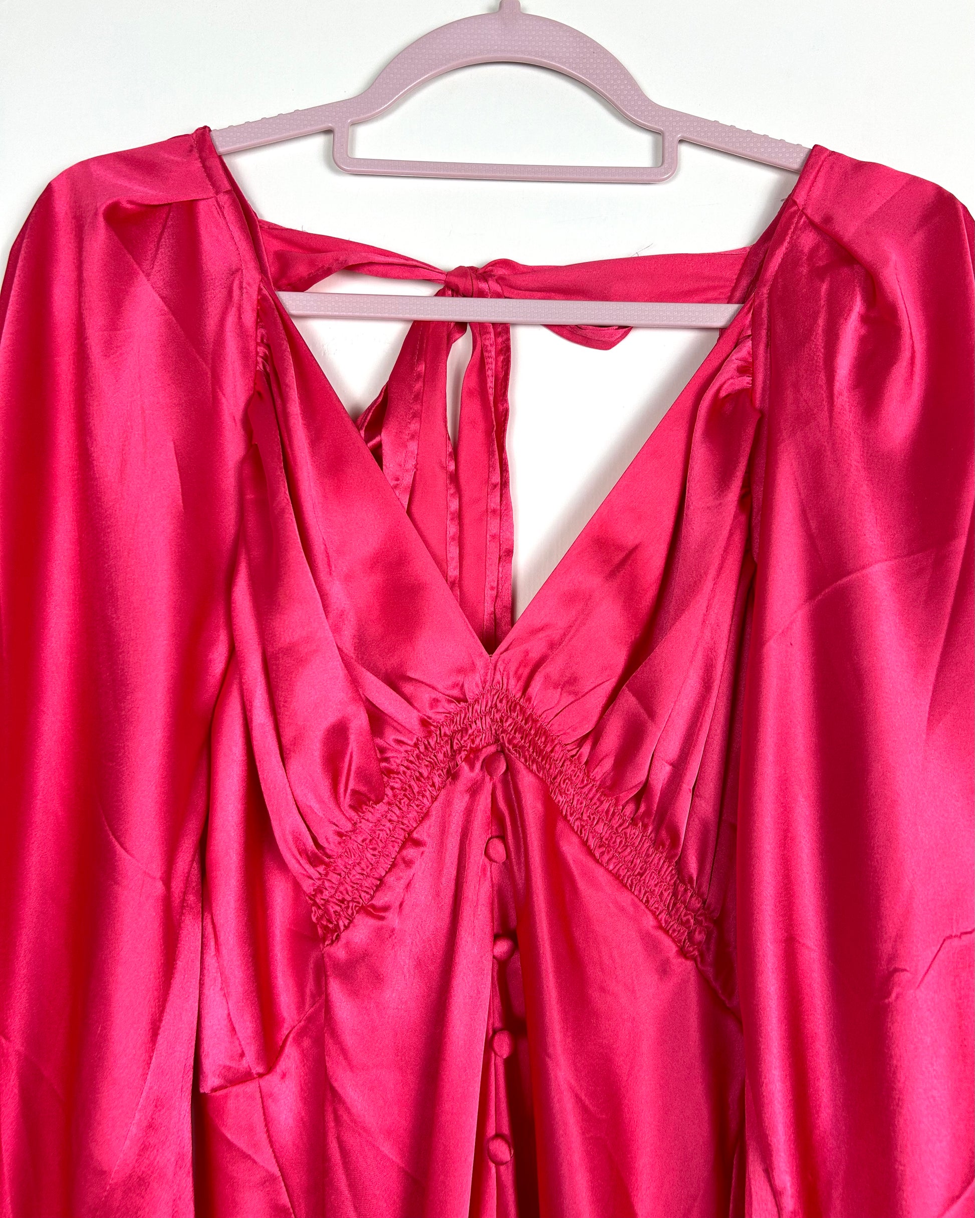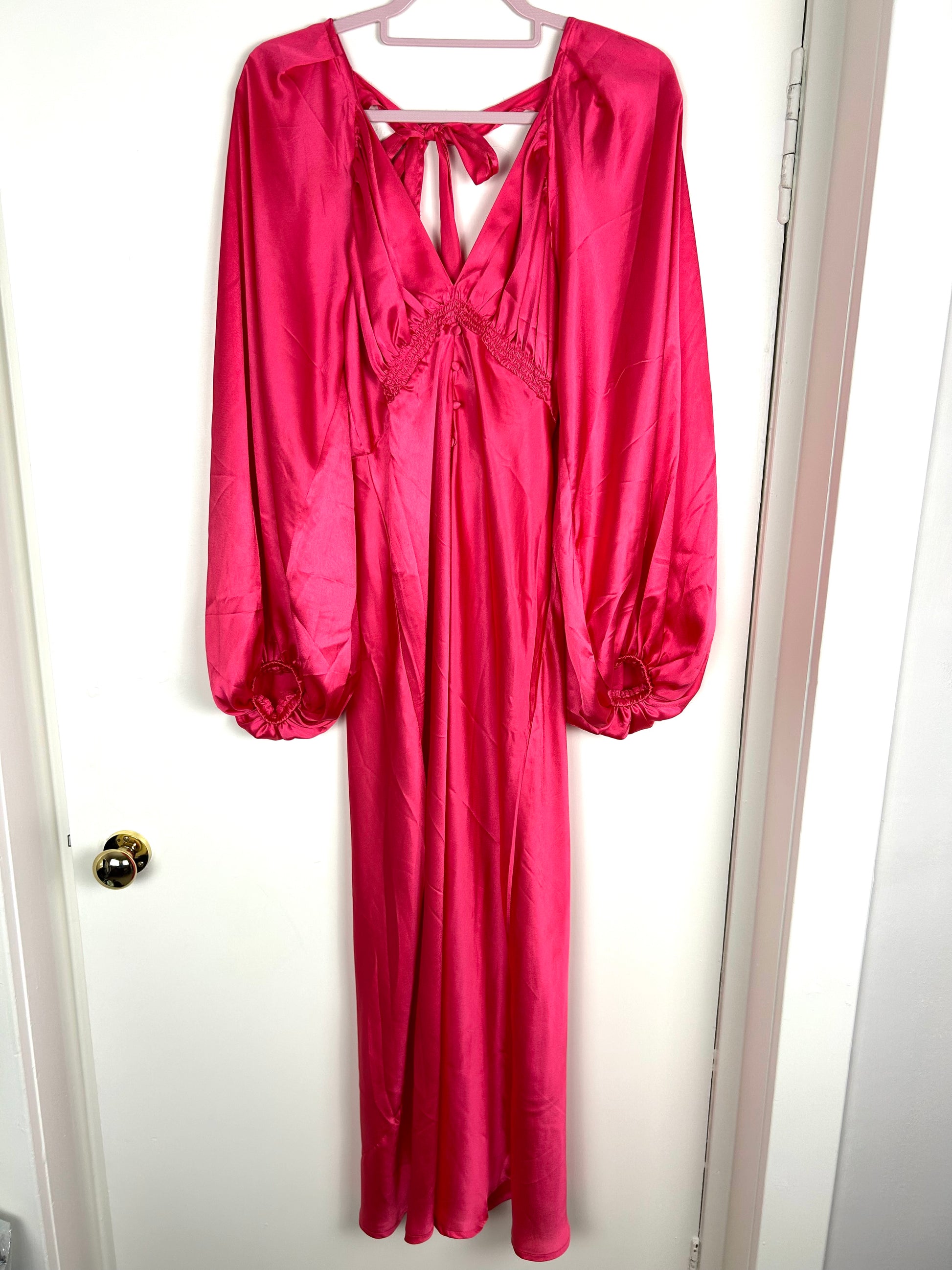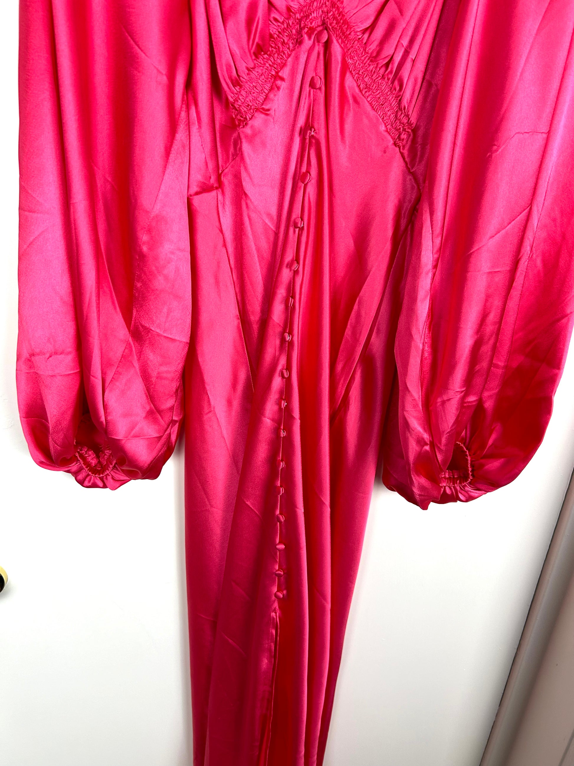 Hot pink long puff sleeved silk look dress. Material polyester. Long puffed sleeves, tie back f neck, button front, gathered front at bust, split front.