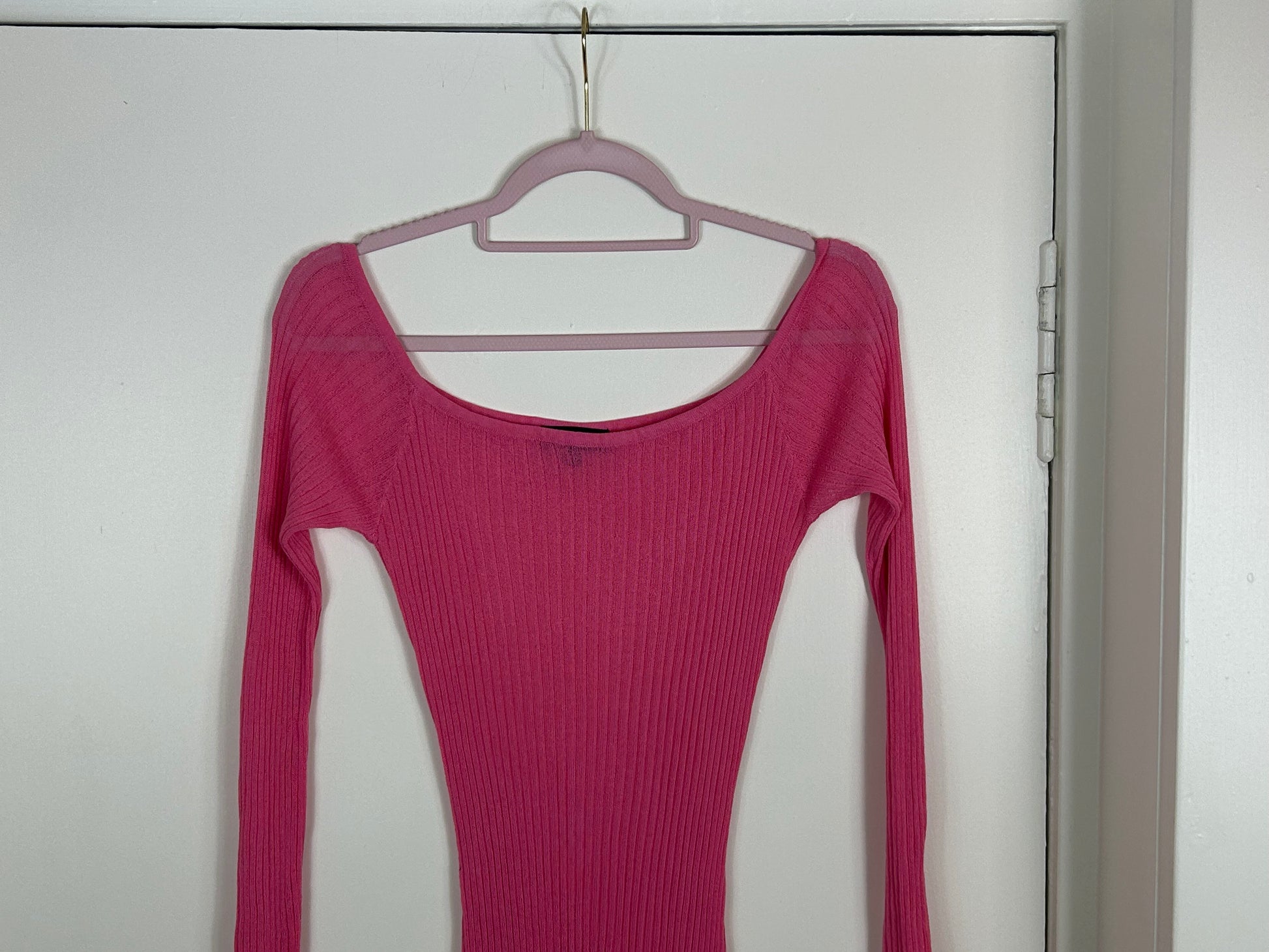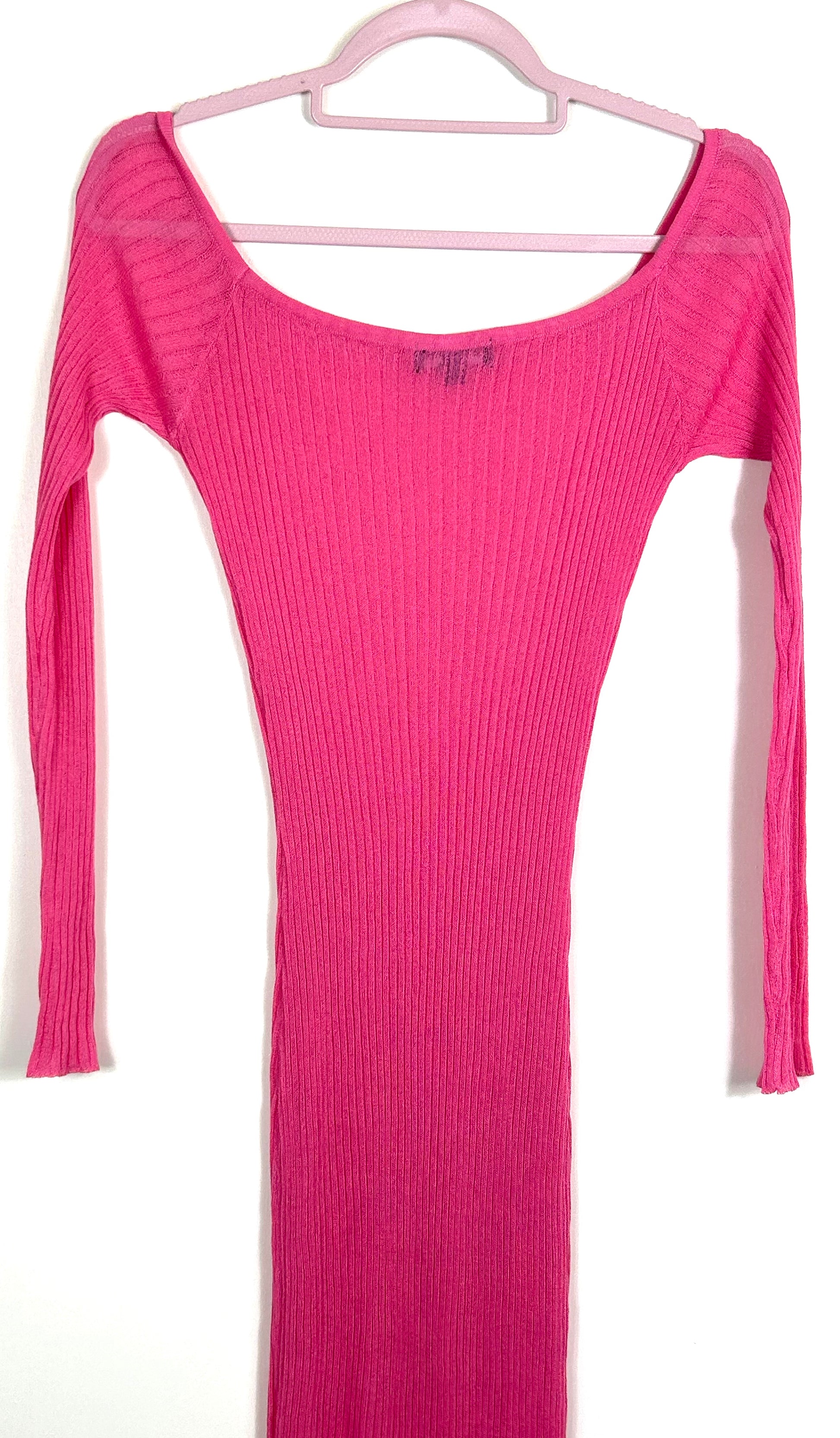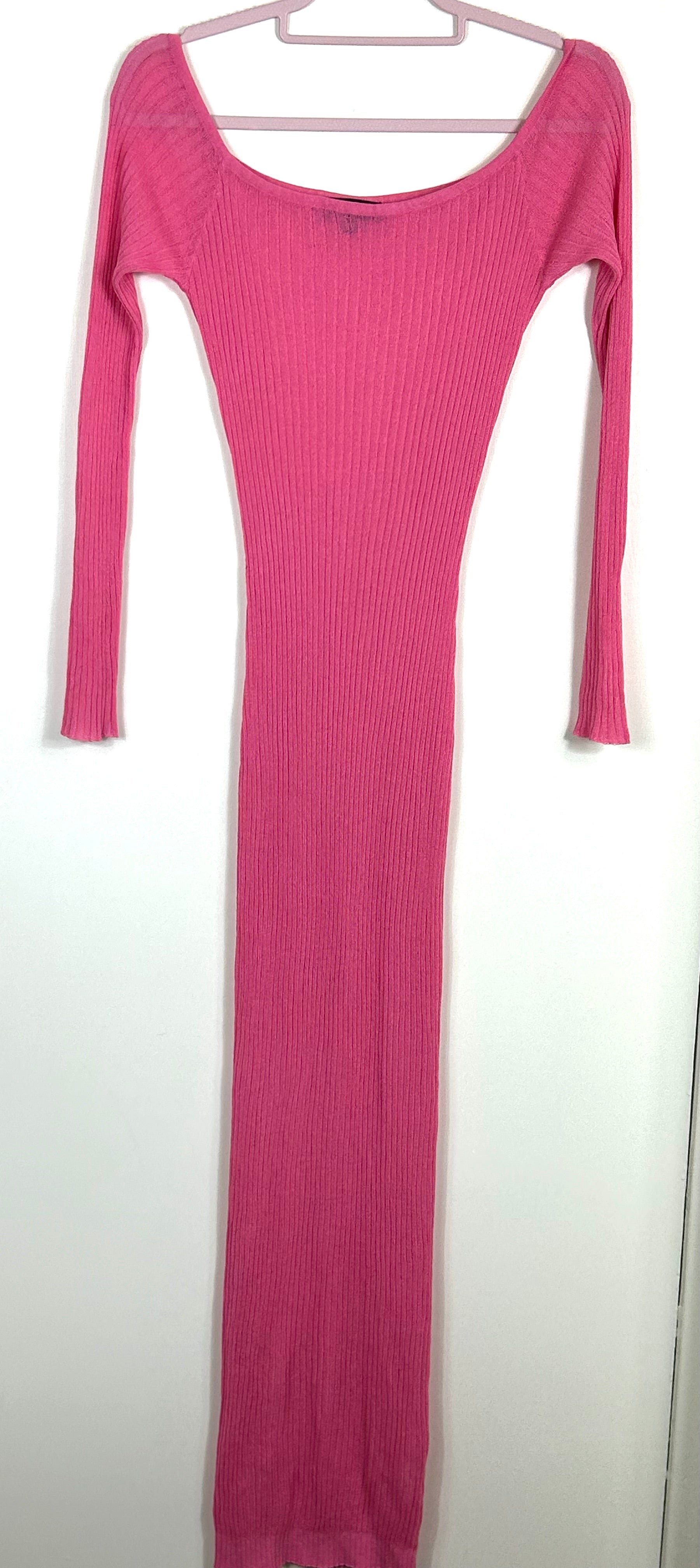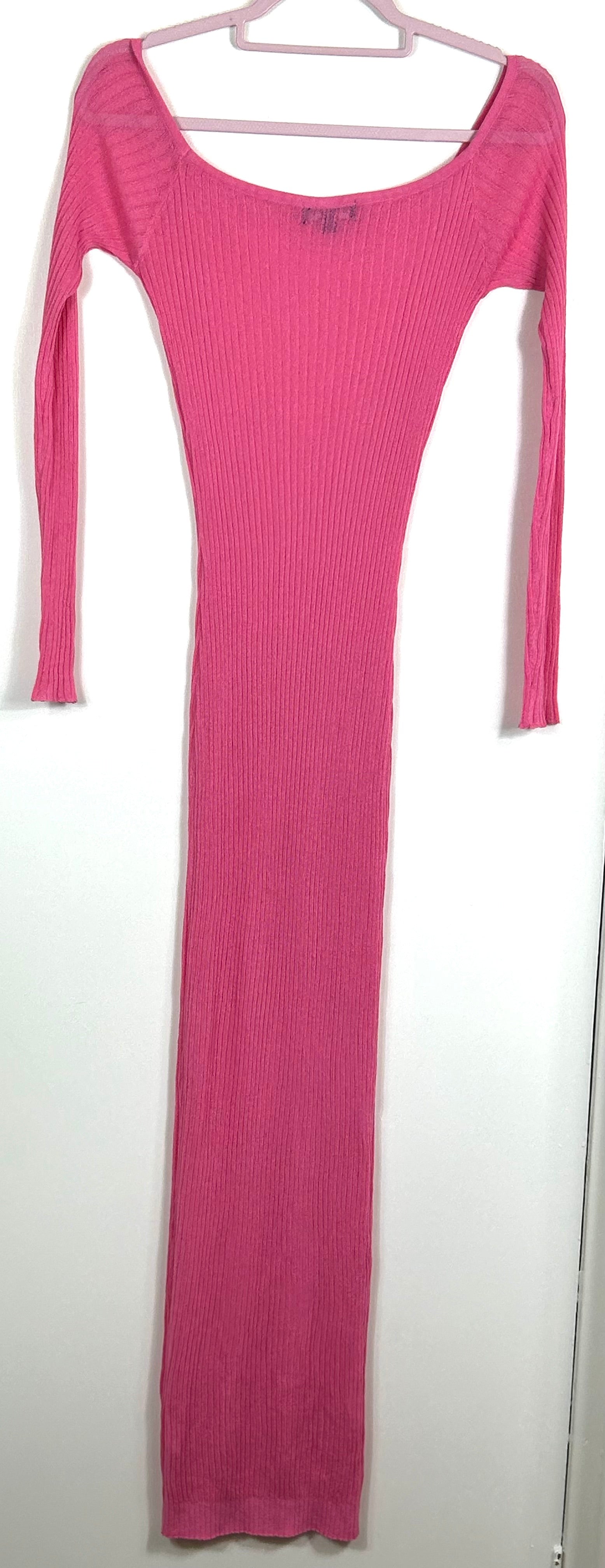 Pink Long Knitted Style Dress, material is viscose & nylon. Long sleeved with scoop neck