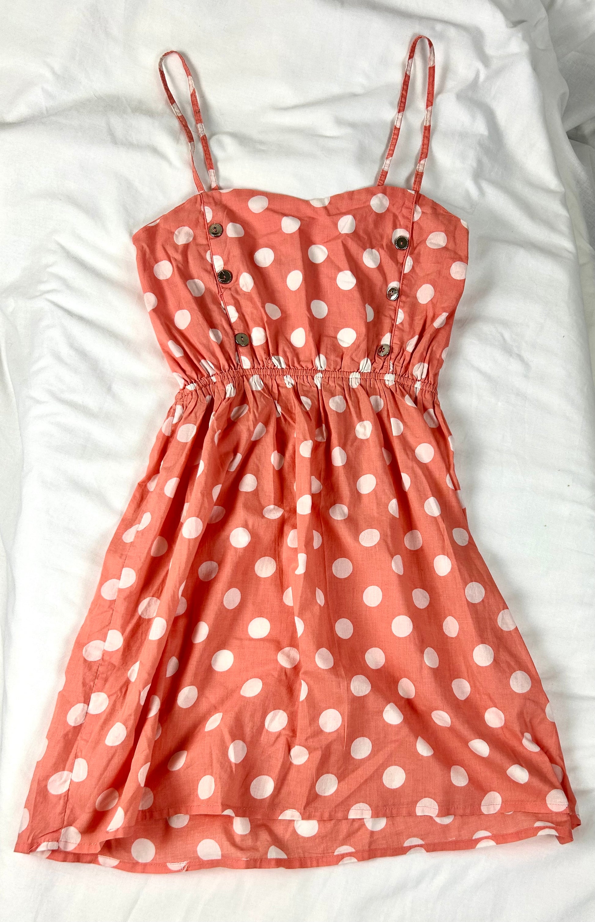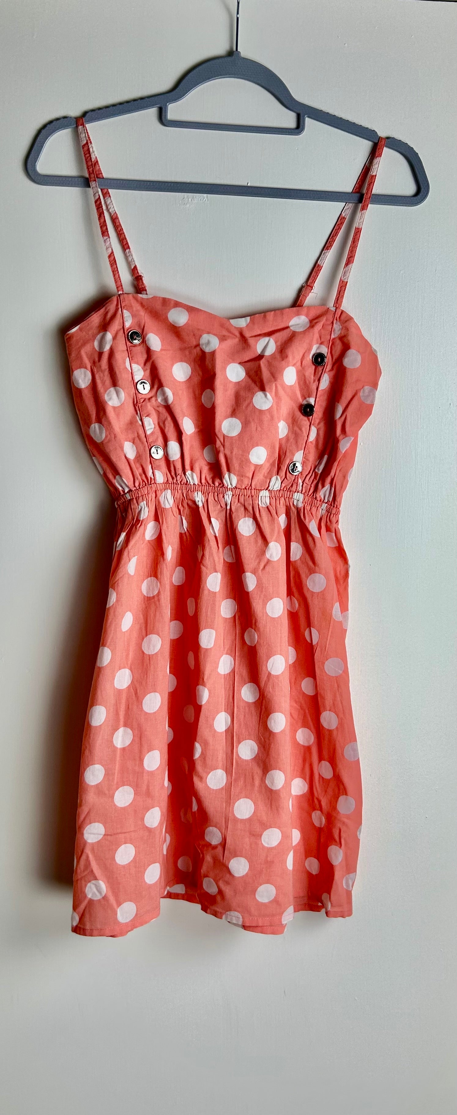 Peach with white polka dots cotton summer dress. Six metal button on front bust, shoe string straps, short in length