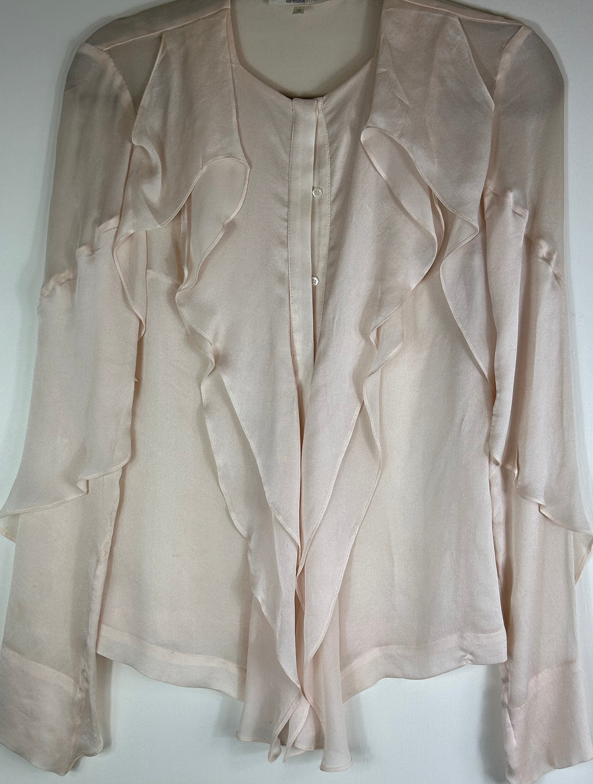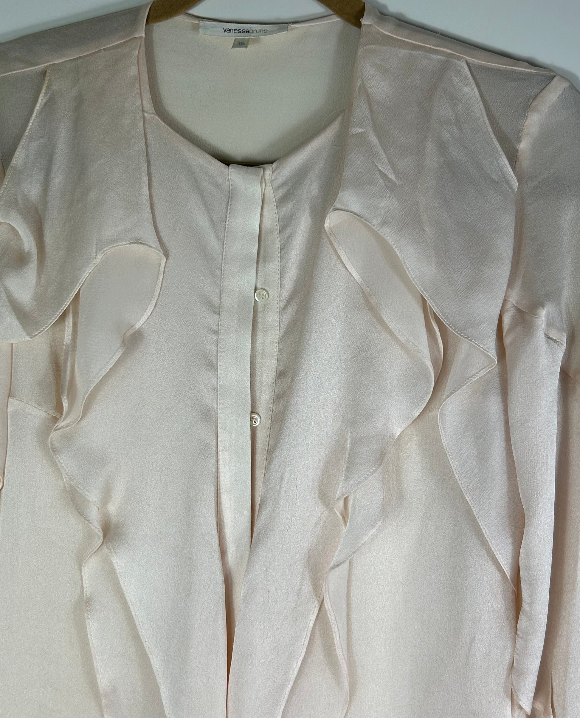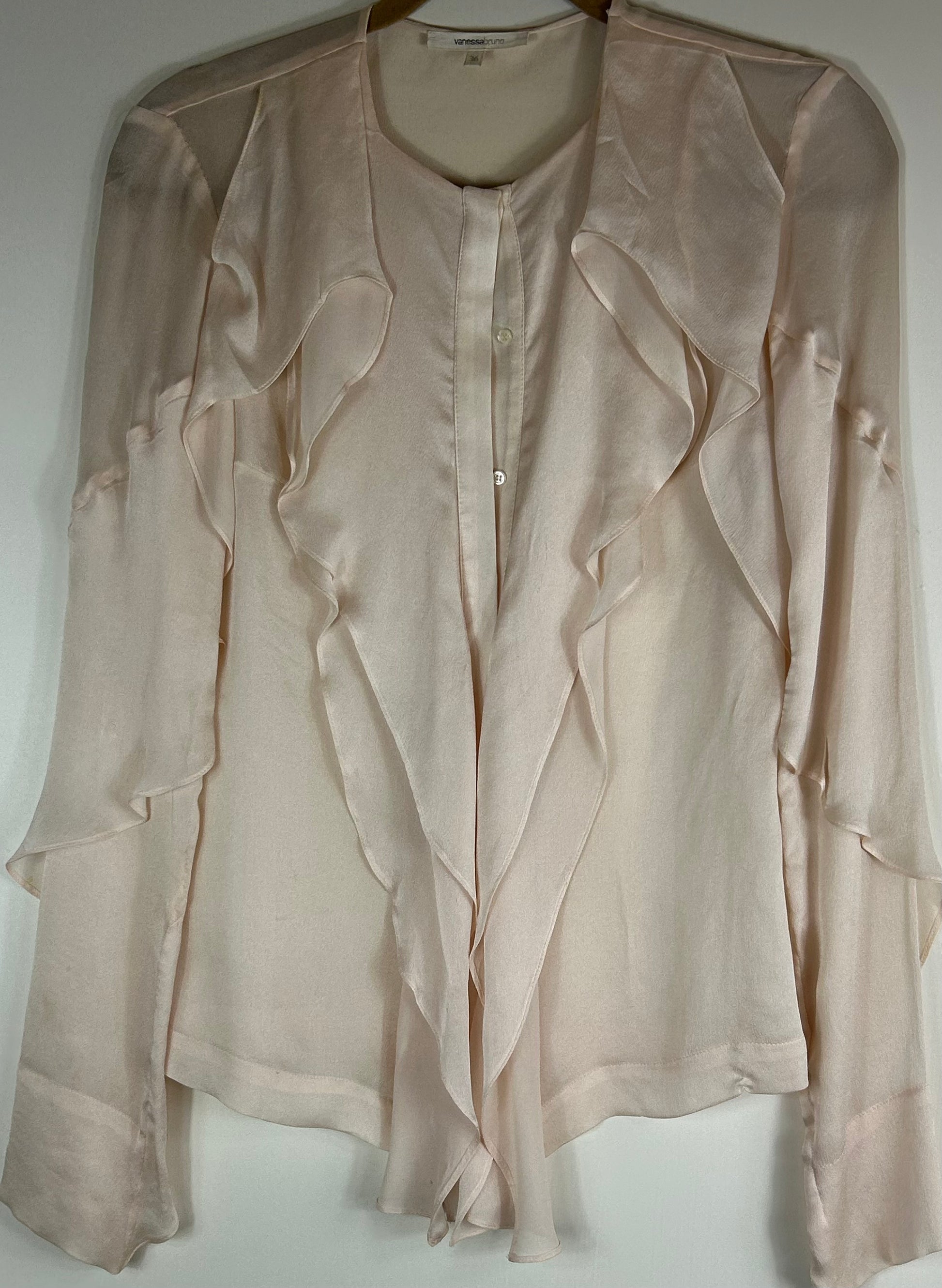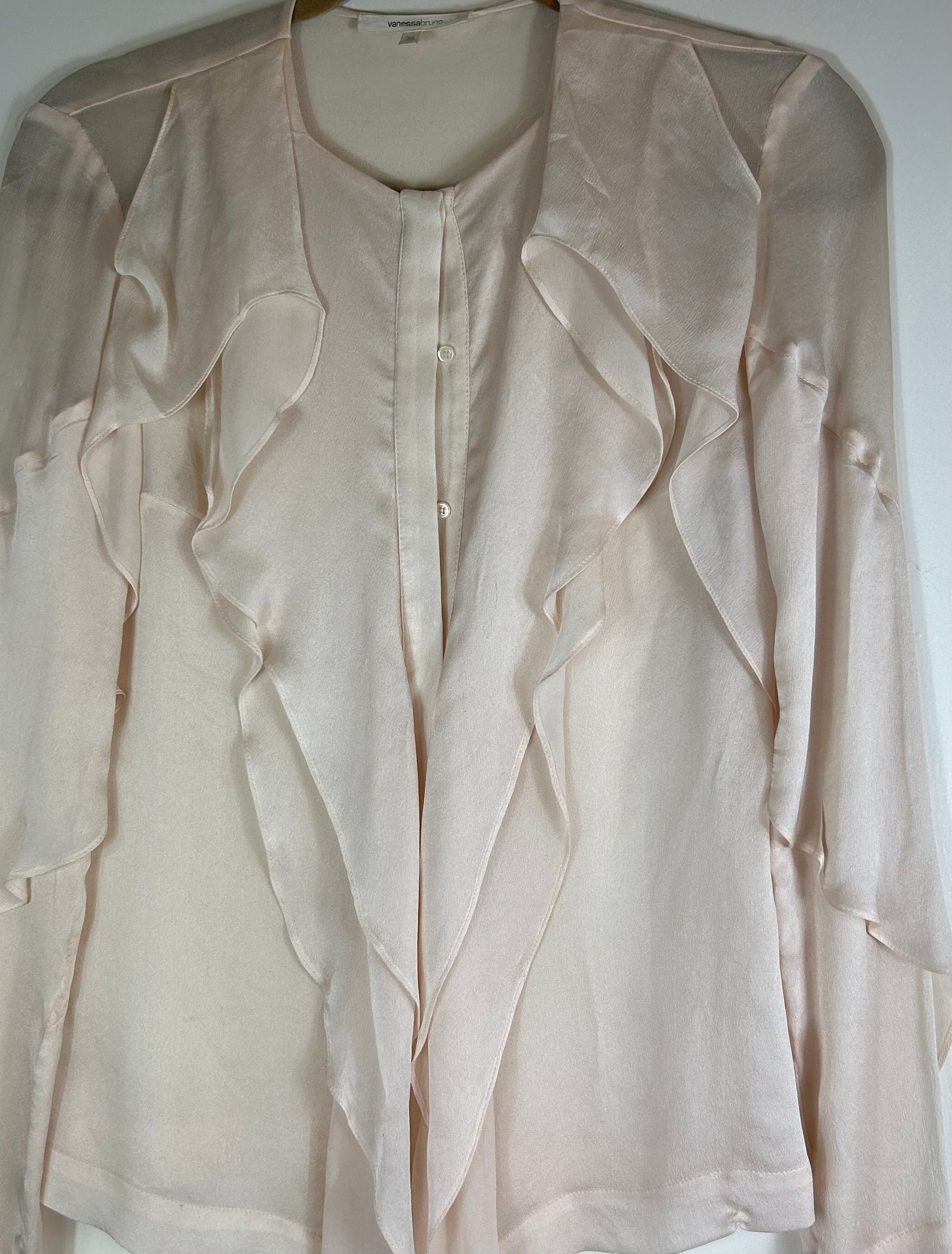 Vanessa Bruno pale peach silk blouse, round neck with tail. Frill and button front & frill down sleeves