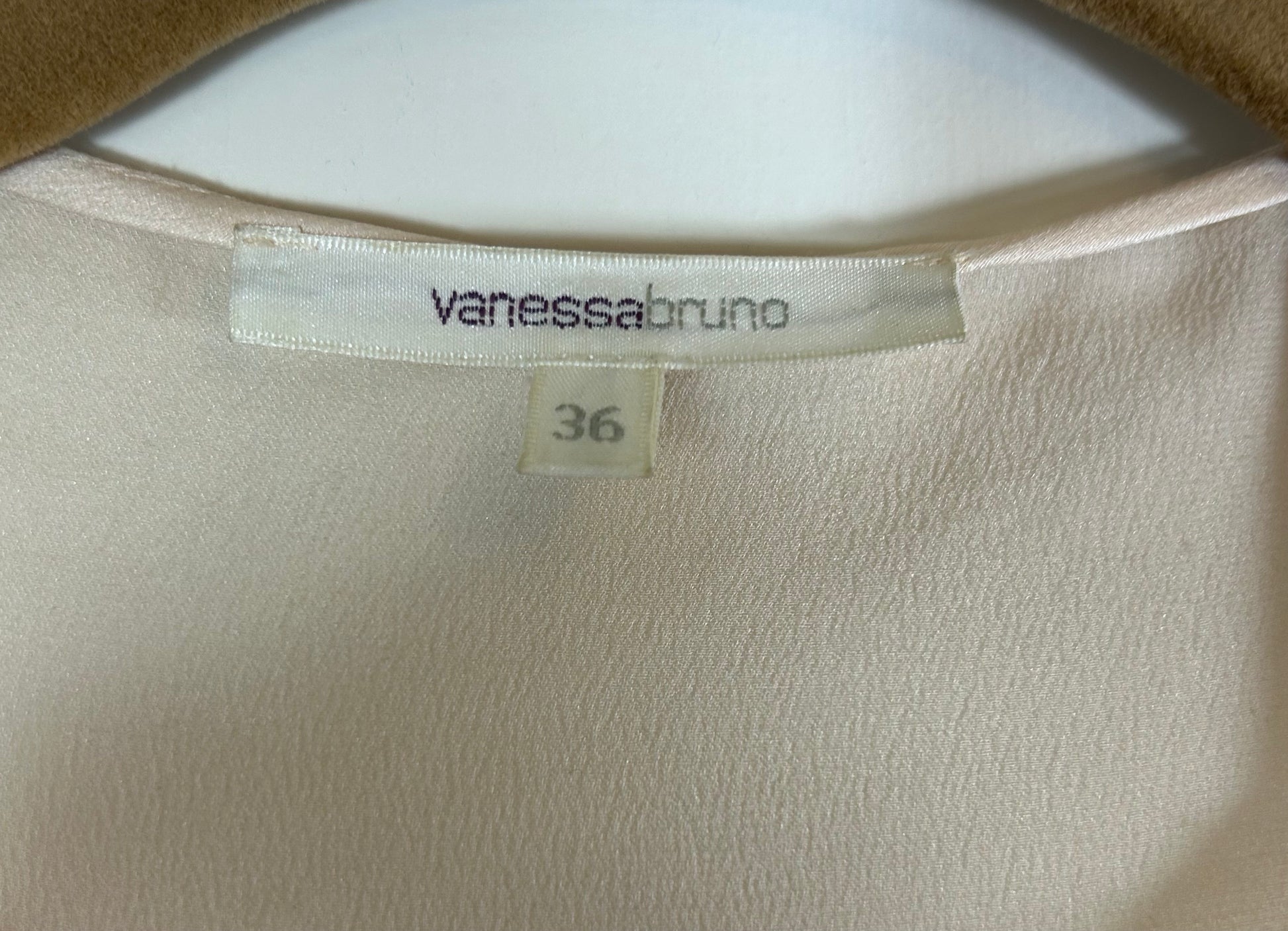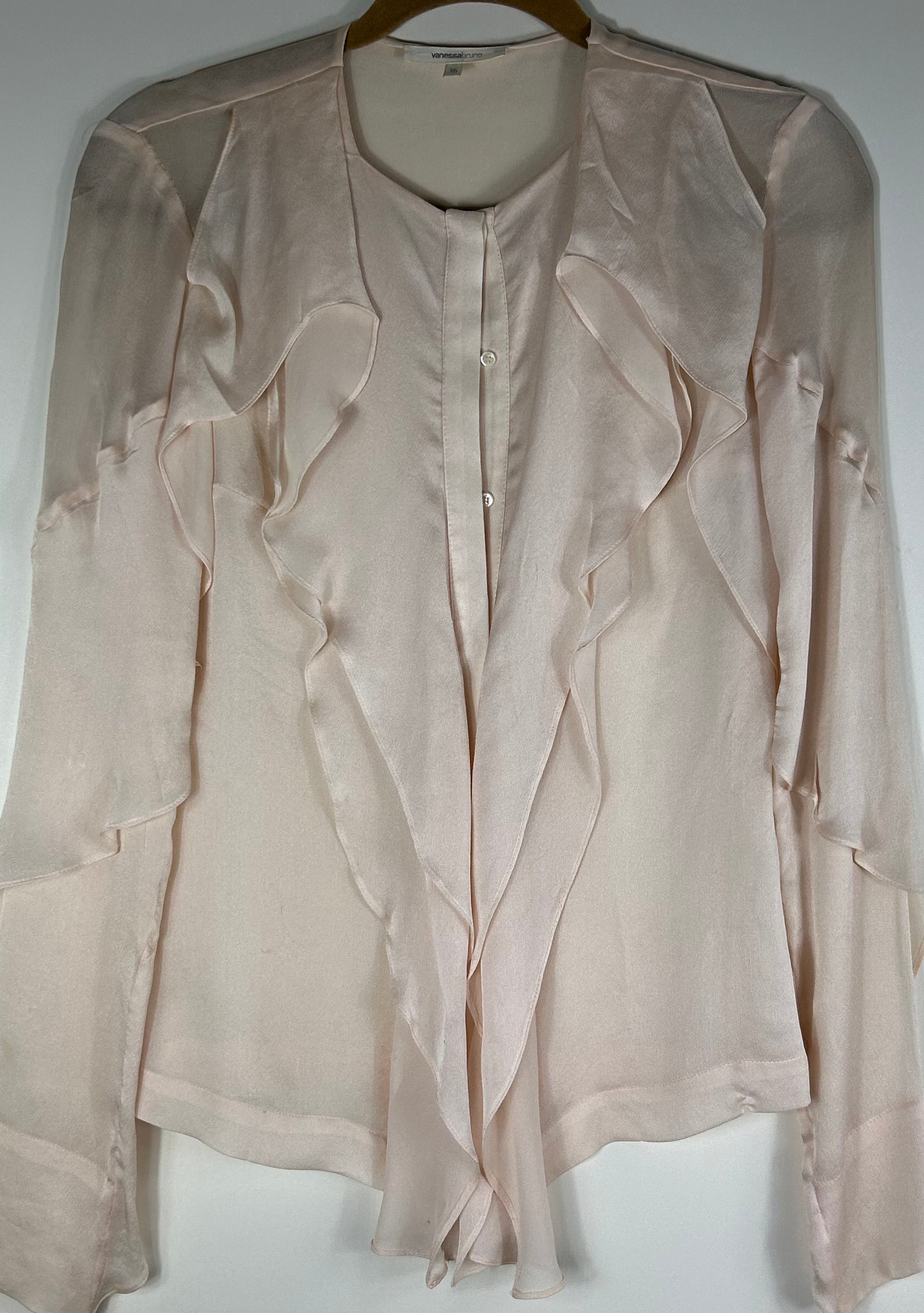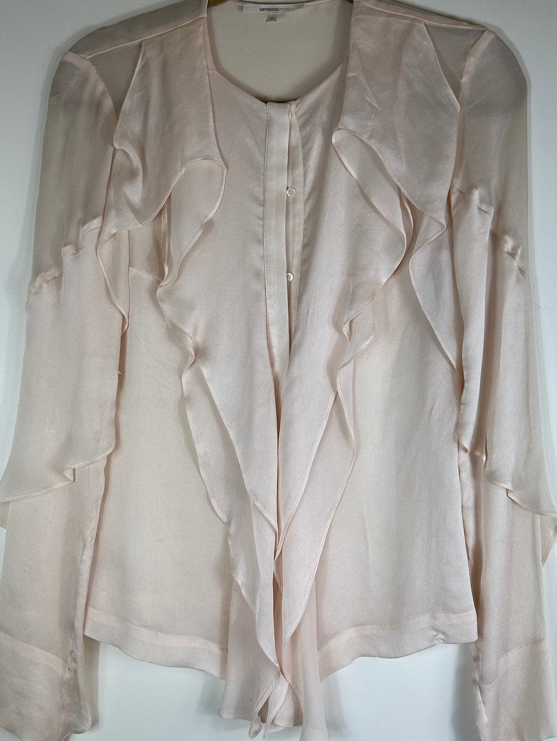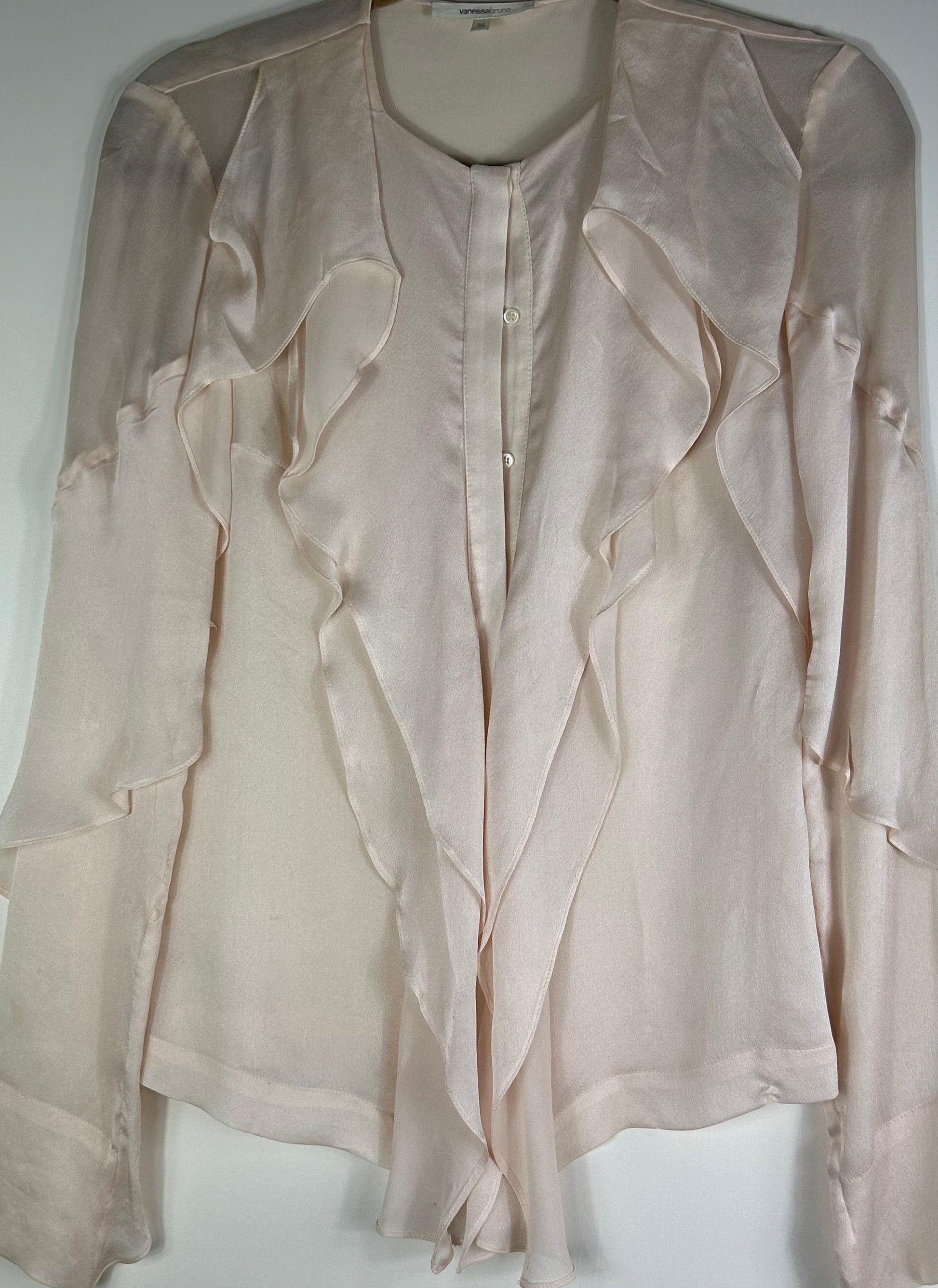 Vanessa Bruno pale peach silk blouse, round neck with tail. Frill and button front & frill down sleeves