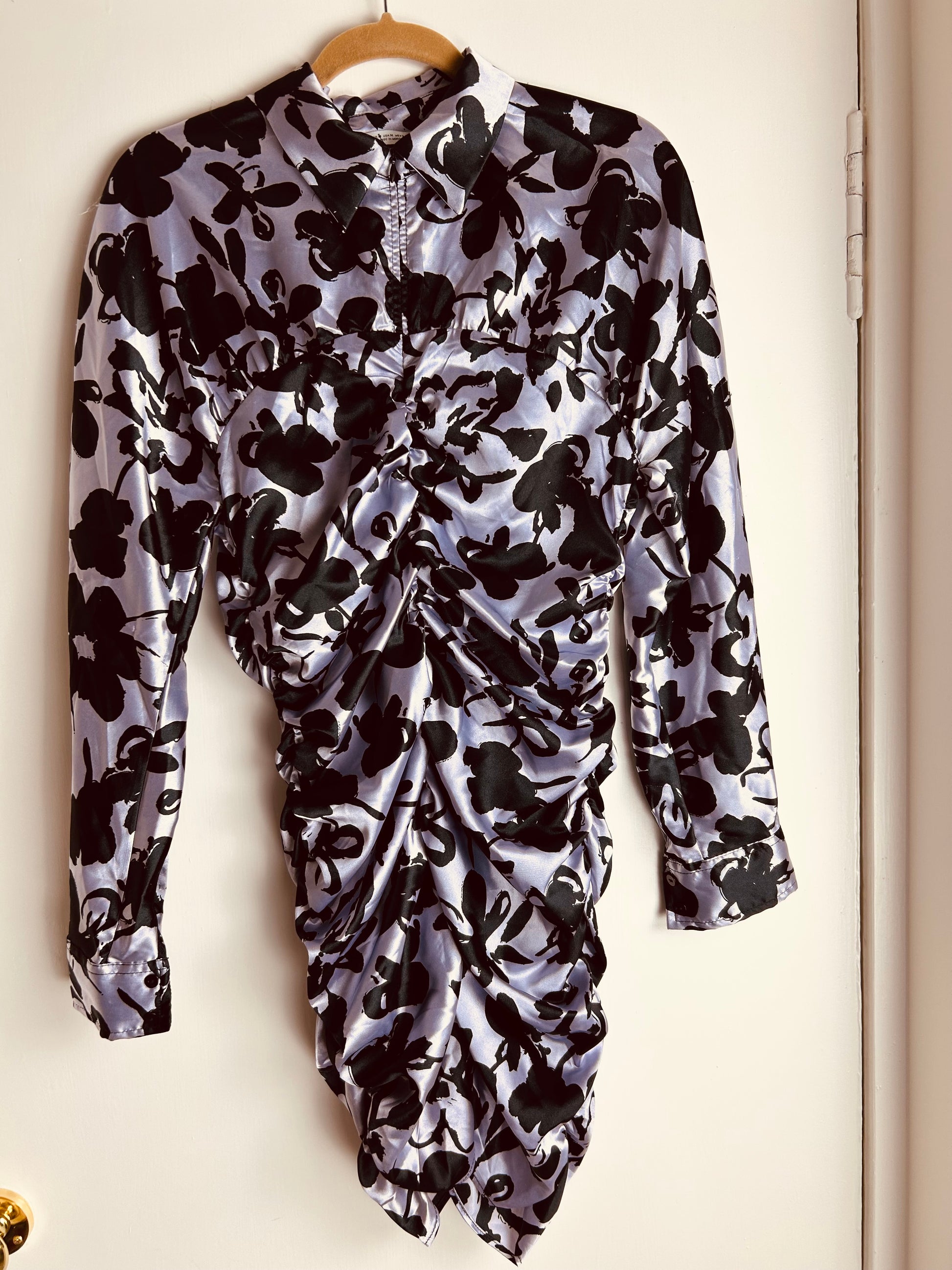 Ladies black & Lilac satin short dress. Long sleeves, side and front ruched. Front zip fastening. Worn Once