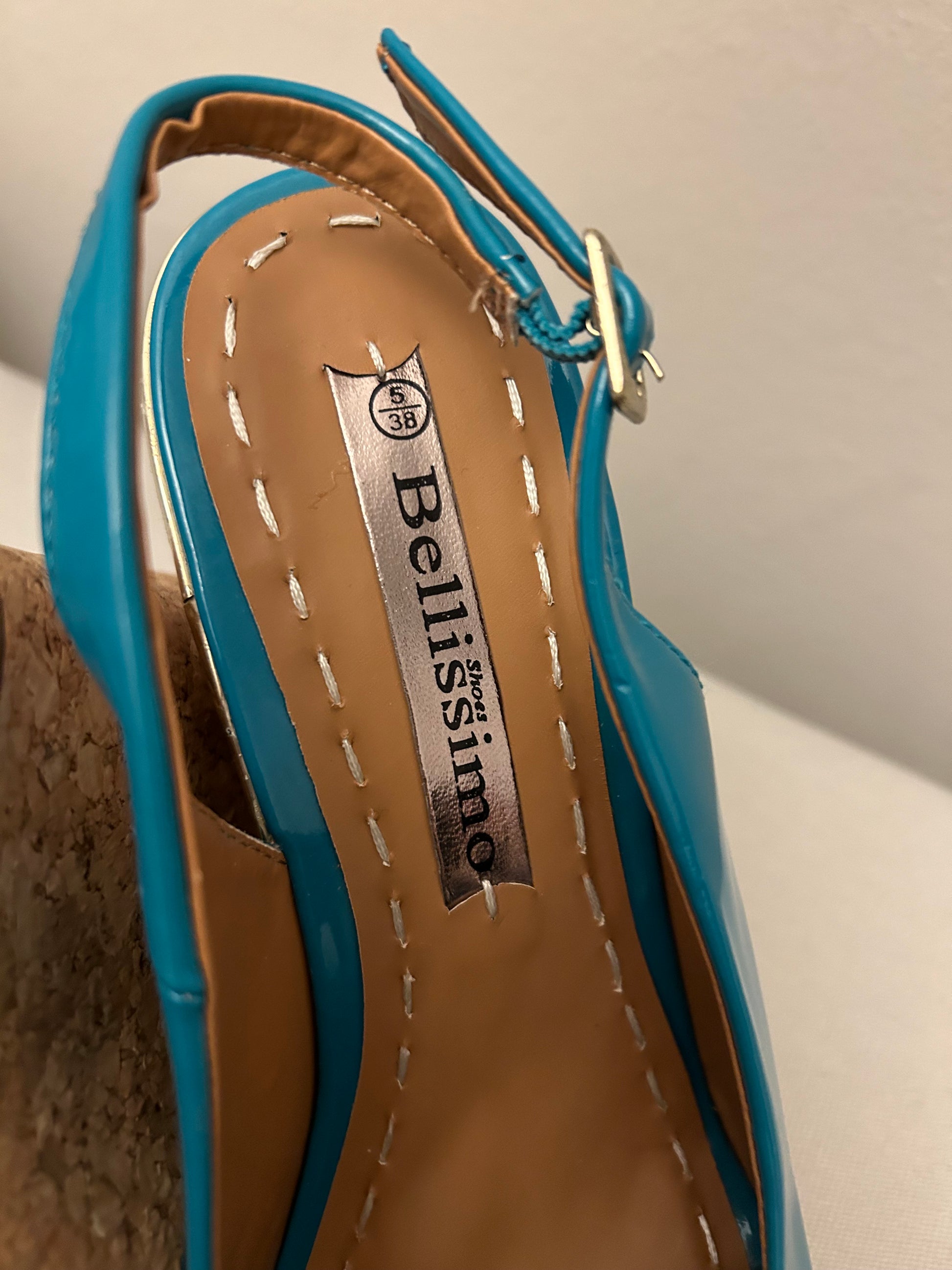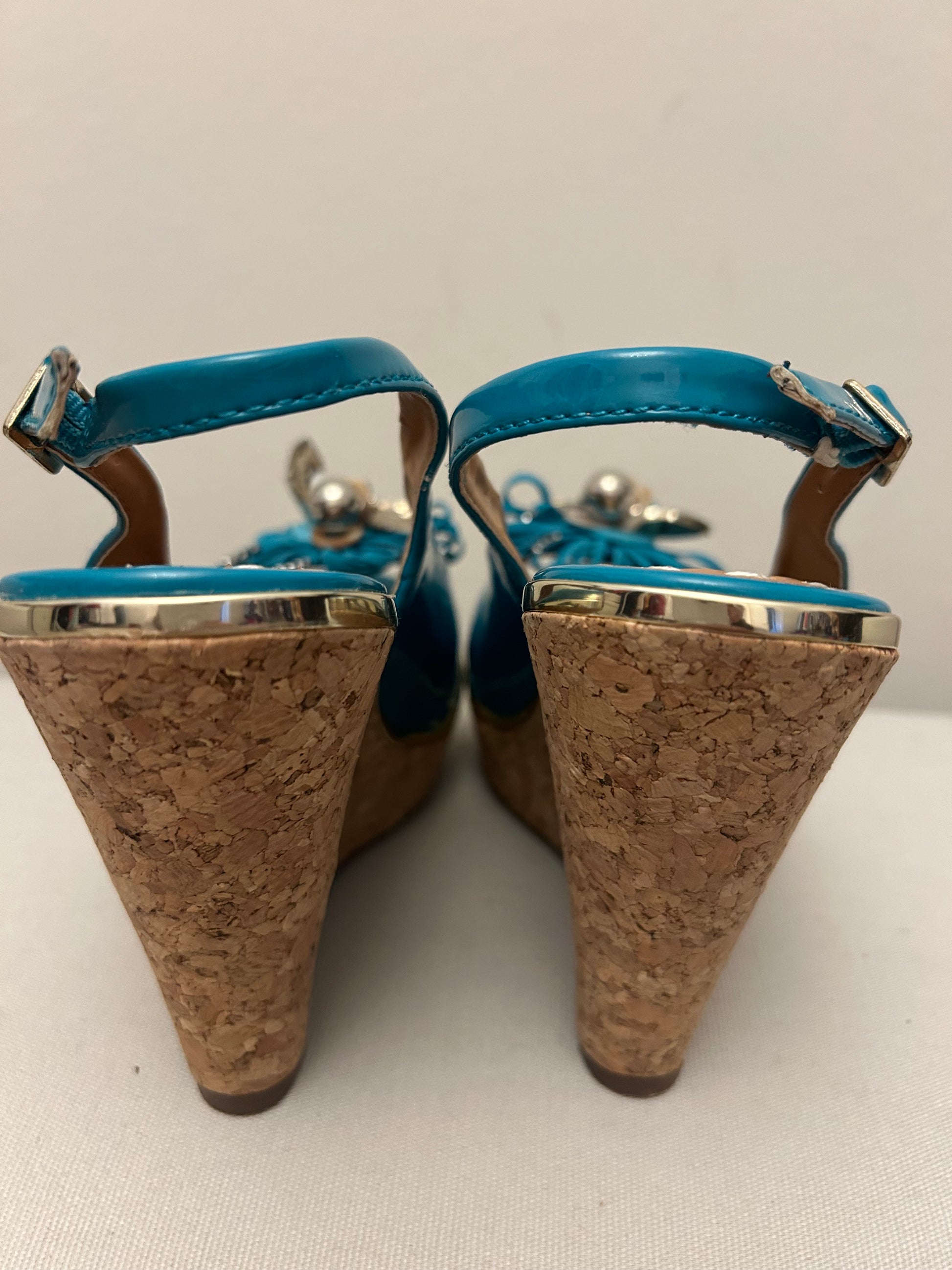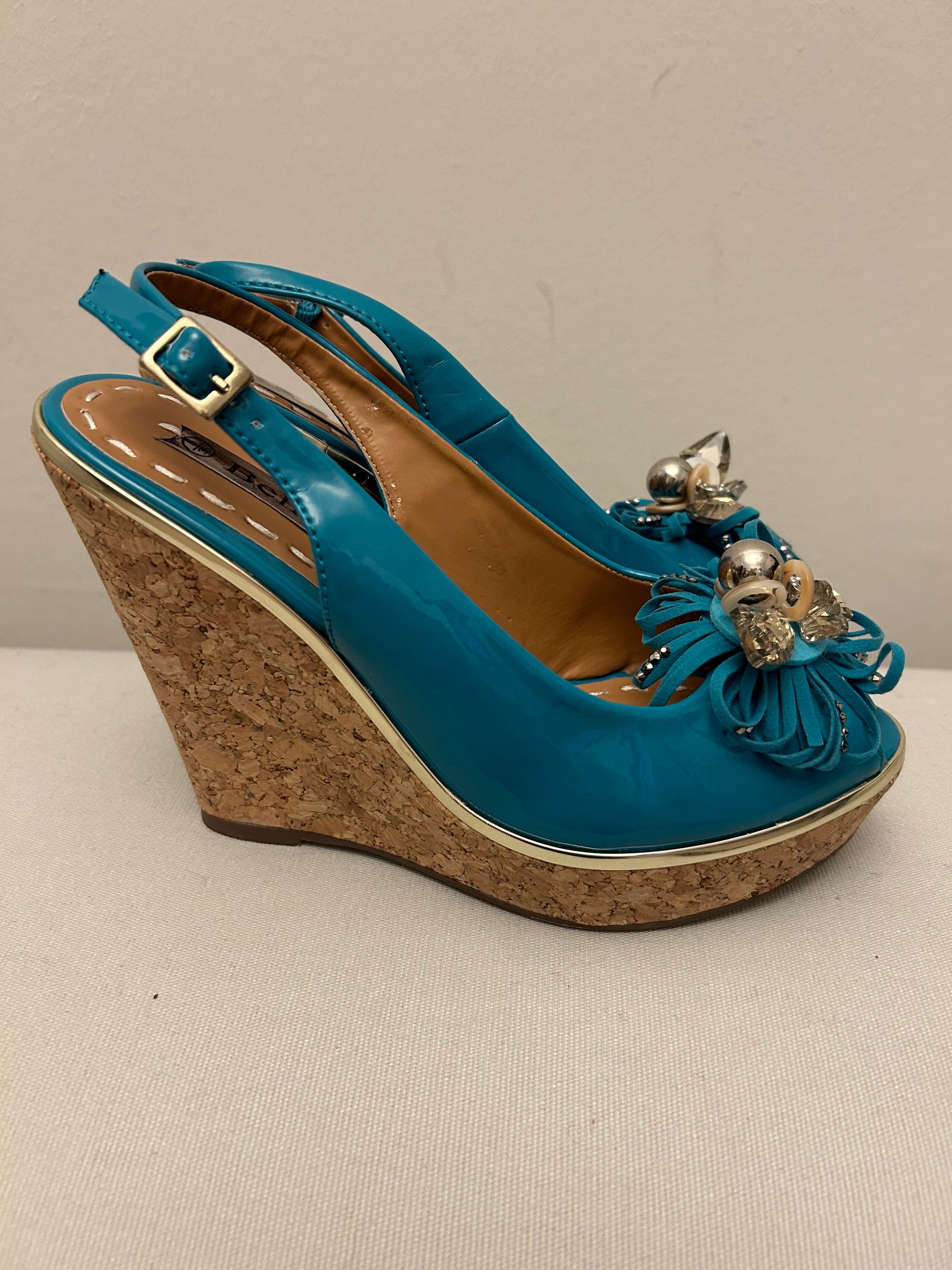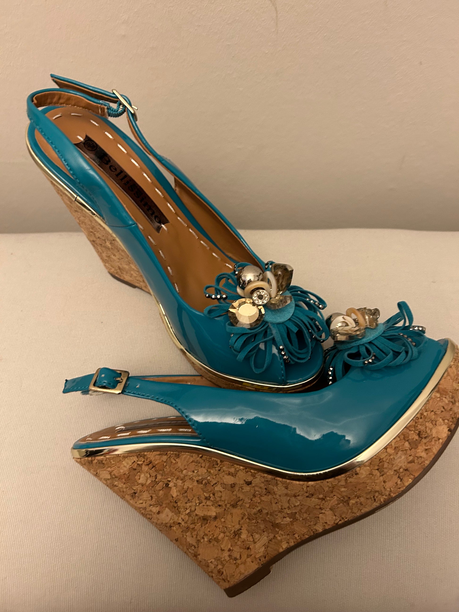 Turquoise Bellissimo Wedges Shoes It’s gold rim. Go.d & Turquoise Flower on front. Peep toe, cork sol with sling back strap.