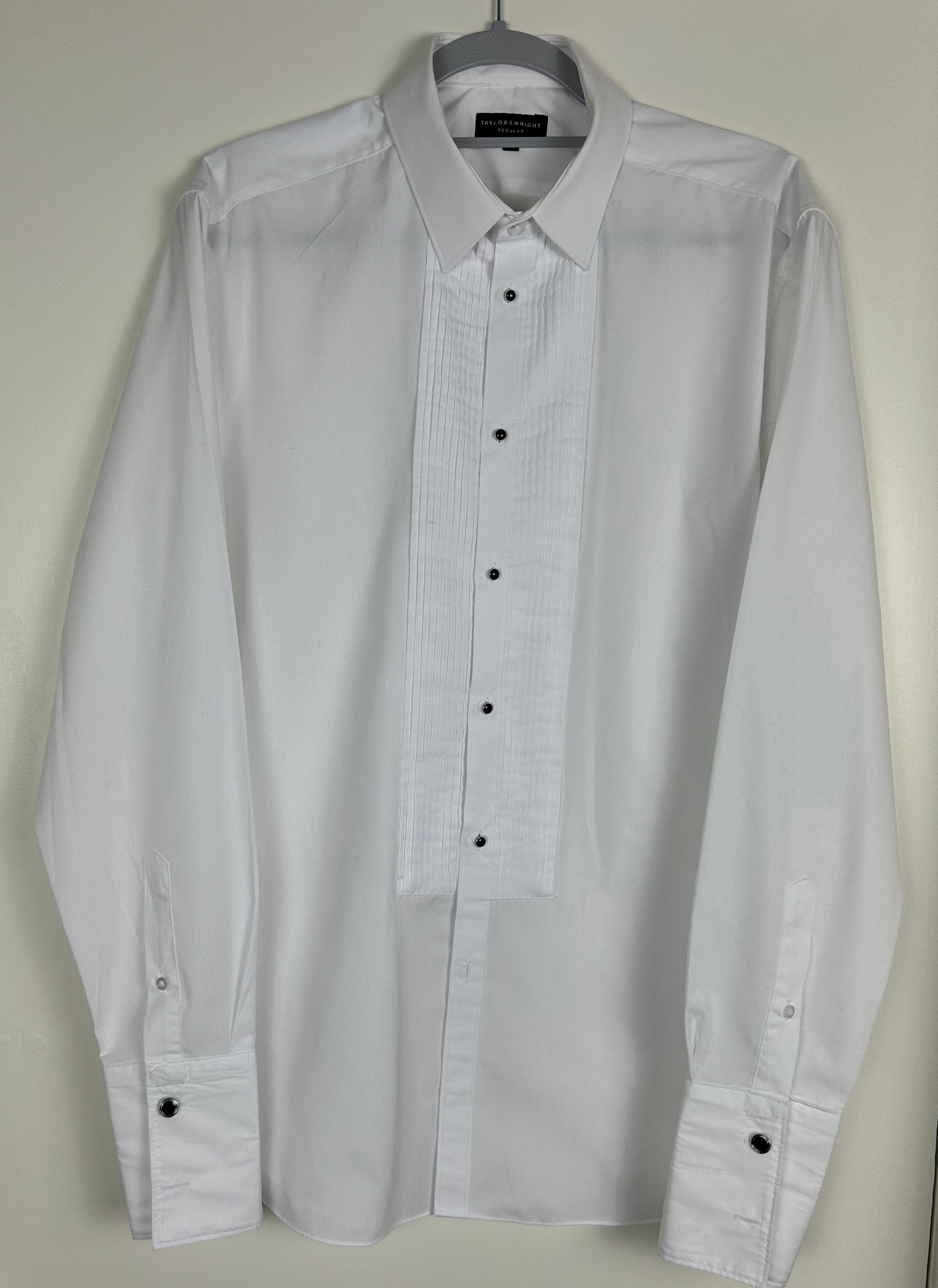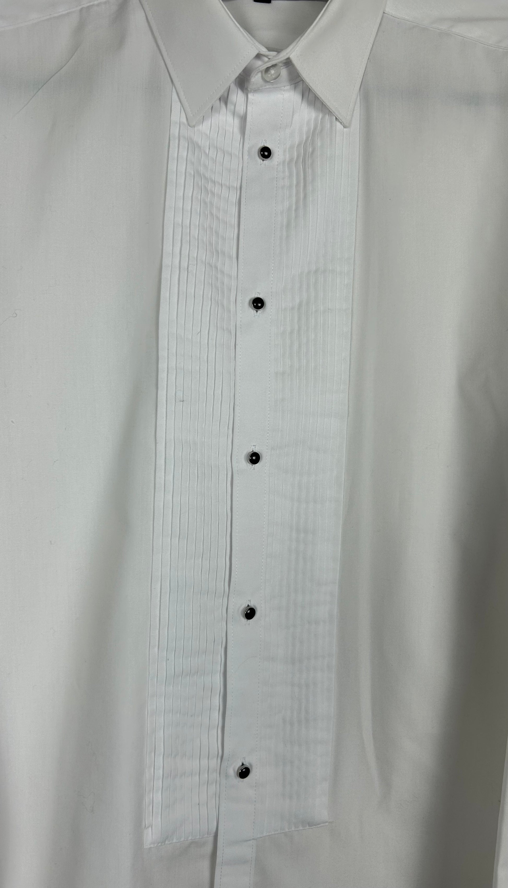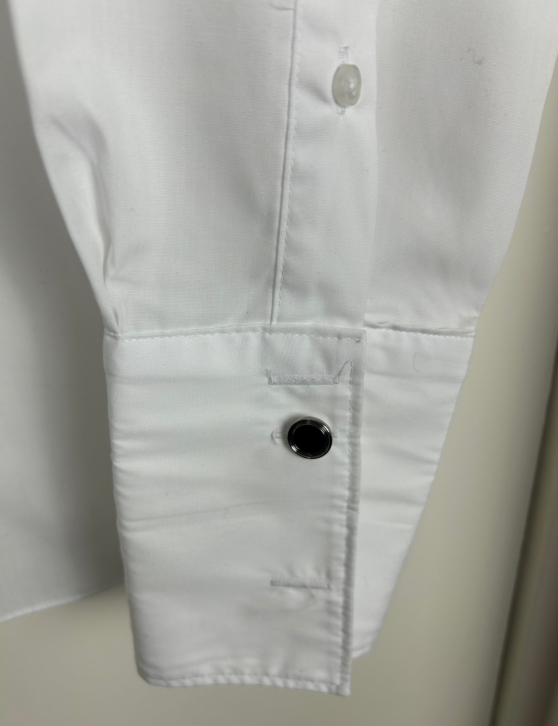 White evening long sleeved shirt with detachable black buttons & cufflinks. Small pleats half way down front. Very bottom button missing (would be tucked, therefore unseen. Material 65% cotton, 35% polyester