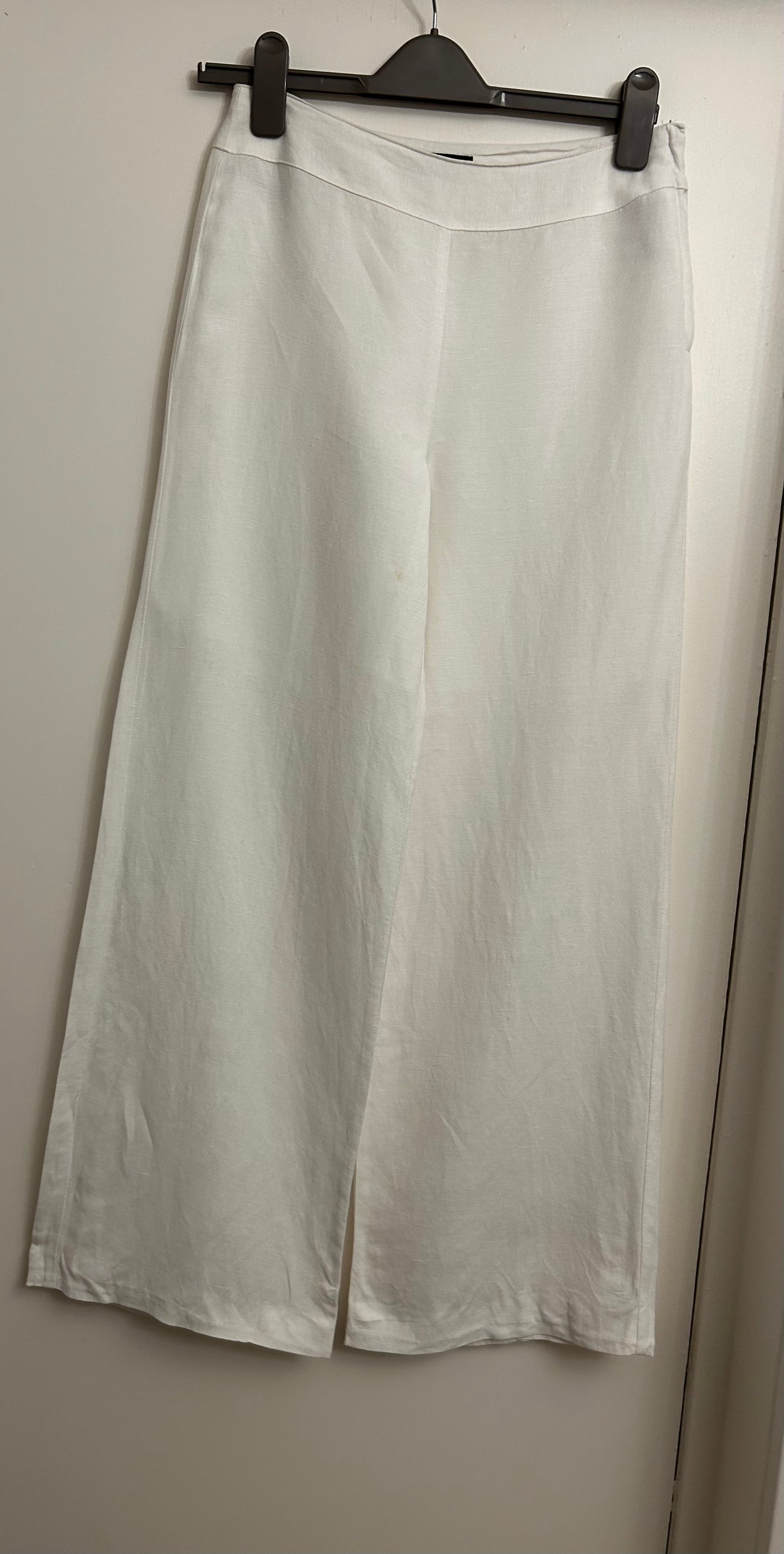 Ladies White Wide Leg Linen Trousers. Side zip fastening