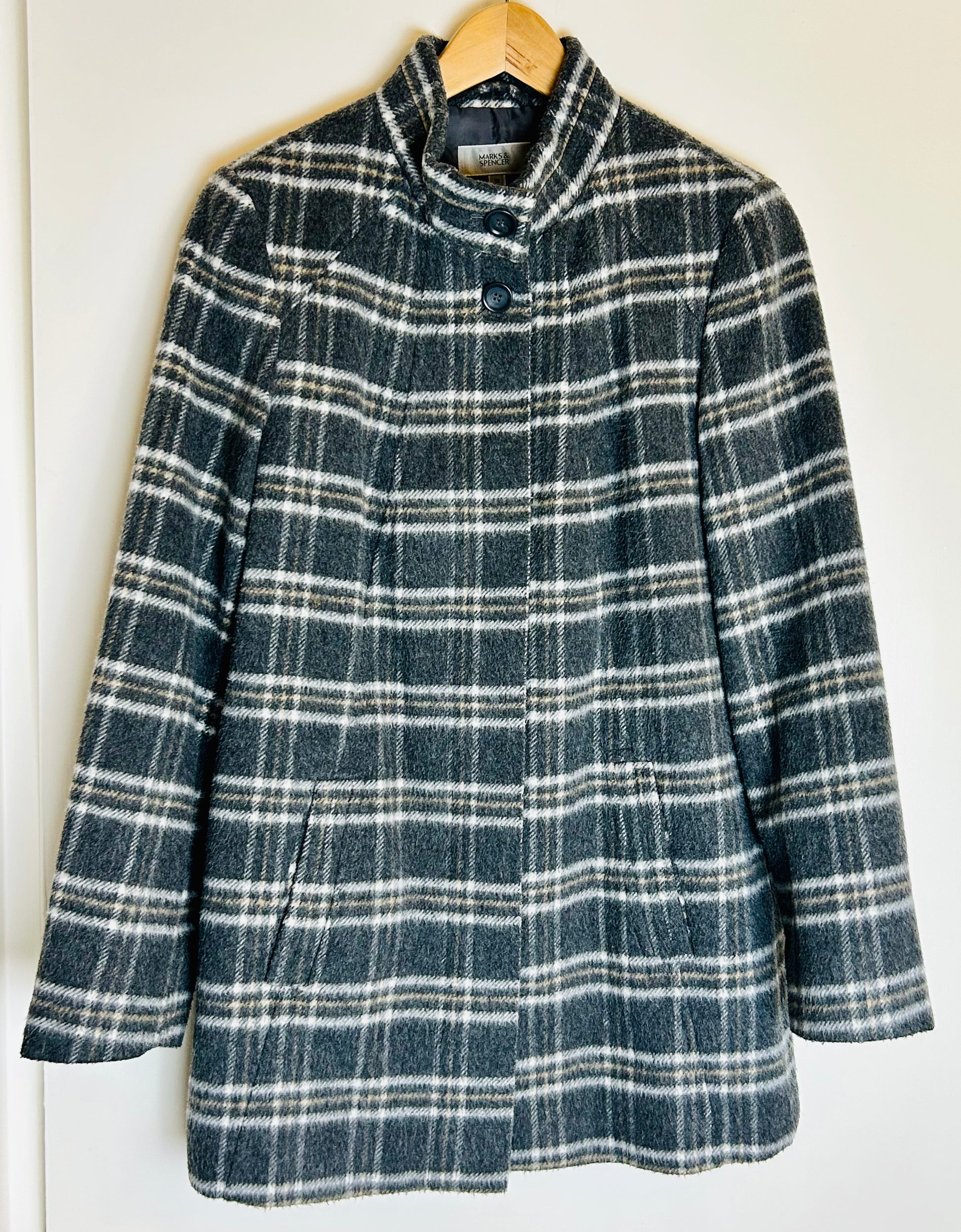 Ladies M&S grey checked long sleeved winter jacket. 3/4 ;length, button front with mandarin collar